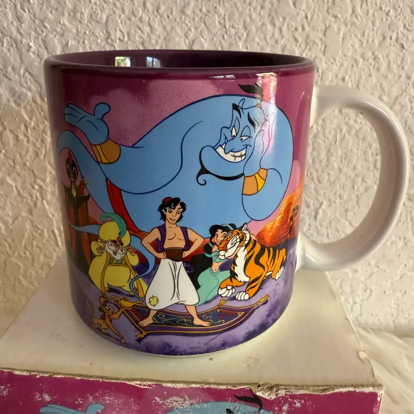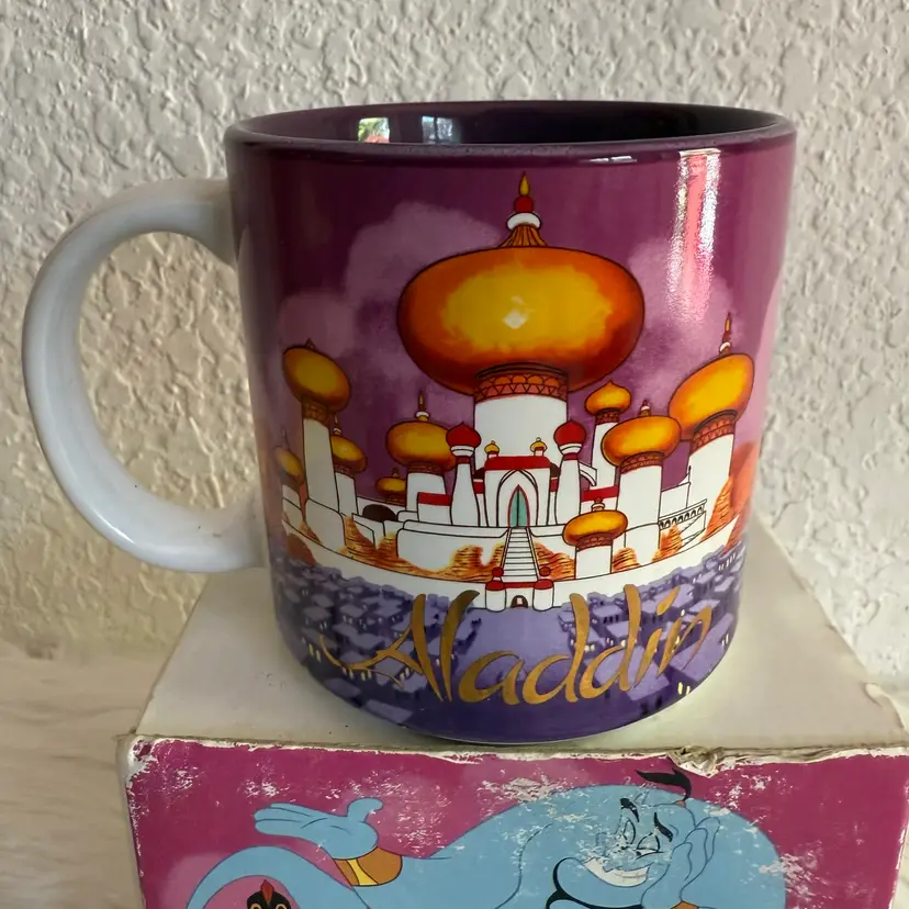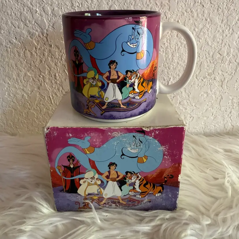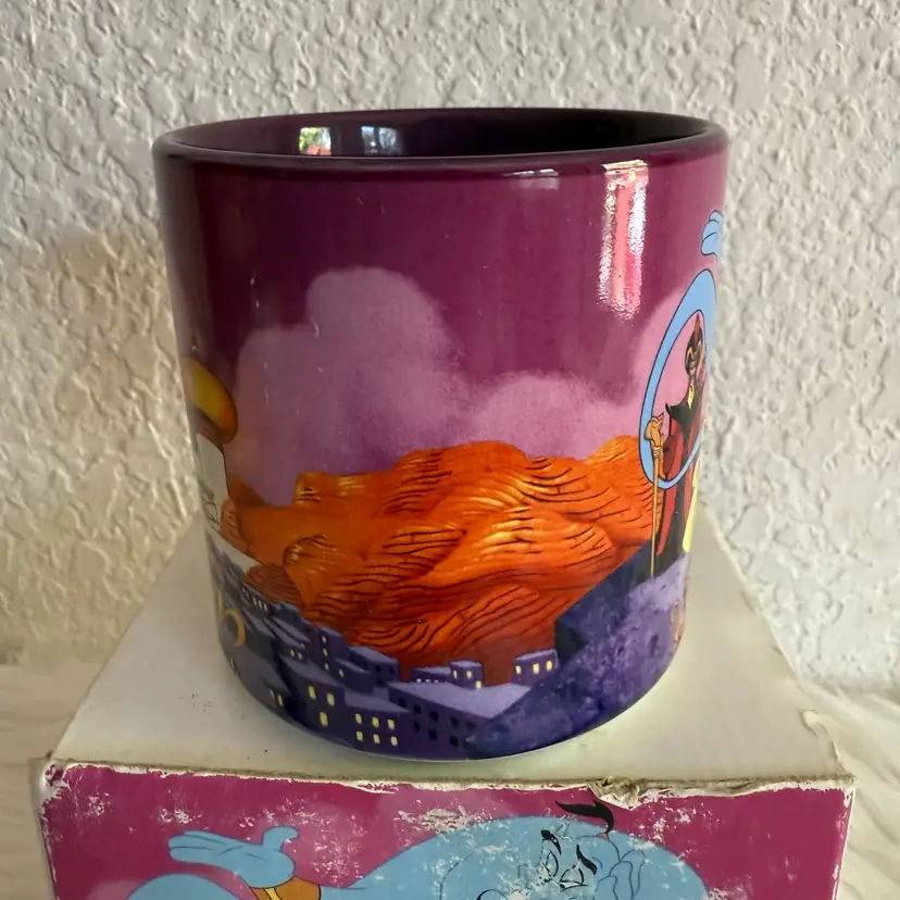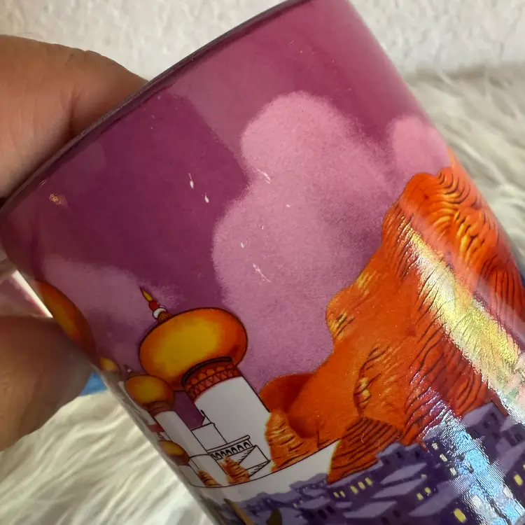 In excellent pre loved Mint condition. Comes with original box. Small paint chip flaws on side of mug, pictured. Mug Measures approx 3.5” tall 3.25” circumference