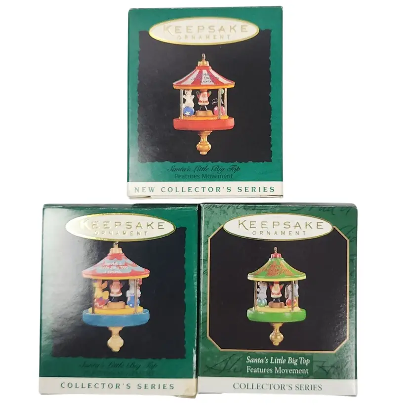 First thru Third of the Santa's Little Big Top Series - Turn the knob at the bottom of the ornament to watch the animals perform. The circus tent canopy reads "Santa's Little Big Top" Includes 1995 QXM4779, 1996 QXM4081, 1997 QXM4152 • Sculpted by Ken Crow • Features moving clown figures in a circus theme • Part of Santa's Little Big Top Collector's Series • MINIATURE Size approx 1 5/8" H New in the original boxes. Original boxes have minor wear due to storage.