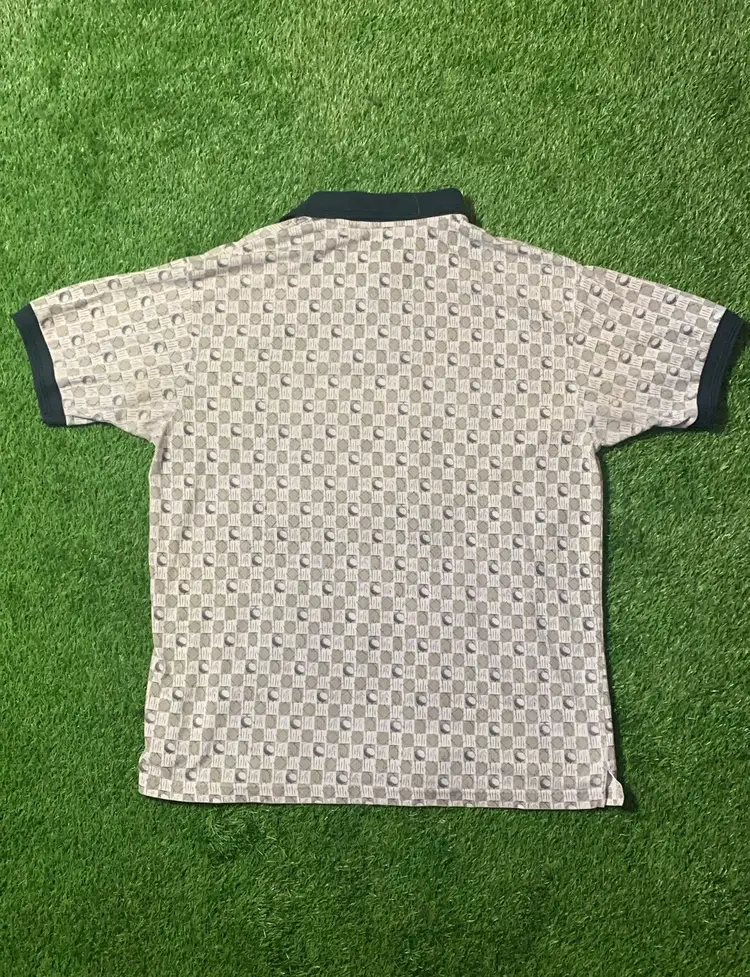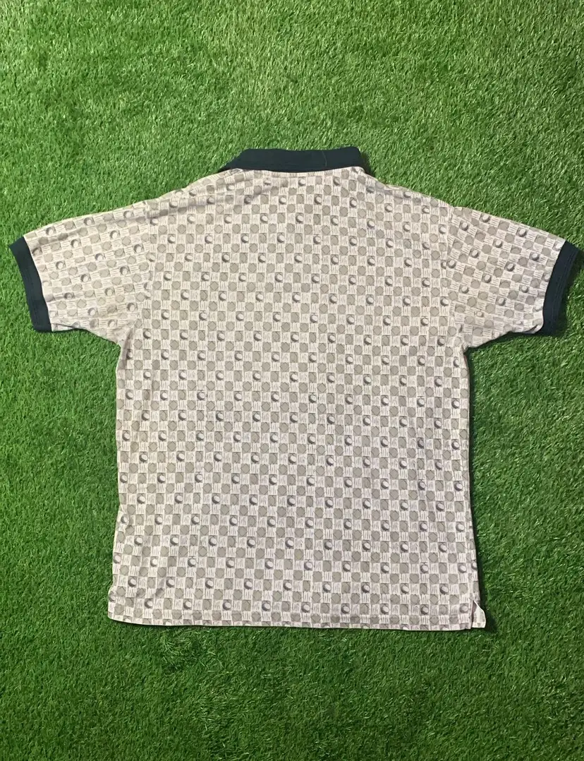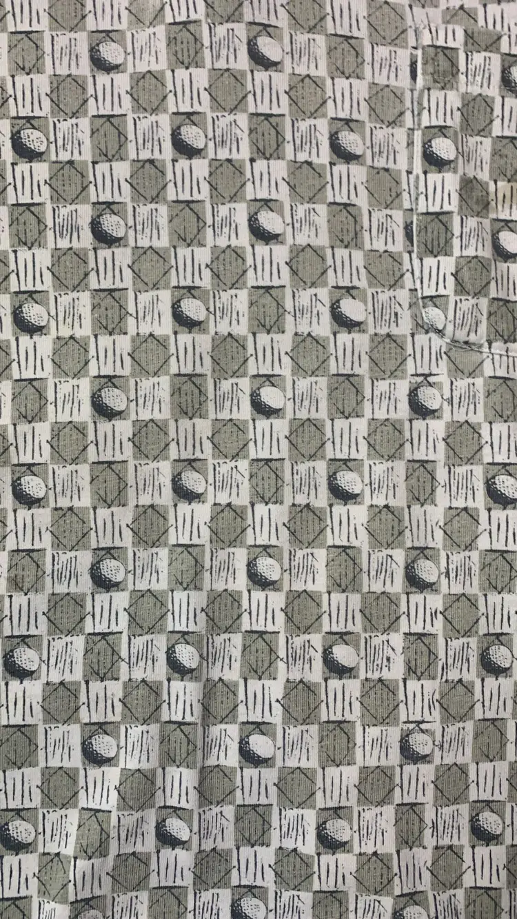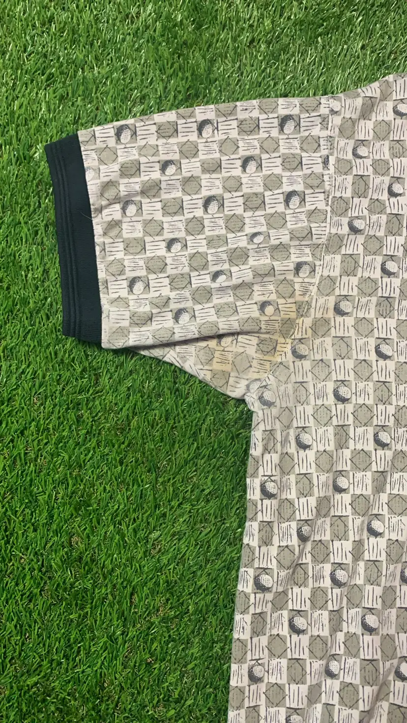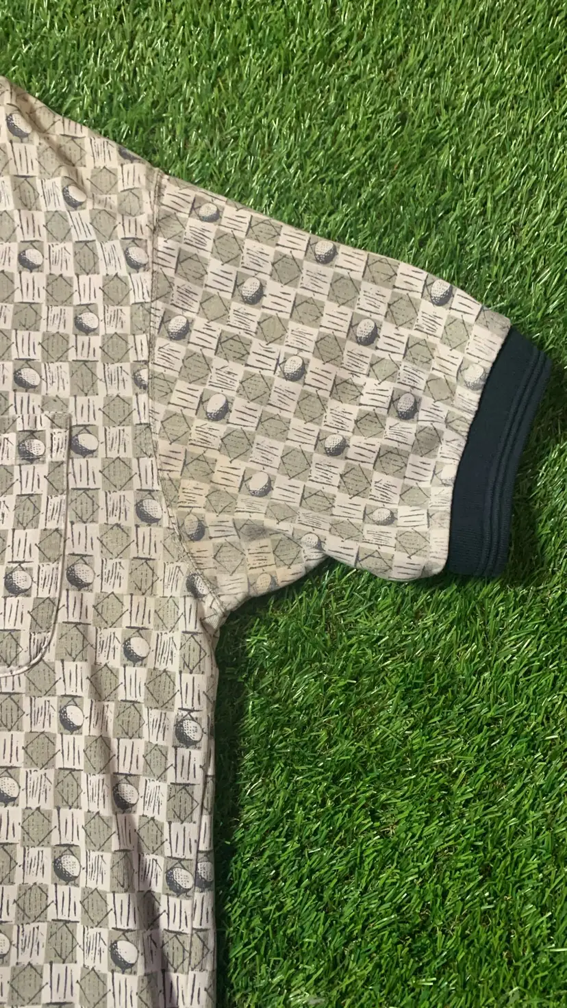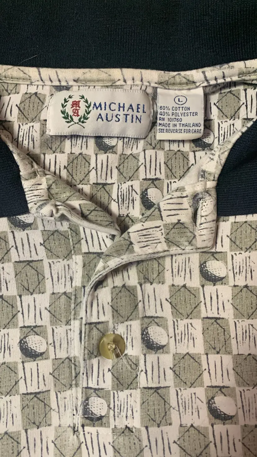 Step onto the green in style with the vintage Michael Austin Men's Polo Shirt, now available in size large—a timeless staple for any golfer’s collection. This shirt boasts an all-over print that channels the bold sports vibe of the '80s and '90s, perfect for those who love a retro twist on the links. Designed with function and flair, this polo features a spread collar, short sleeves, and handy pockets for a practical yet standout look. Please note that this vintage piece shows slight wear, with light discoloring around the armpits, adding to its authentic retro charm.