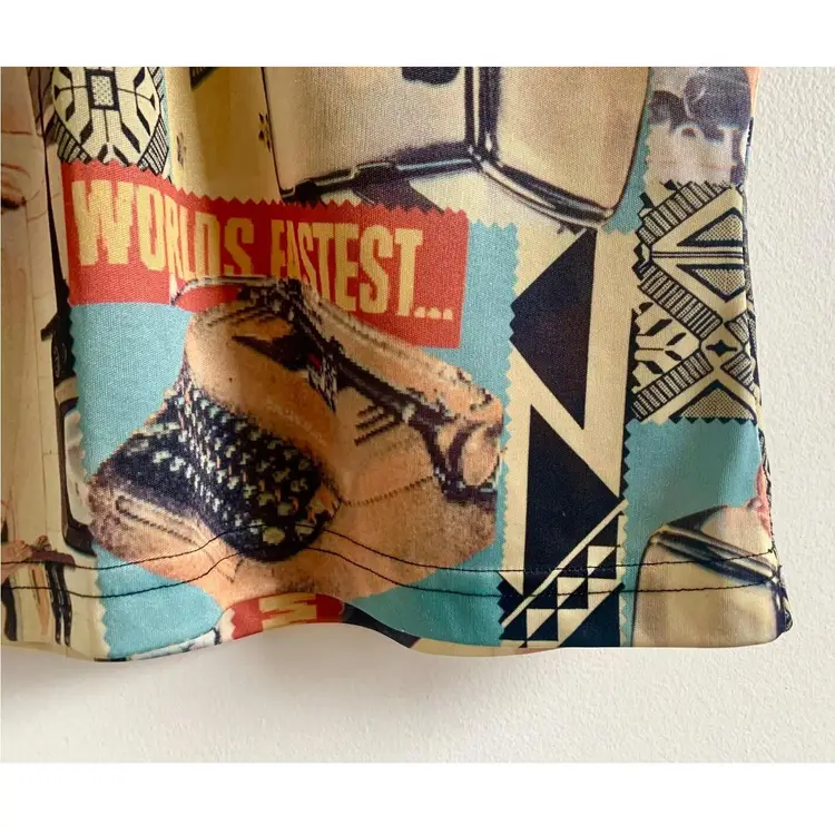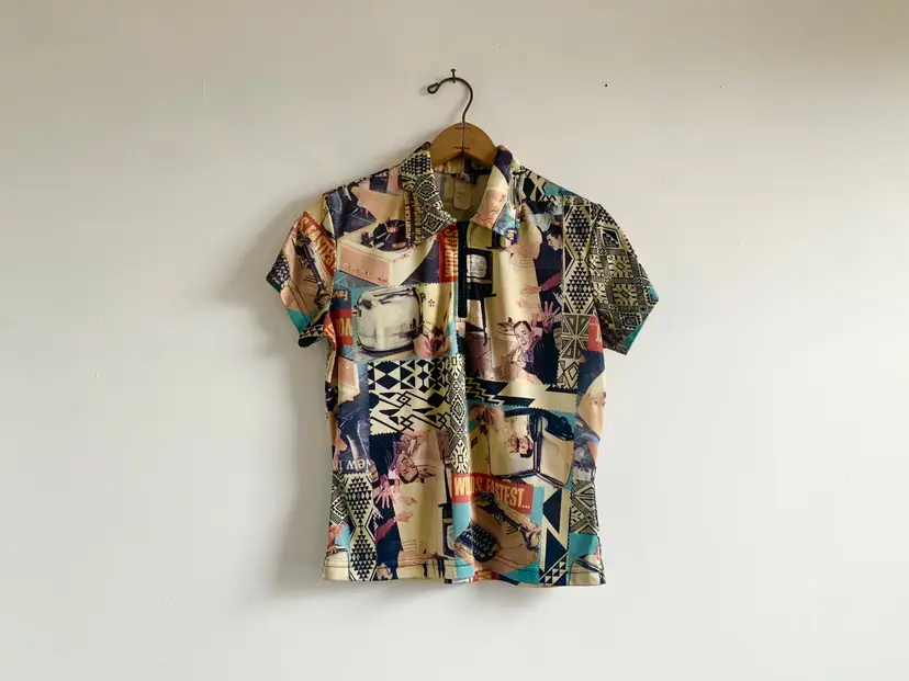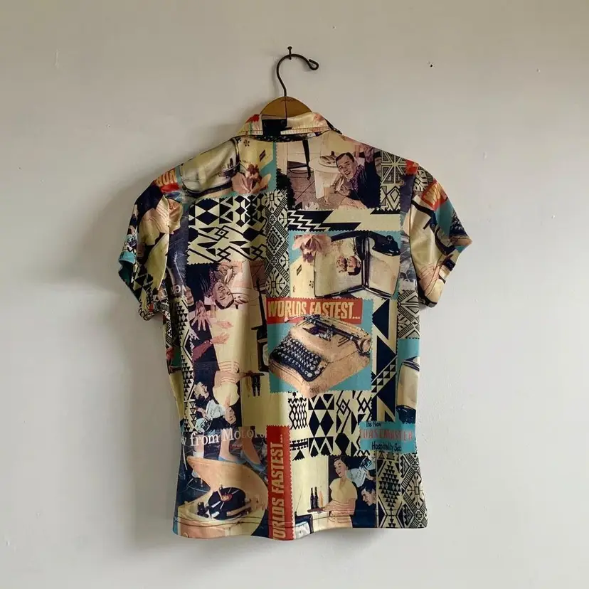 Absolutely baller USA made 90s urban life collage print top. Features very of-the-time zip neckline and collar, a bit of a cap sleeve on 100% polyester. Fabric is slinky and feels similar to nylon. This piece is really incredible. In excellent vintage condition - no flaws! [measurements] Shoulders: 15 in Length: 20 in Chest: 35 in Sleeve: 5 in !Please note! when buying vintage that these items are pre-loved! Isn’t that cute? Most vintage items show signs of wear, which is what makes them so special. I do my best to photograph, note anything visible such as stains, rips or holes in the item description. But please be aware that all vintage items will usually show a few signs of wear or slight fading due to age. I hope to find these unique items their forever homes, so if you have any questions about an item or need guidance with sizing, please contact me! I’d love to help! SHIPPING