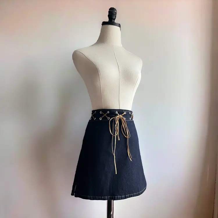 Classic 1990s denim mini skirt by Venus. Features a-line silhouette and corset style detail at the waist with laced leather tie, above-the-knee length. Two-inch slits on the sides and metal zipper closure in the back. Marked a size small but please refer to measurements below for accurate fit. There is plenty of stretch to this piece. Excellent vintage condition! ❊ A-line silhouette ❊ Lace-up detail ❊ Tie waist ❊ Dark wash denim ❊ True mini length [measurements] Waist: 27 in Hips: 35 in Length: 15 n !Please note! when buying vintage that these items are pre-loved! Isn’t that cute? Most vintage items show signs of wear, which is what makes them so special. I do my best to photograph, note anything visible such as stains, rips or holes in the item description. But please be aware that all vintage items will usually show a few signs of wear or slight fading due to age. I hope to find these unique items their forever homes, so if you have any questions about an item or need guidance with sizing, please contact me! I’d love to help! SHIPPING
