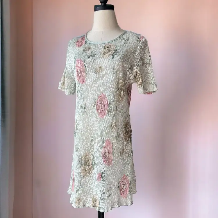 Super gorgeous 90s floral mini. Sheer polyester knit with plenty of stretch and a ruffled hem. You could get weird and go slipless with chunky boots with this baby or class it up with neutral accompaniments. I condone both! Excellent vintage condition. [measurements] bust: 34 in shoulders: 15 in waist: 33 in length: 32 in SHIPPING