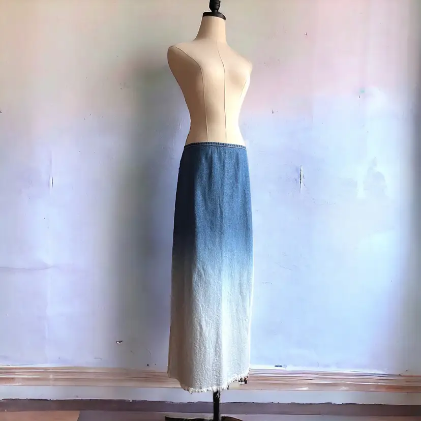 Iconic early late 90s ombre denim maxi skirt. Features killer raw hem ombre bleach dipped effect from mid to light wash. Rocking the low waist, a-line cut. In the back, two darts at the waist make for a fitted hip, slit in the center for easy movement. Metal zip closure. Marked a size 32. Excellent vintage condition! [measurements] Waist: 32 in Hips: 40 n Length: 45 in !Please note! when buying vintage that these items are pre-loved! Isn’t that cute? Most vintage items show signs of wear, which is what makes them so special. I do my best to photograph, note anything visible such as stains, rips or holes in the item description. But please be aware that all vintage items will usually show a few signs of wear or slight fading due to age. I hope to find these unique items their forever homes, so if you have any questions about an item or need guidance with sizing, please contact me! I’d love to help! SHIPPING