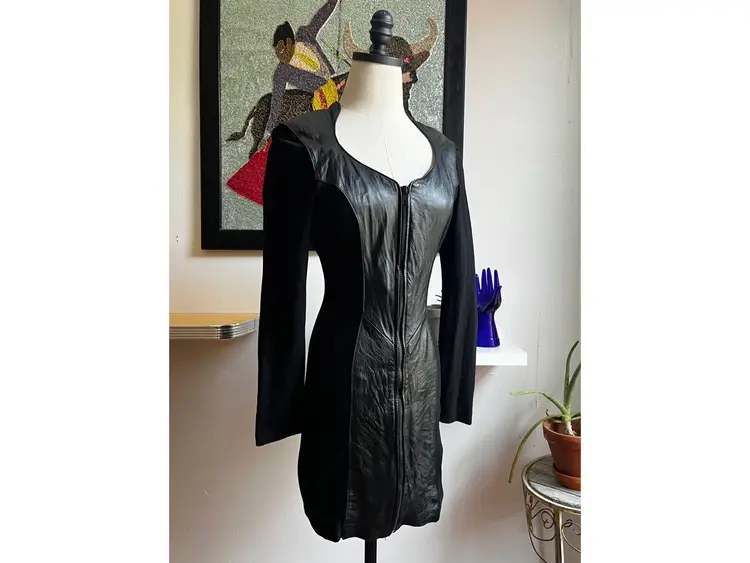 Incredible early 90s Wilsons Leather paneled mini dress. Features bracelet length sleeves, sweetheart neckline, structured shoulders. Metal YKK zipper all the way down the front, leather paneling all the way around. Sleeves and sides are made of a 90% cotton 10% spandex blend that offers a lot of stretch in the waist and hips. Marked a small but very easily and comfortably accommodates a medium - please check measurements below for accurate sizing. Leather panels are lined with nylon so this piece is very comfortable. True above-the-knee length. Just absolute insane rockstar vibes with this dress, it's truly amazing. In excellent vintage condition! [measurements] Shoulders: 15 in Chest: 36 in Waist: 26 - 29 in Hips: 34 - 37 in Sleeve: 23.5 in Length: 32 in !Please note! when buying vintage that these items are pre-loved! Isn’t that cute? Most vintage items show signs of wear, which is what makes them so special. I do my best to photograph, note anything visible such as stains, rips or holes in the item description. But please be aware that all vintage items will usually show a few signs of wear or slight fading due to age. I hope to find these unique items their forever homes, so if you have any questions about an item or need guidance with sizing, please contact me! I’d love to help! SHIPPING
