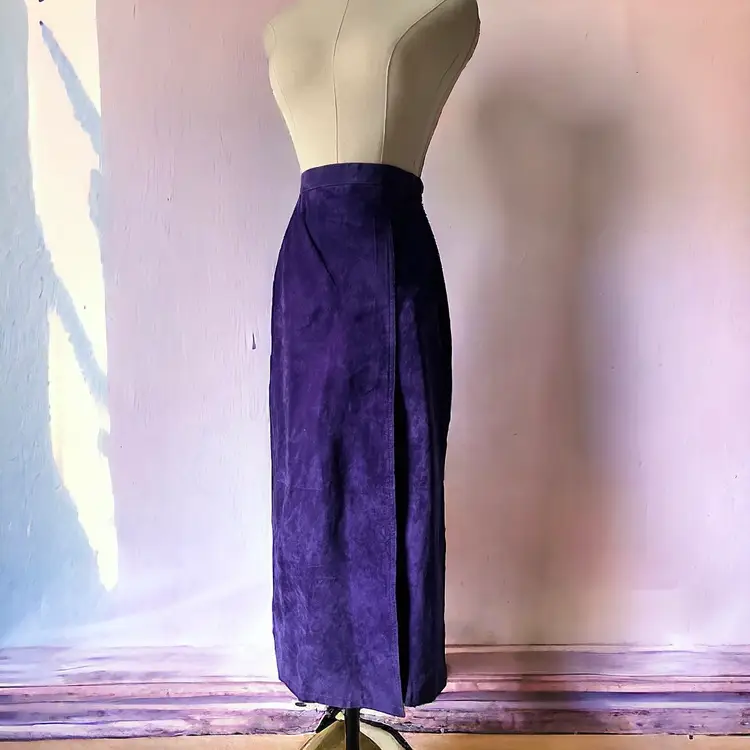 Insane 90s suede maxi skirt by Bagatelle in a gorgeous shade of purple. Features fitted bias cut silhouette, darts around the hips for tailored fit, and 20-inch slit in the front left for easy movement. Single snap button and metal zipper closure in the back. Marked a size 4 but please refer to measurements below for accurate fit. Excellent vintage condition! ❊ Maxi length ❊ 100% genuine leather ❊ Fully lined ❊ Bright eggplant color [measurements] Waist: 25 in Hips: 35 in Length: 33 in !Please note! when buying vintage that these items are pre-loved! Isn’t that cute? Most vintage items show signs of wear, which is what makes them so special. I do my best to photograph, note anything visible such as stains, rips or holes in the item description. But please be aware that all vintage items will usually show a few signs of wear or slight fading due to age. I hope to find these unique items their forever homes, so if you have any questions about an item or need guidance with sizing, please contact me! I’d love to help! SHIPPING