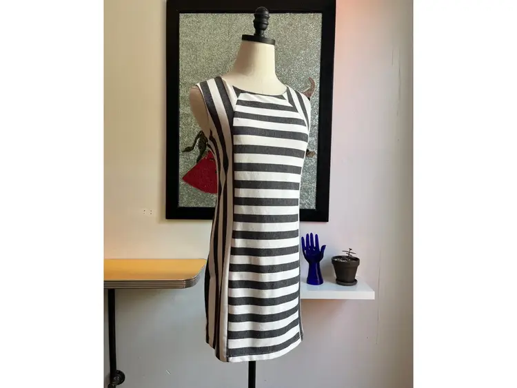 Mod 1990s stripe paneled mini dress. Features contrasting print panels on the sides, fitted sheath cut, high neckline. True above-the-knee mini length. metal talon zipper closure in the back Very soft 90% cotton 10% spandex blend that offers a few inches of stretch. No size or brand tags - please refer to measurements for accurate sizing. In excellent vintage condition! [measurements] Shoulders: 15 in Chest: 32 in Waist: 28 in Hips: 34 in Length: 30.5 in !Please note! when buying vintage that these items are pre-loved! Isn’t that cute? Most vintage items show signs of wear, which is what makes them so special. I do my best to photograph, note anything visible such as stains, rips or holes in the item description. But please be aware that all vintage items will usually show a few signs of wear or slight fading due to age. I hope to find these unique items their forever homes, so if you have any questions about an item or need guidance with sizing, please contact me! I’d love to help! SHIPPING