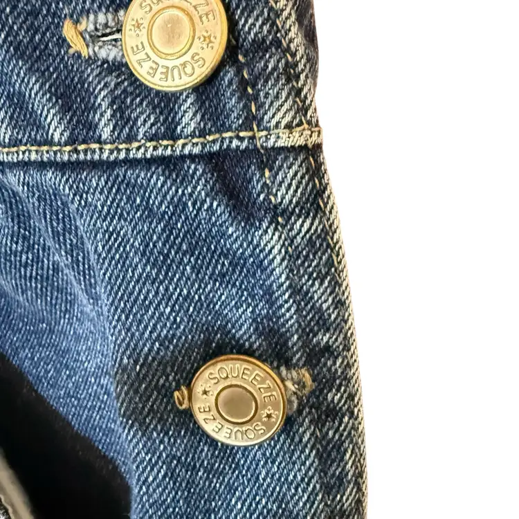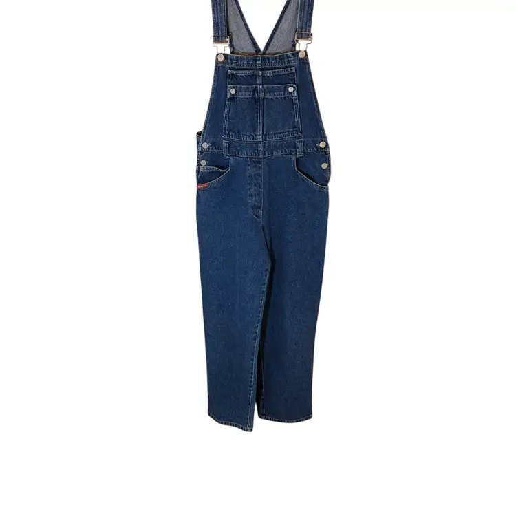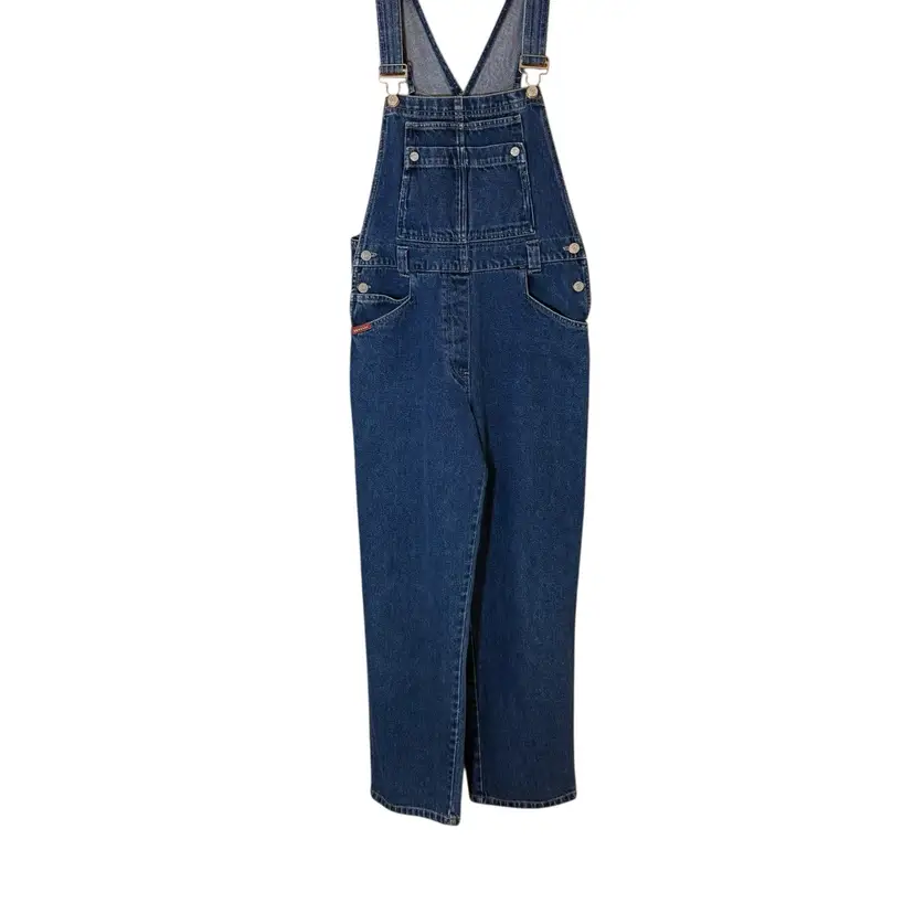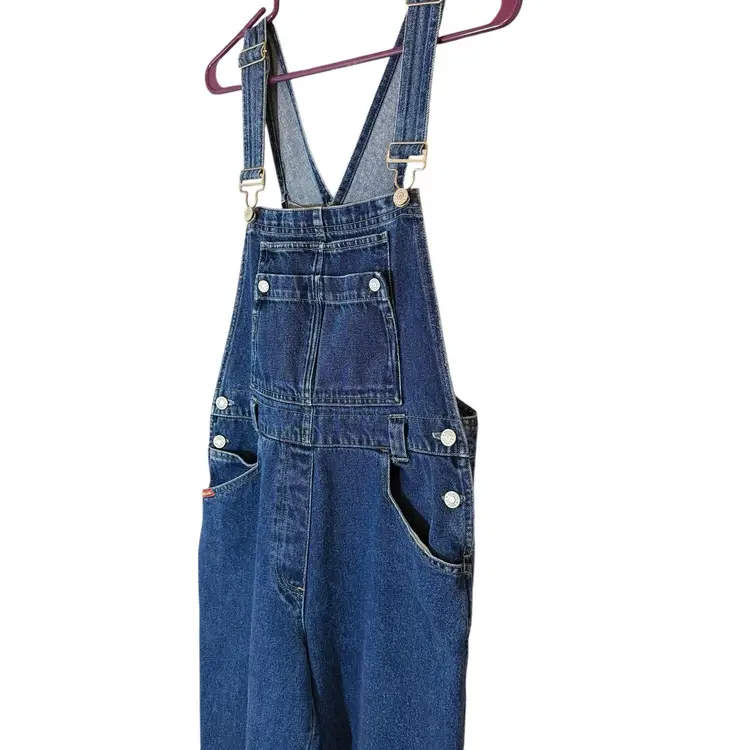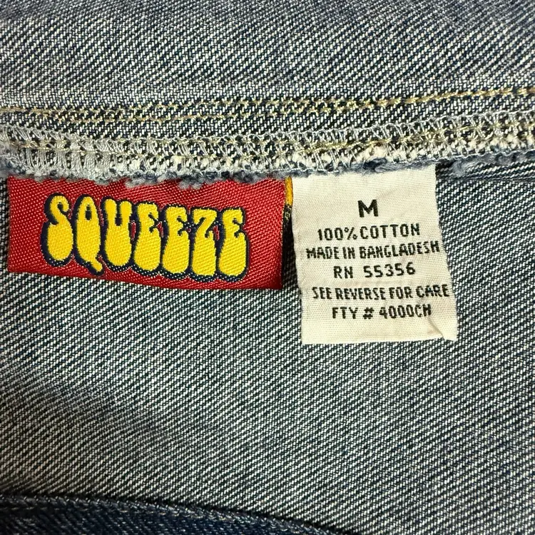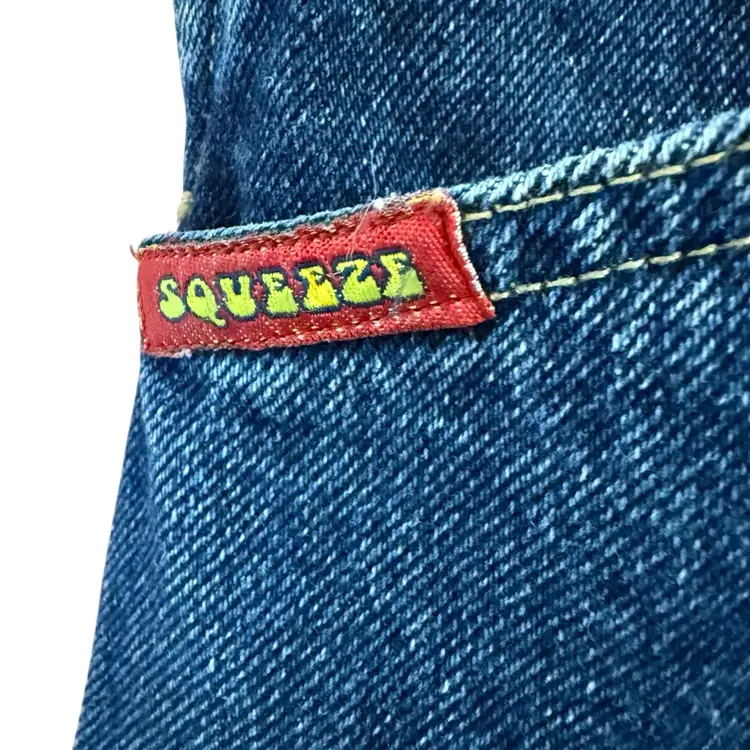 The product is a pair of 90's Y2K Squeeze Jeans Blue Denim Overalls in a women's size medium. These overalls are vintage from the 1990s with a grunge look, made of 100% cotton material. The medium blue wash, straight leg and original style make them a great addition to any casual outfit, perfect for those looking for a retro and unique fashion statement. Made in Bangladesh, these overalls offer a piece of nostalgia from the grunge era.