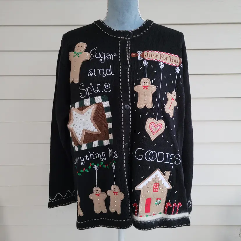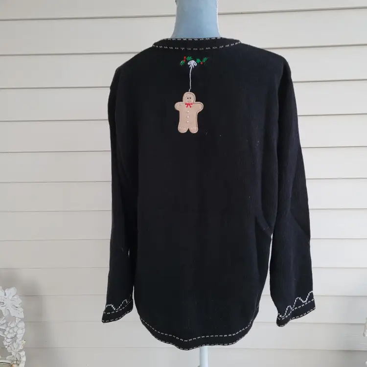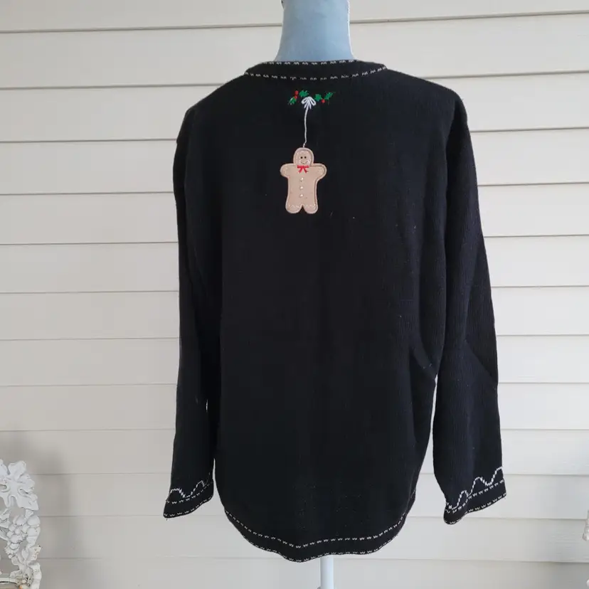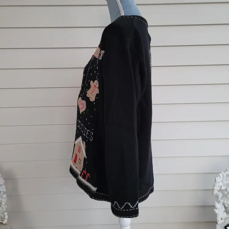 This super cute cardigan sweater is from The Quacker Factory. It is tagged a large but fits big. Materials are 55% Ramie, 45% Cotton decoration, 56% Nylon, 40% Angora rabbit hair, and 4% Lambswool. It has a Christmas holiday theme featuring gingerbread cookies. Main color is black.