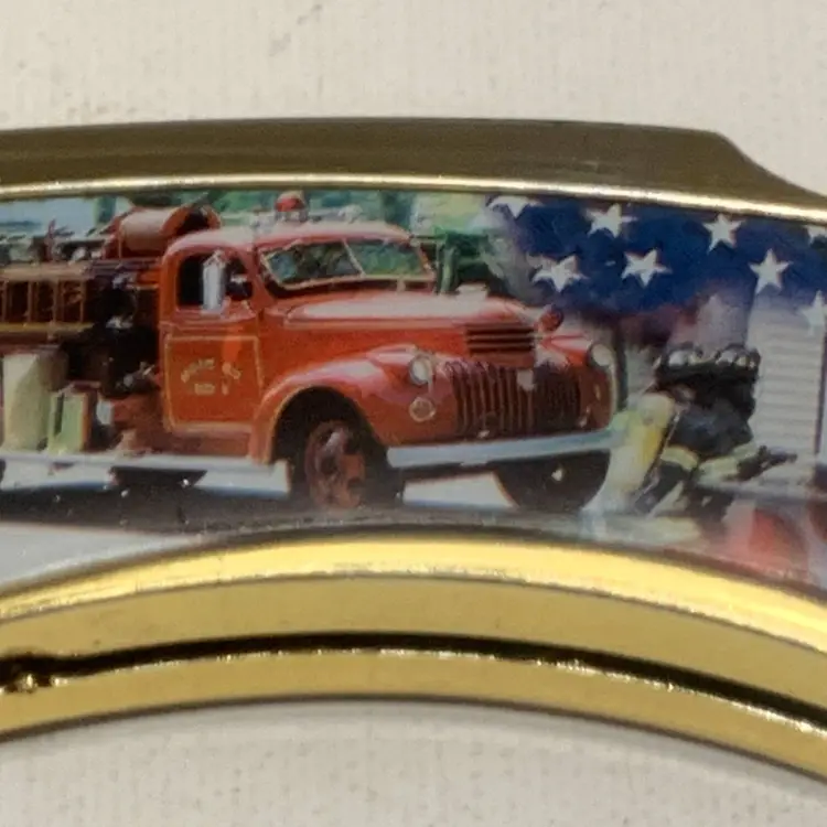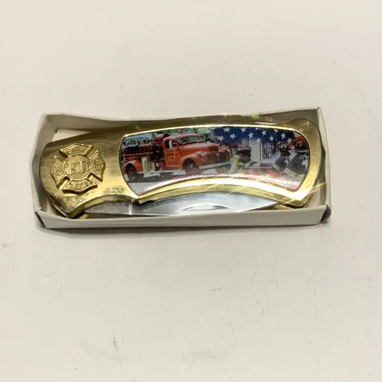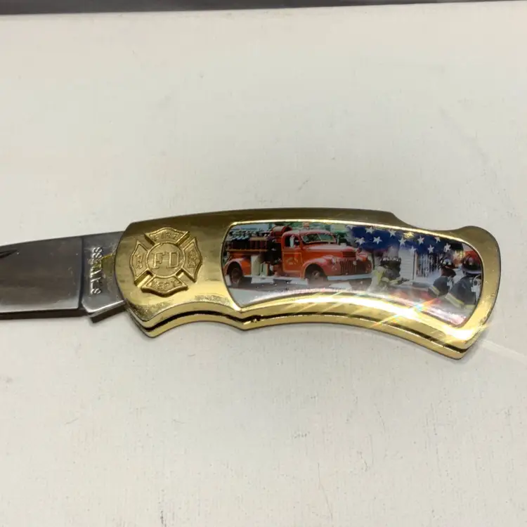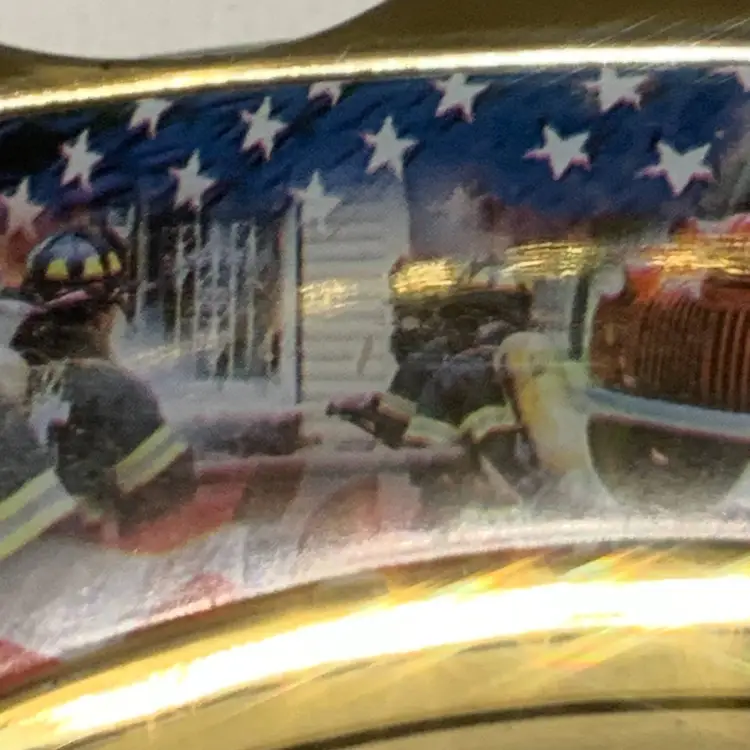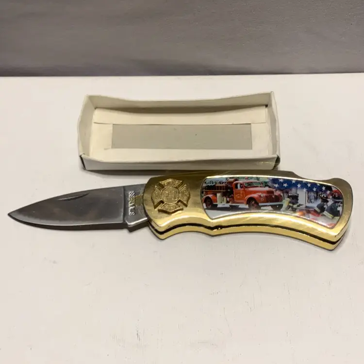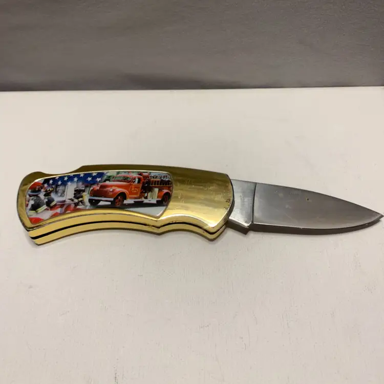 This Pre Owned 9/11 Memorial Commemorative Folding Knife is a classic pocketknife with a stainless steel blade, measuring between 2.76 - 4 inches. This ambidextrous knife features a manual opening mechanism and a lock back design for safety. The multi-color handle and drop point blade edge make it a unique and original collectible item for knife enthusiasts.