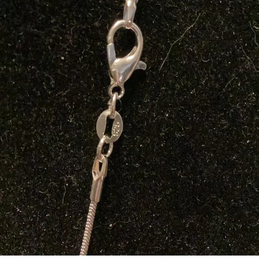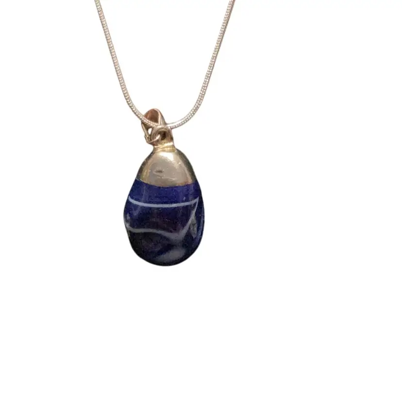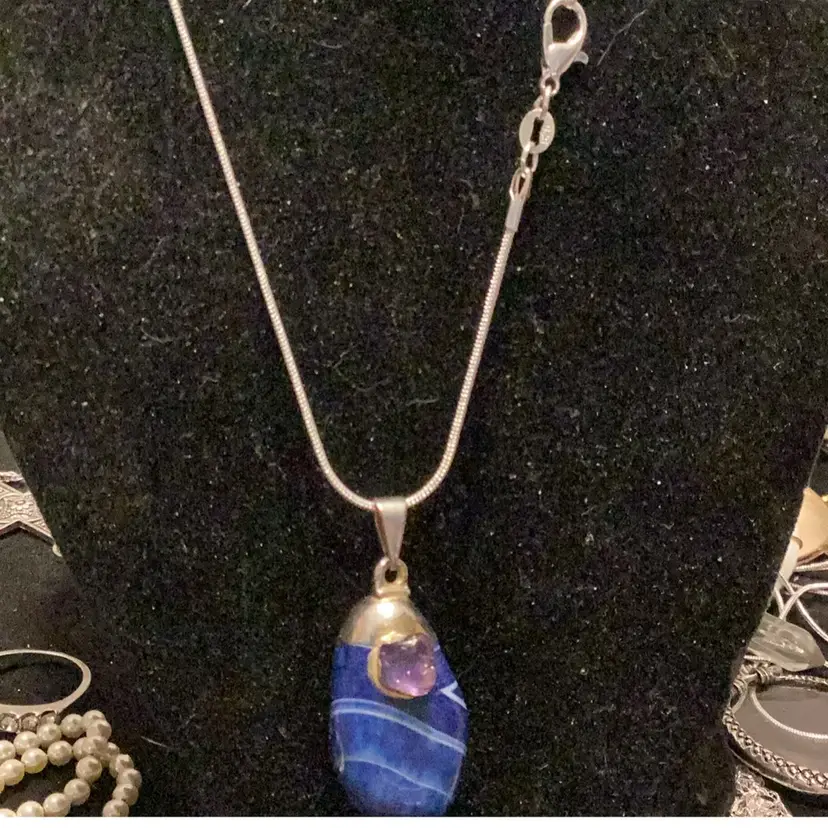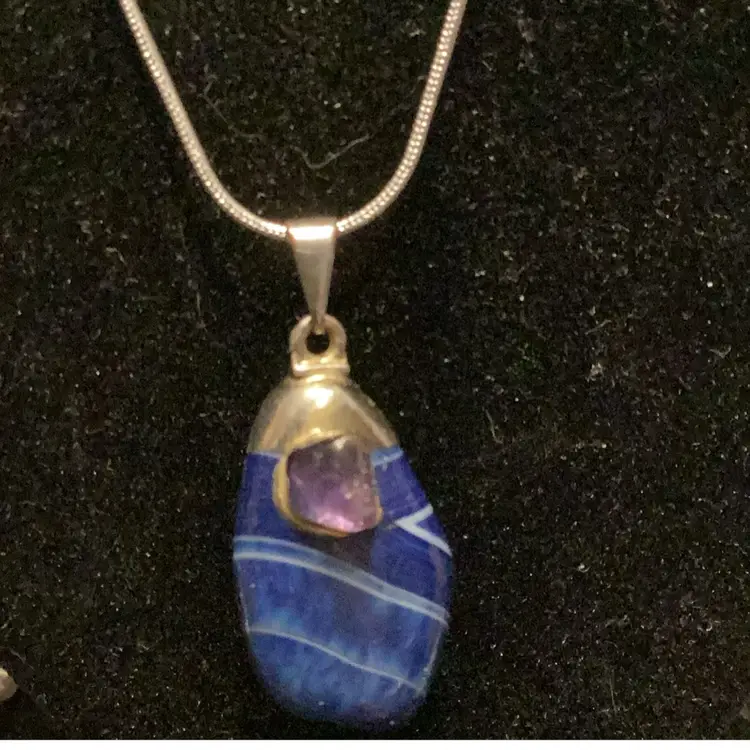 Blue swirling stone made into a pendant with a purple amethyst stone attached silver this is 925. This is a really nice piece. Handmade not find me but it is handmade and it’s elegant a must have for someone who likes stones.