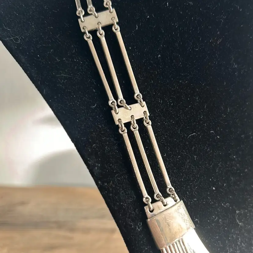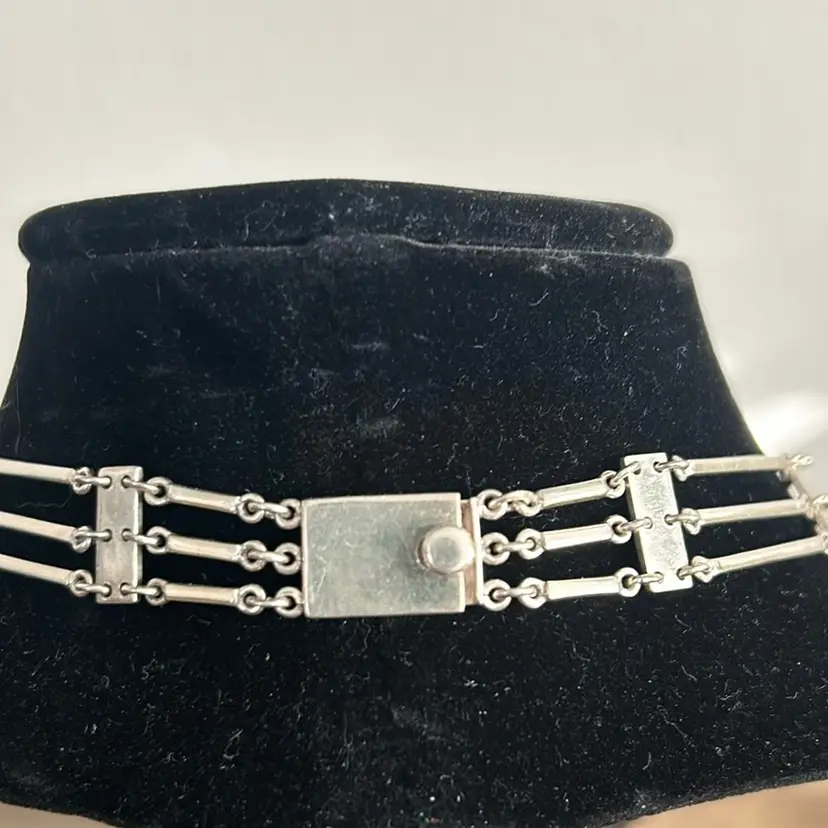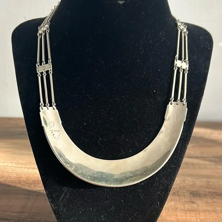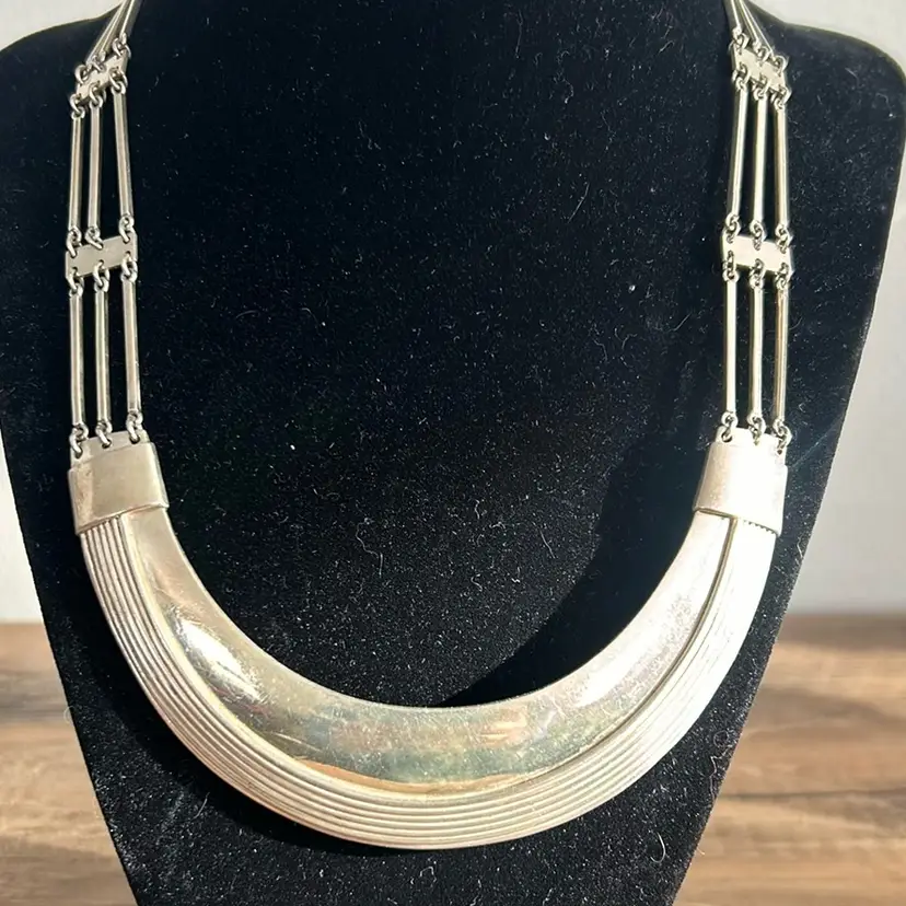 Erika Hult de Corral stunning sterling necklace measures approximately 9” long while clasped. The large collar shape is 5” wide and 1” thick at center most point. Three strand chain