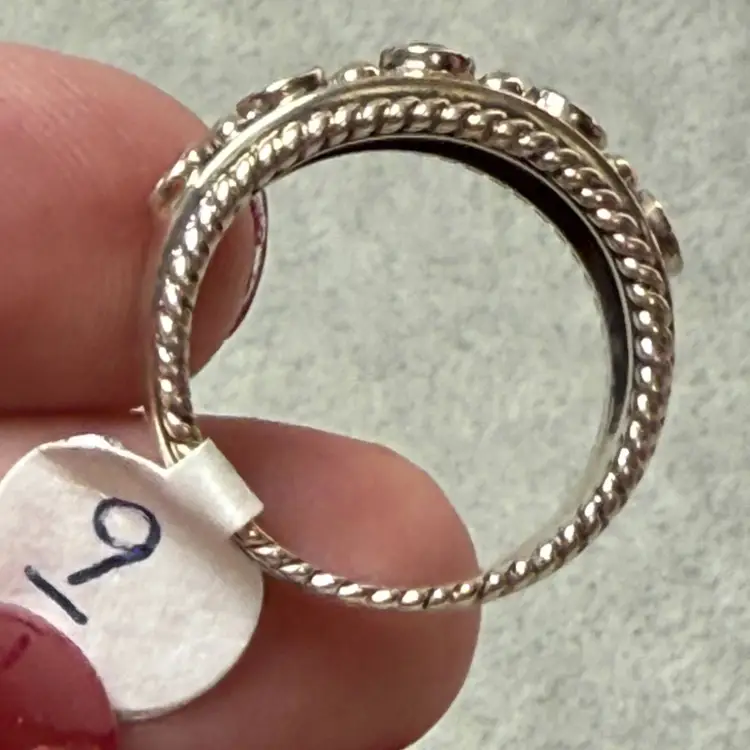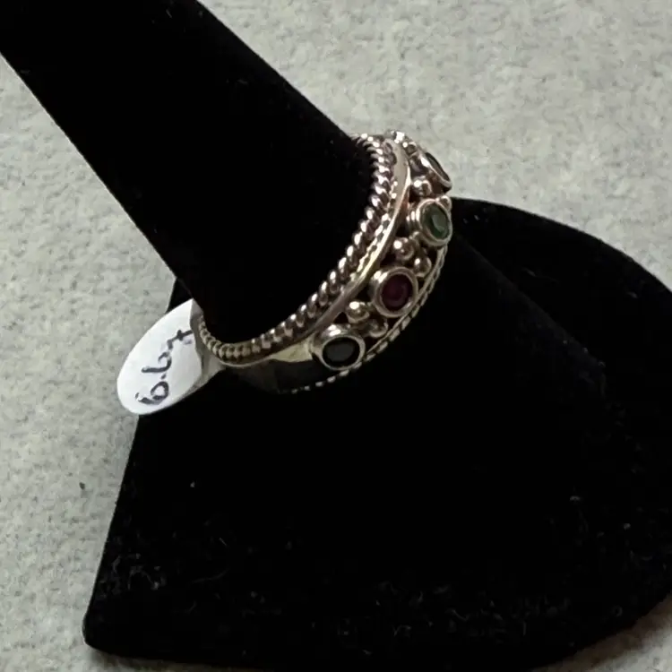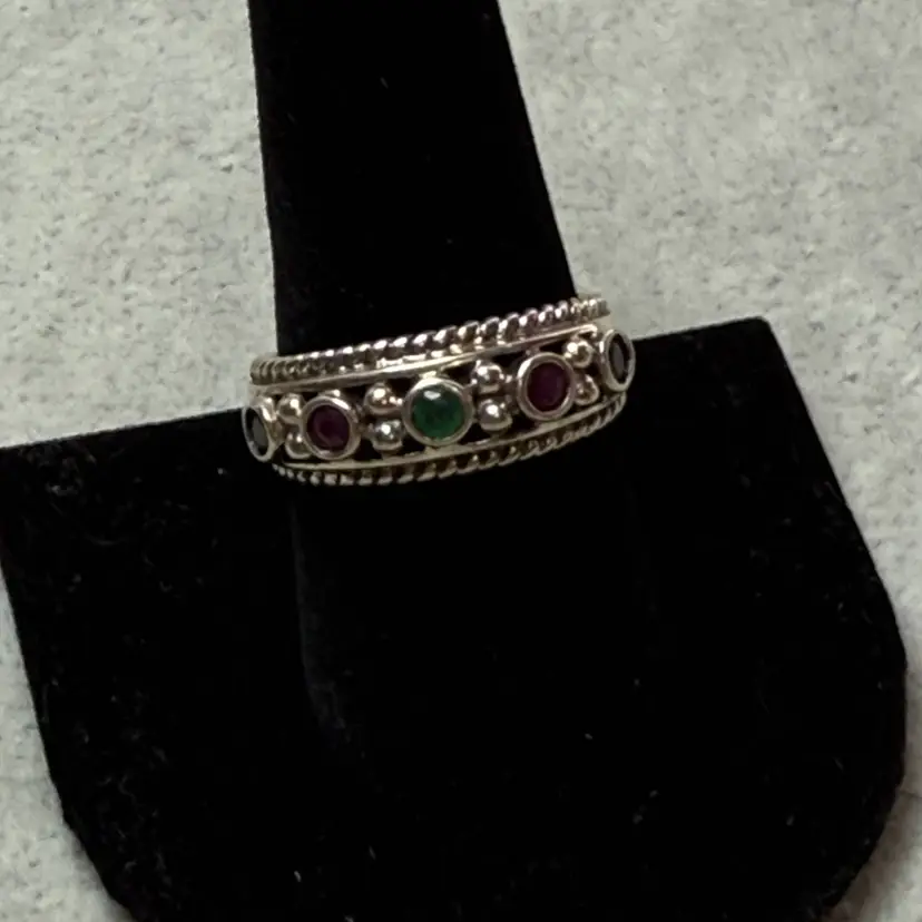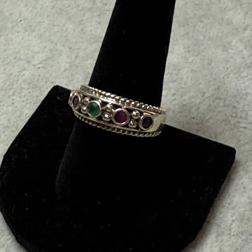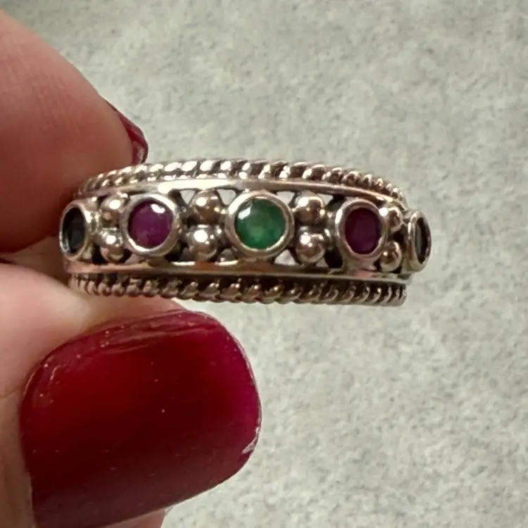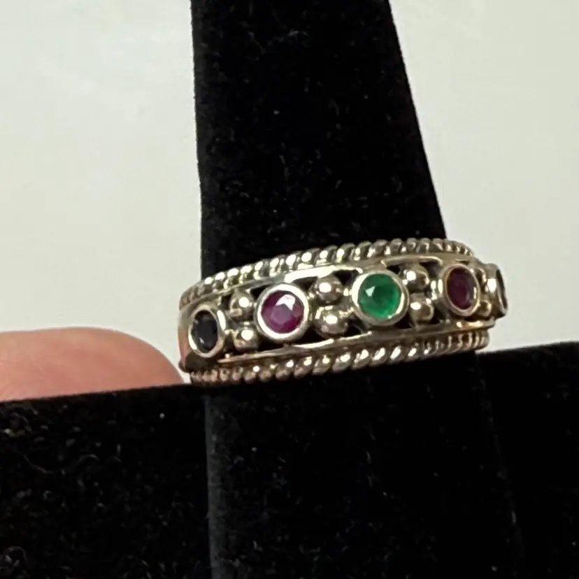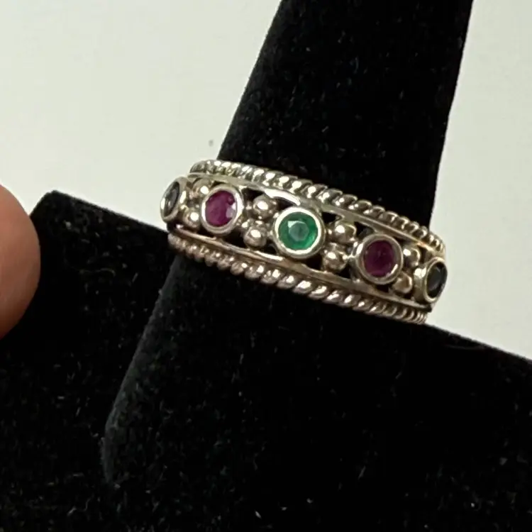 925 Sterling Silver Band Ring Ruby Emerald & Sapphire Beaded Rope Border Size 9. Genuine gemstones. Hallmarked. Great condition. No missing stones. Tag still attached. Total gem weight about .52ctw. Silver 6.67 grams.