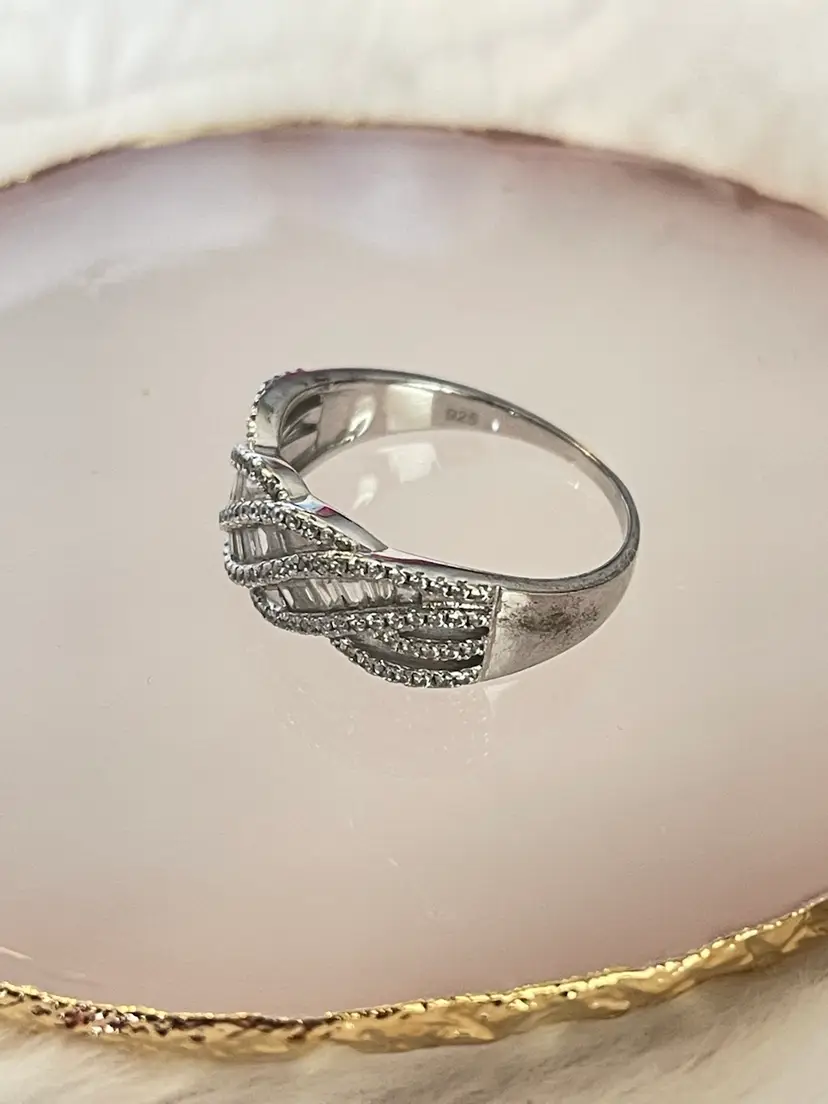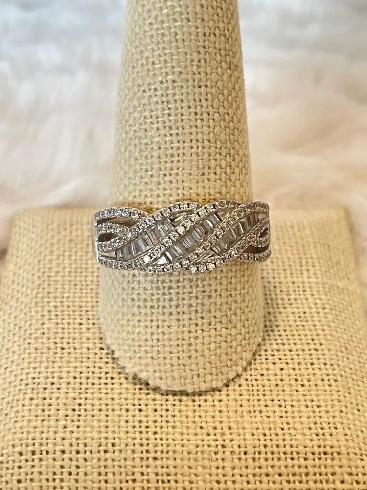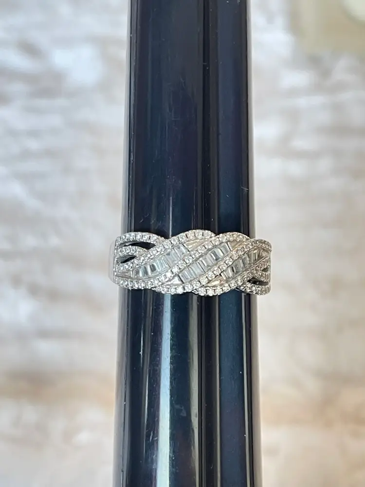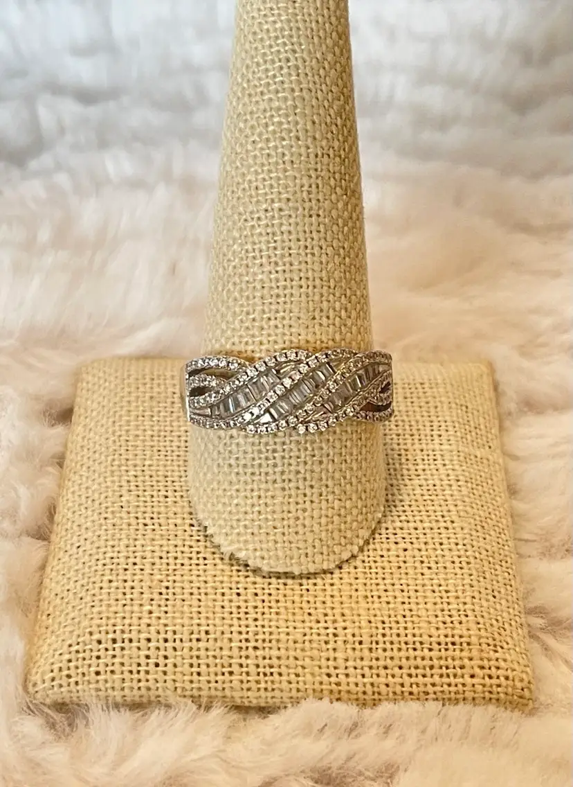 JTV 925 sterling silver marked ring. Featured a wave design with shimmering baguette-cut stones set in a crisscross pattern, framed by delicate pavé-style round stones for added sparkle. Approximate size 11.