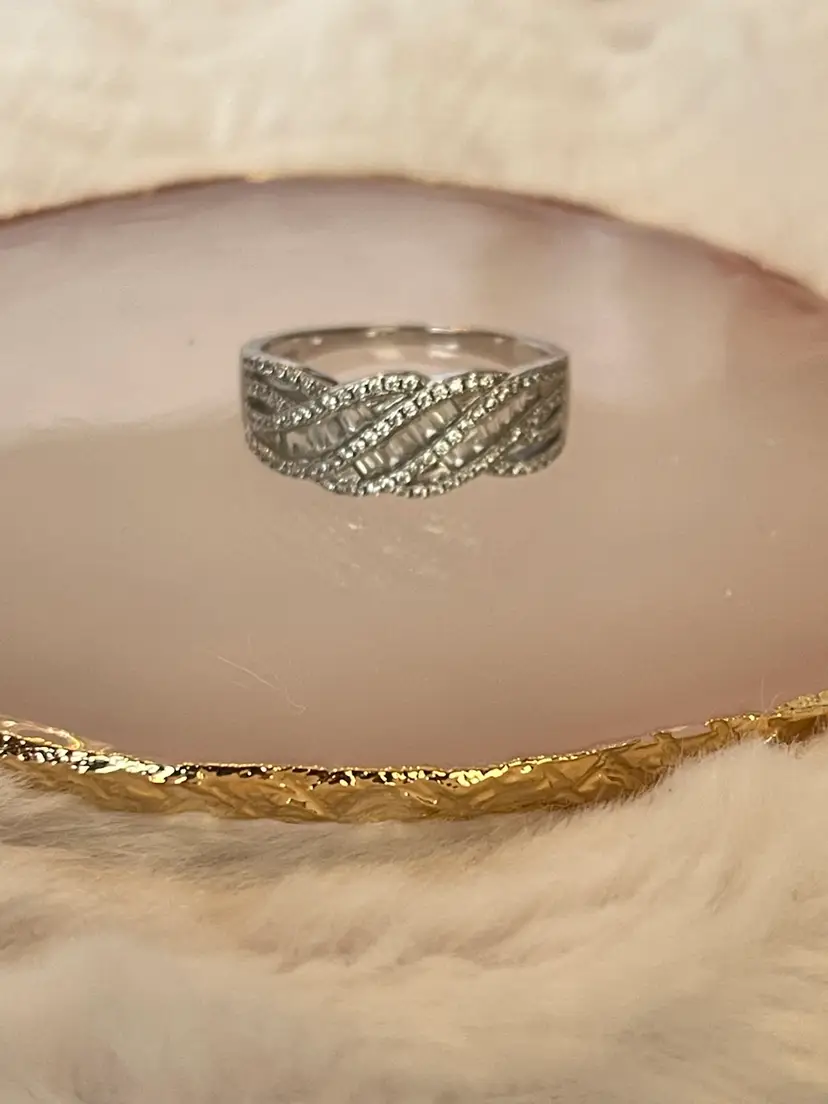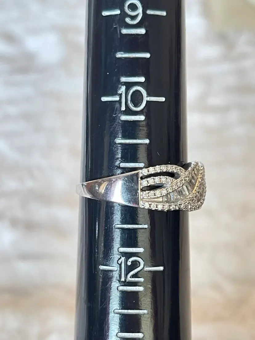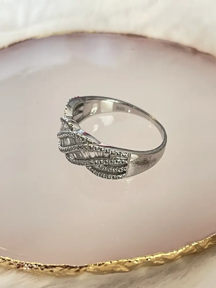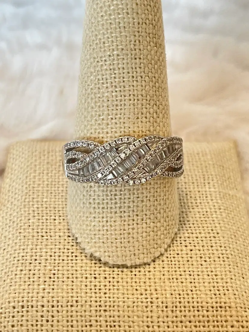 JTV 925 sterling silver marked ring. Featured a wave design with shimmering baguette-cut stones set in a crisscross pattern, framed by delicate pavé-style round stones for added sparkle. Approximate size 11.