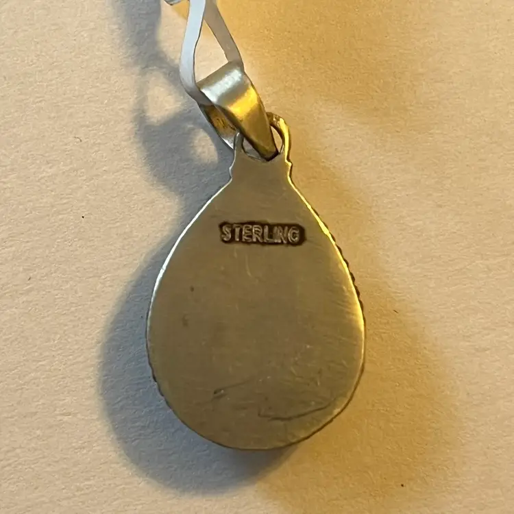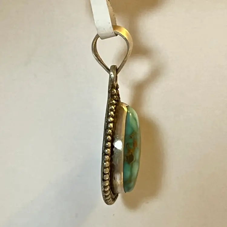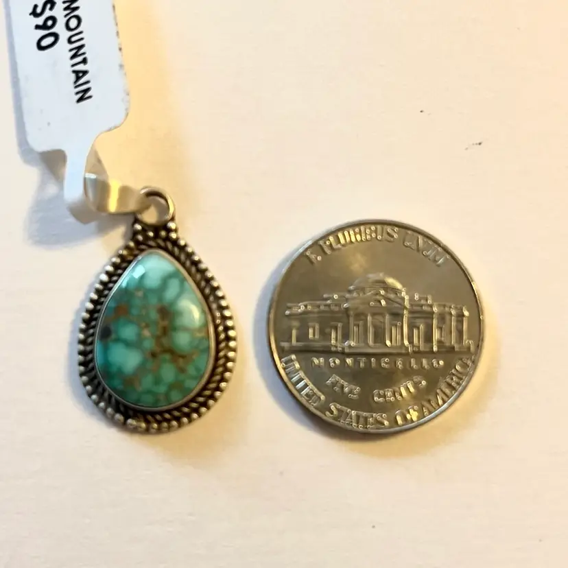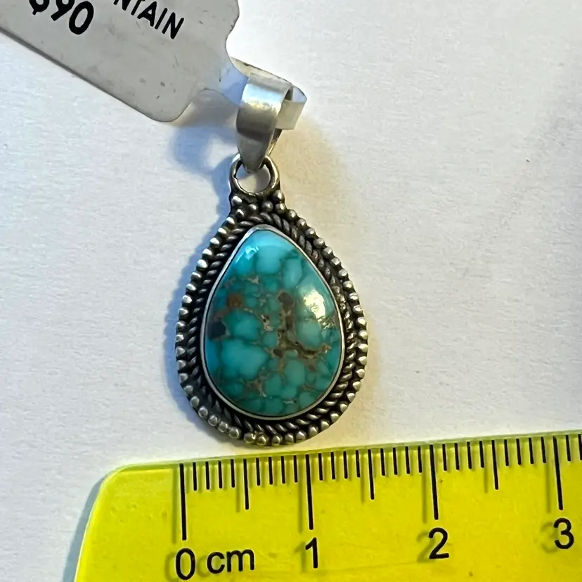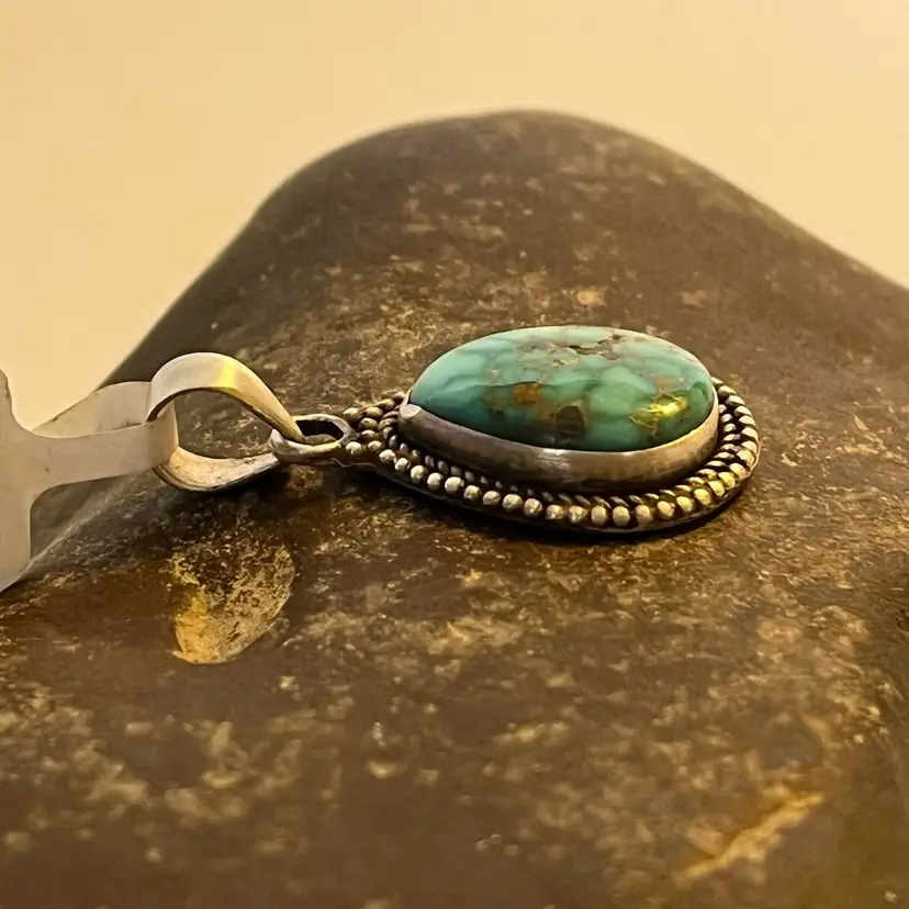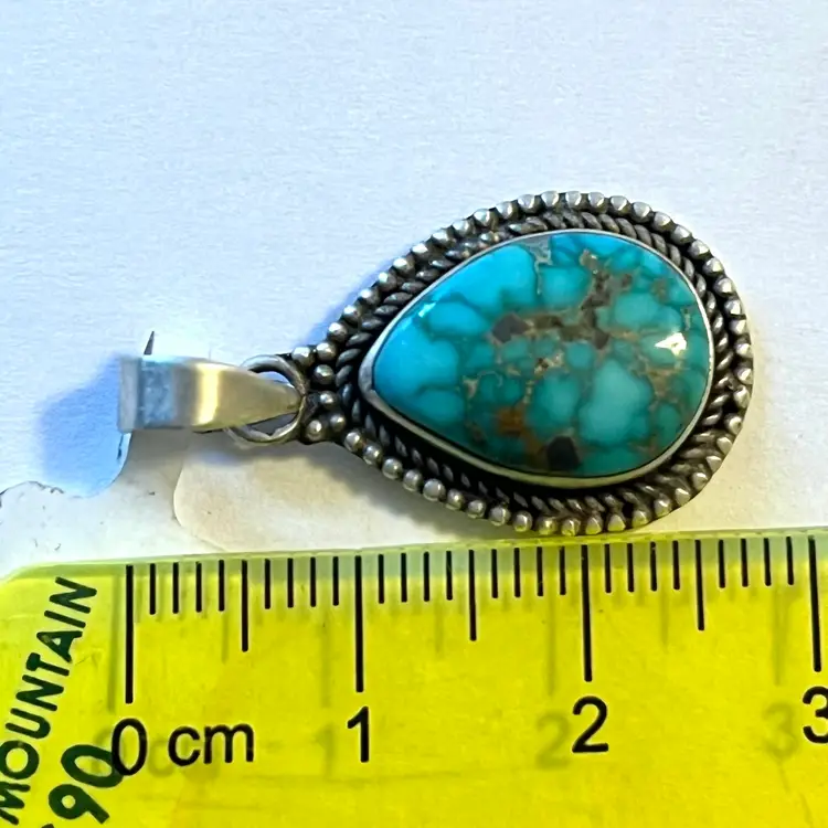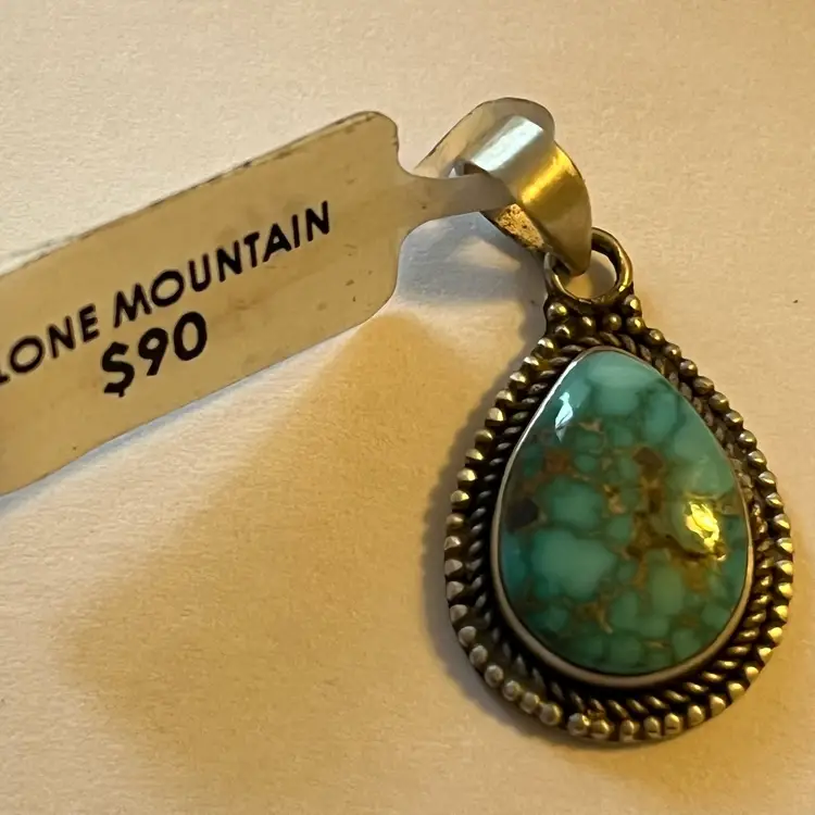 Metal: Sterling, stamped Stone: Lone Mountain turquoise cabochon Setting Style: Full bezel with double edging — twisted rope inner and beaded outer Stone Size: approx. 6 mm wide × 1.5 cm long Pendant Size (incl. bail): approx. 28 mm long × 1.5 cm wide Condition: New with tag