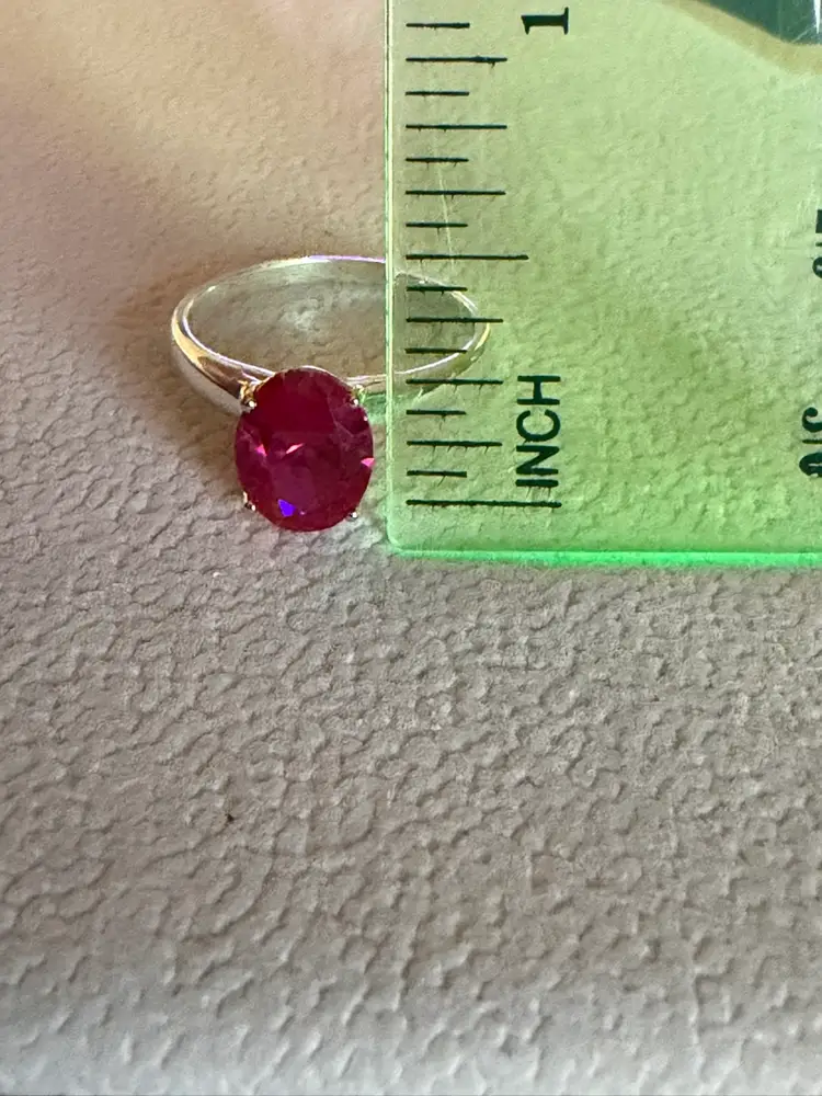 • Oval ruby gemstone • Tested ruby/sapphire on Presidium tester • Sterling silver band (925 mark) • Size approximately 7 (see mandrel photo) • Classic solitaire design