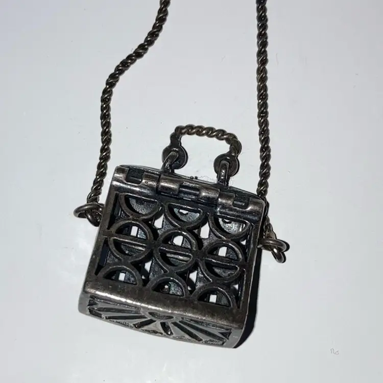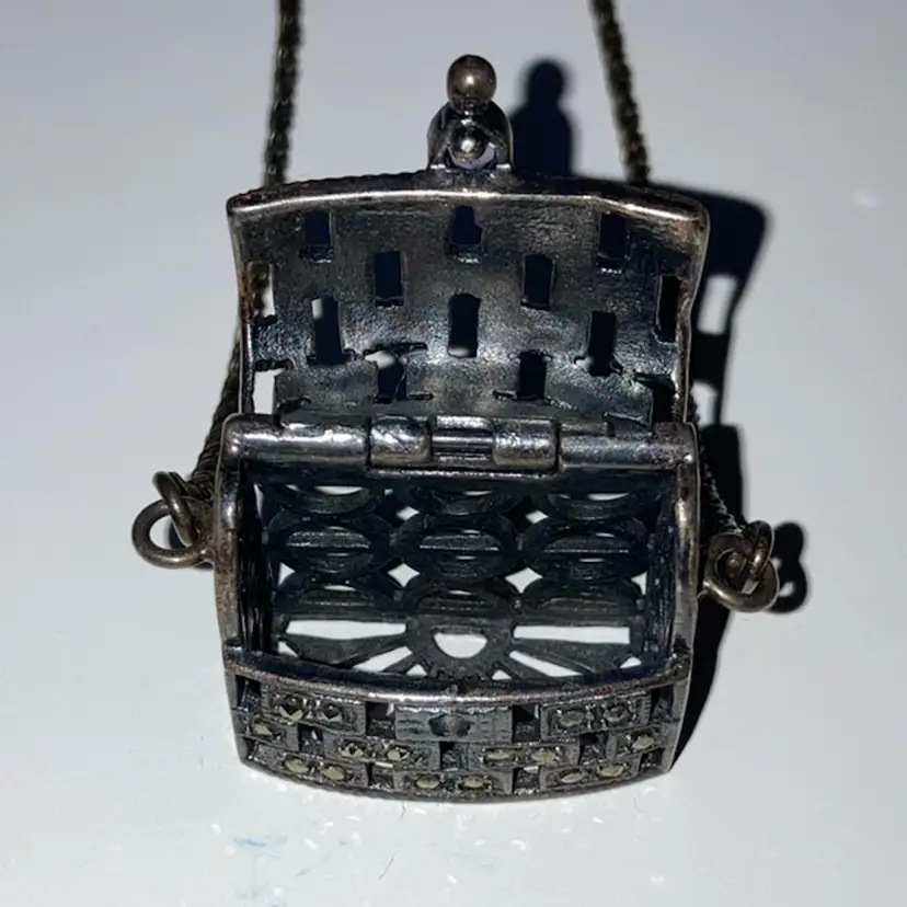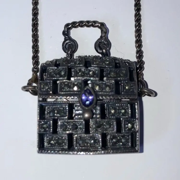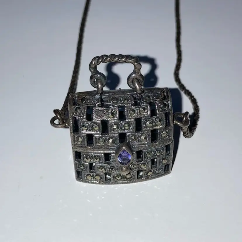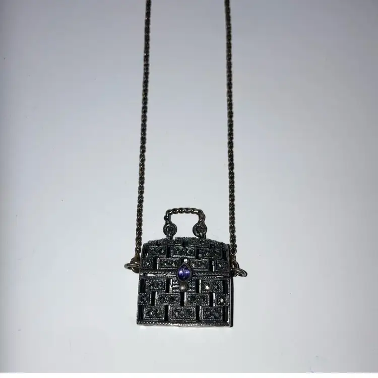 .925 Sterling Silver Purse With Marcasites And A Purple Stone! 24” Sterling Chain! Stamped 925! Acid TESTED! Purse Opens Too! NEW to District? Enter code Michel42 into your wallet prior to your first purchase and save $5 off of $10 or more! Happy Hunting! Thank you for checking out my items! I do combine shipping and refund for any overages!