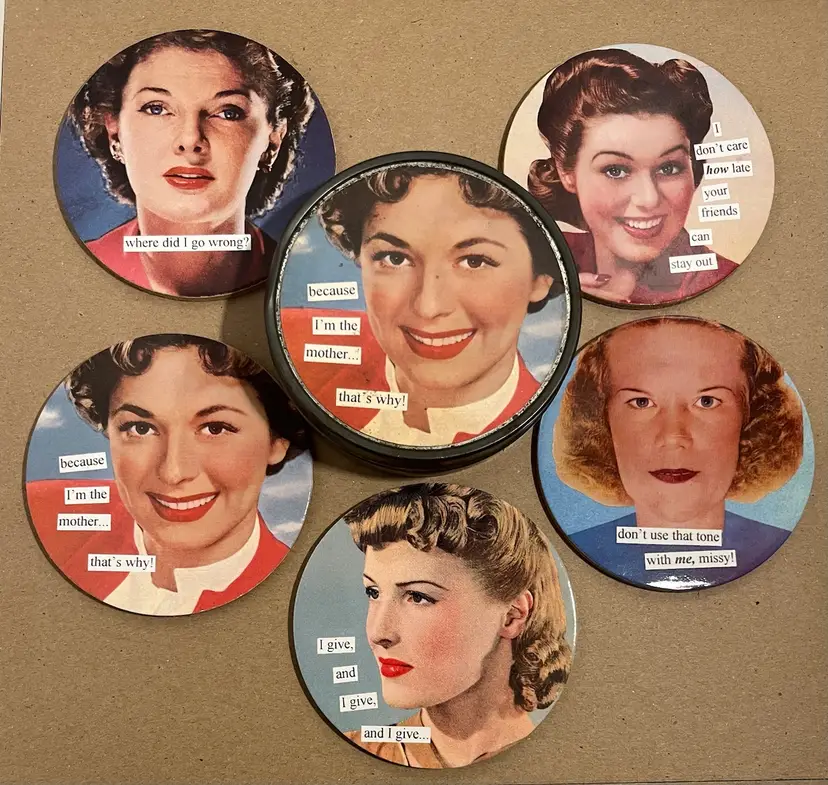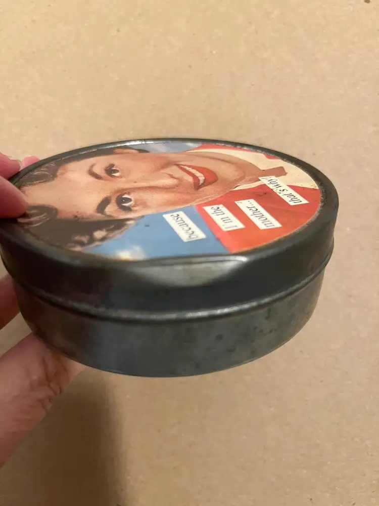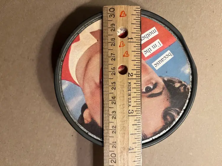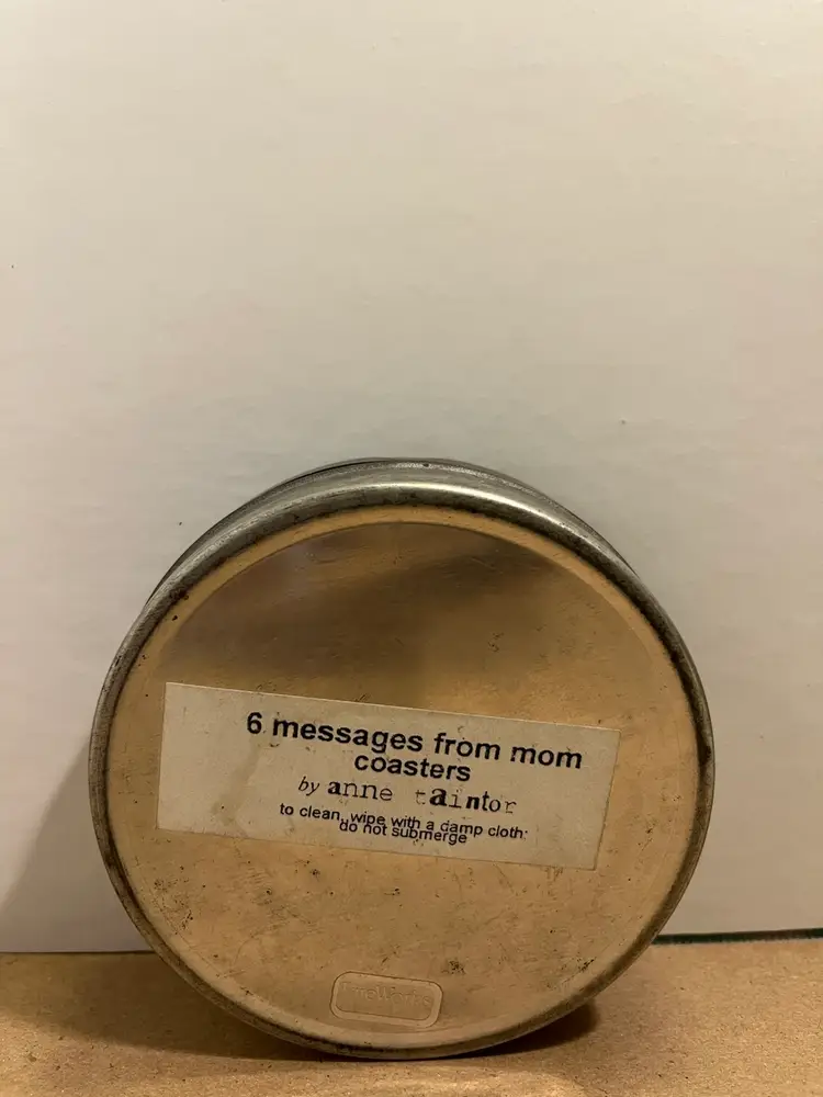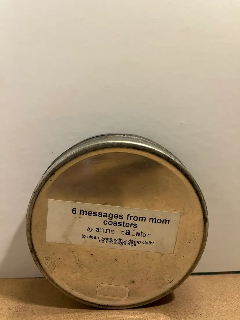Only 5 (not the original 6) coasters included, minor dent in tin container as shown in photos. 4"W x 1.25"H
