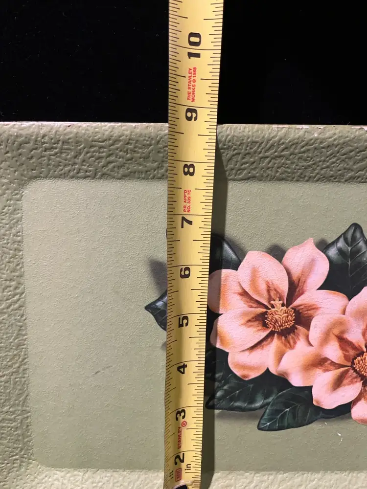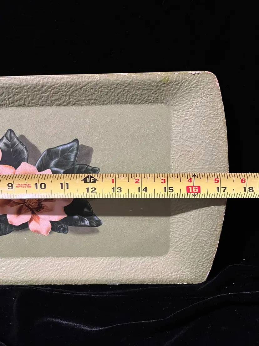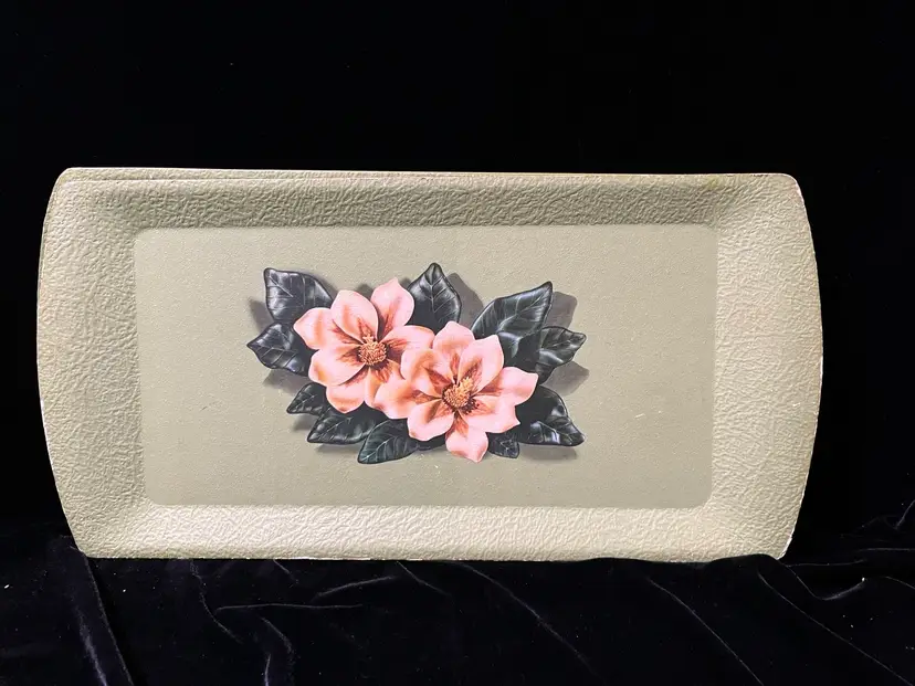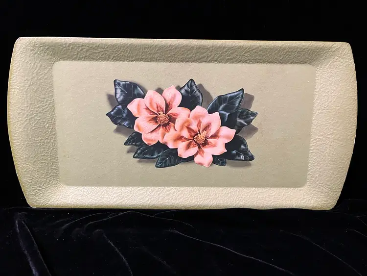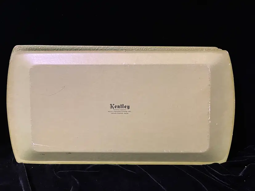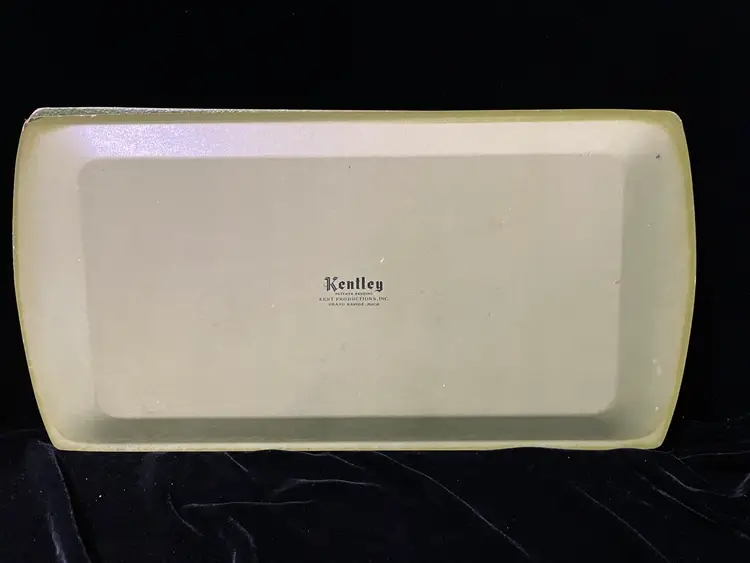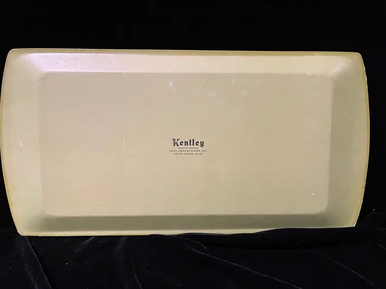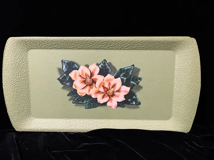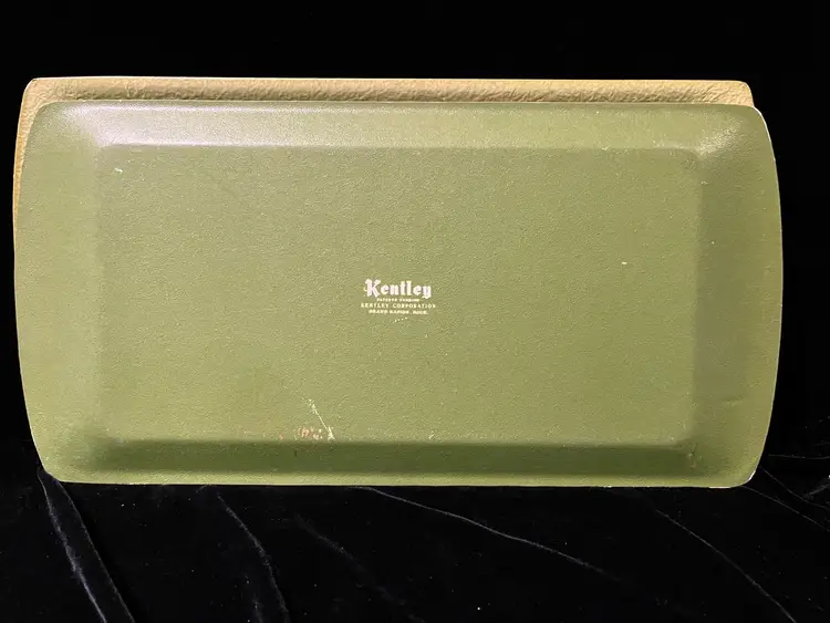 This is a set of 4 green floral vintage serving tray by Kentley of Grand Rapids, Michigan. They feature a floral design a d are made of a type of pressed board. They do have some wear as shown in the pictures.