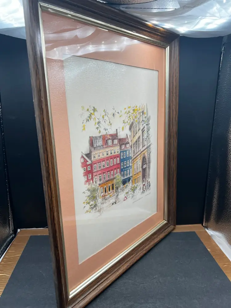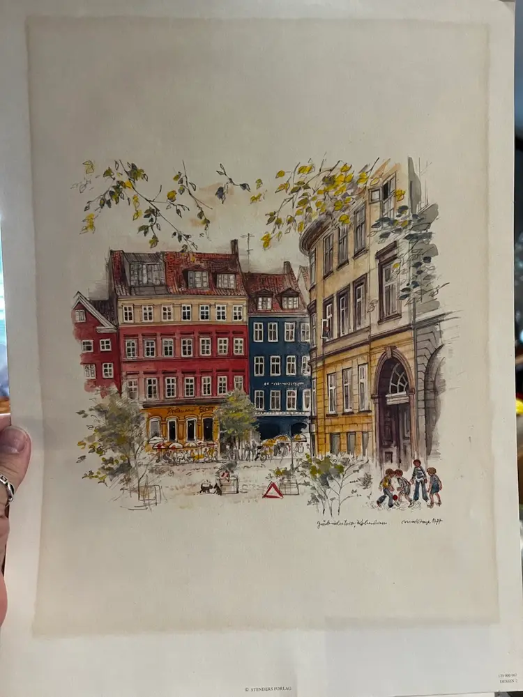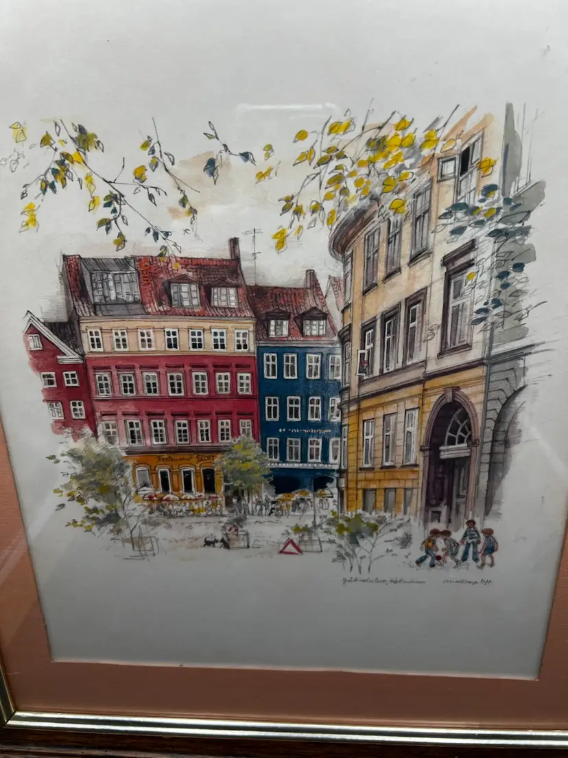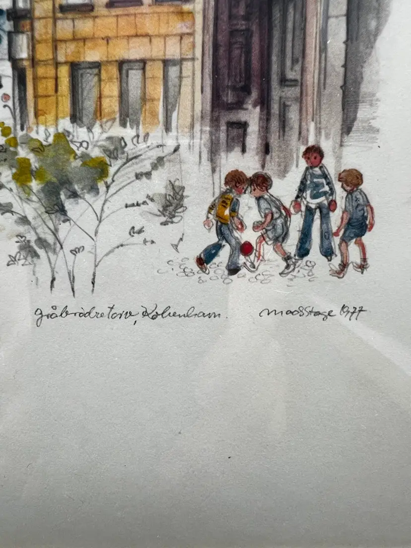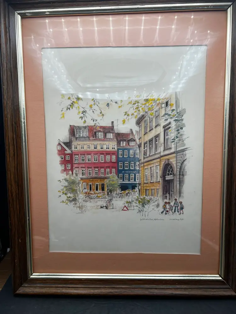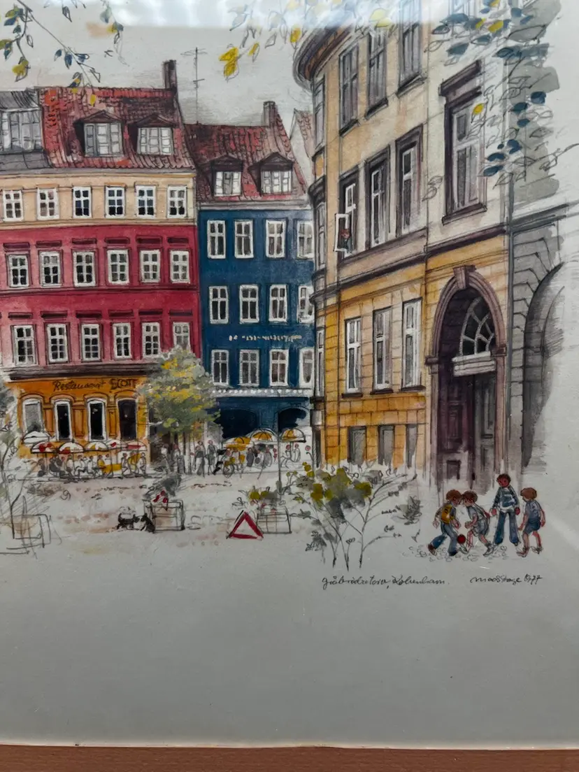 Vintage framed lithograph of Gråbrødre Torv (Greyfriars Square) in Copenhagen, Denmark, by Danish artist Mads Stage 1977
