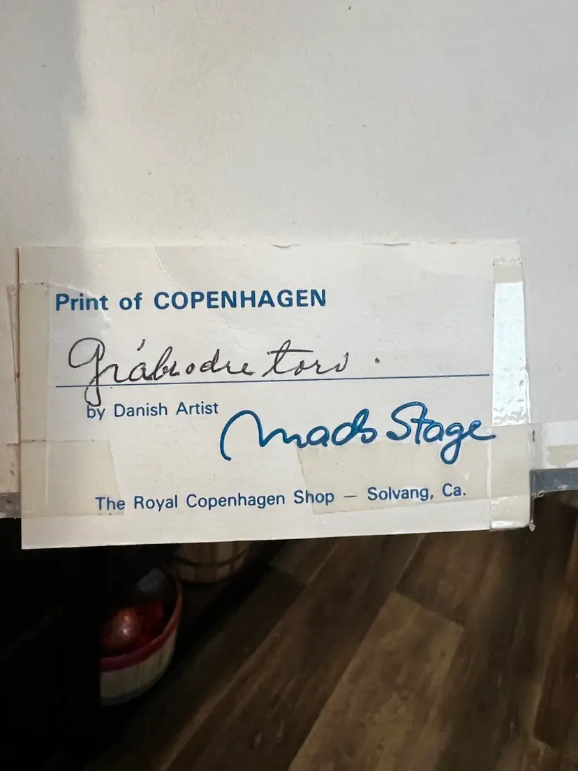 Lithograph is 11” x 14 1/2”, framed is 17 1/2” x 14” A card with art title is taped to the back of the print showing it came from the Royal Copenhagen Shop, Slovang, Ca Print is slightly darkened from age. See pics for details