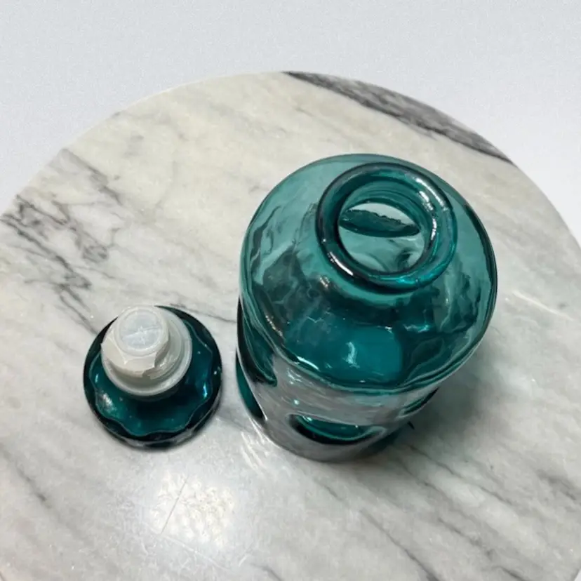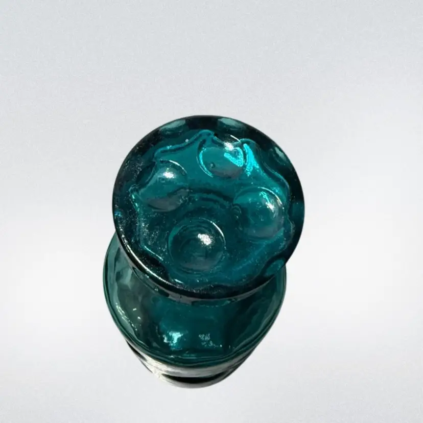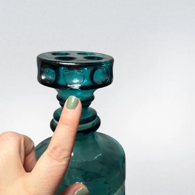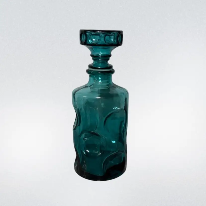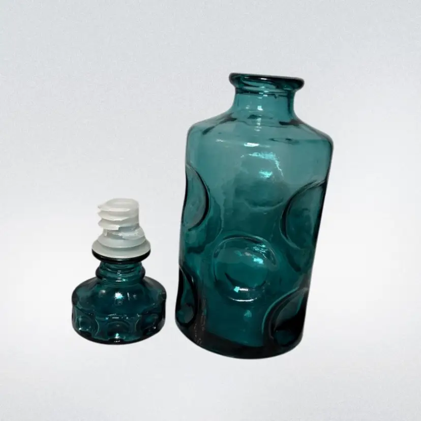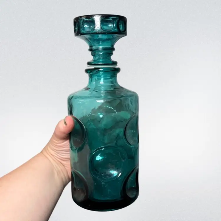 Beautiful Mid-Century Italian glass decanter, made in Empoli Italy. It is a stunning teal color with a playful large thumbprint design. There are two flaws with the stopper- the plastic part is older and has cracked, it would need to be replaced. There is also a small chip on one side of the stopper. Decanter is about 9.75in tall, with the stopper.