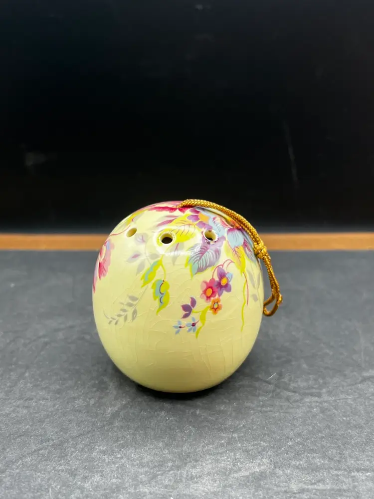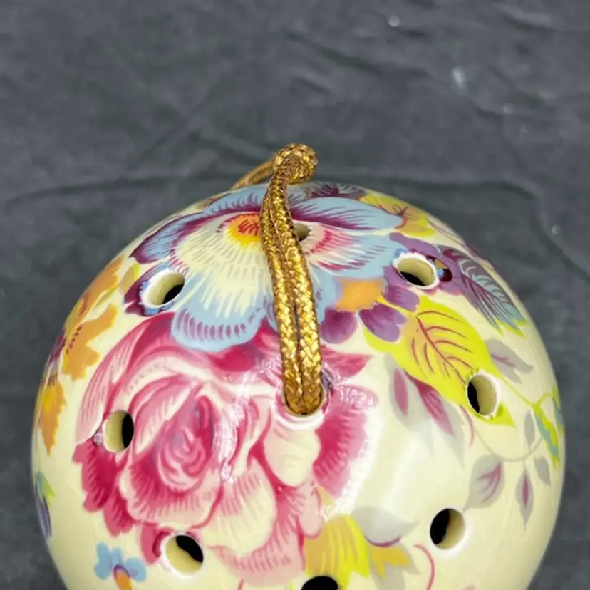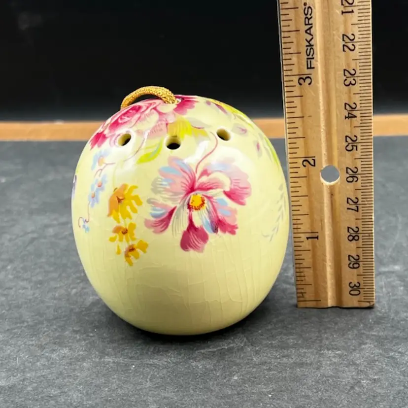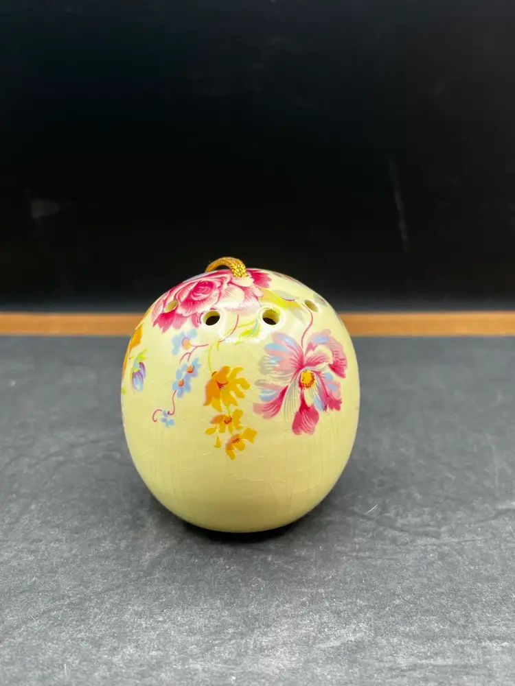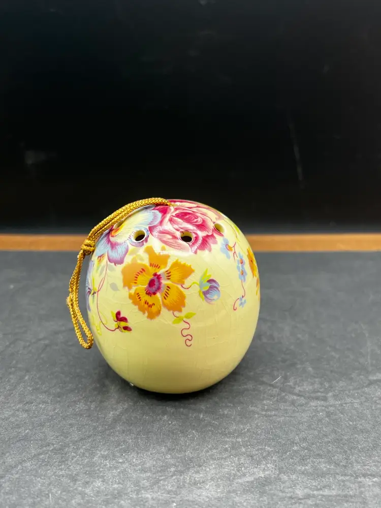 Vintage Ye Olde Ceramic Hanging Ball Pomander Aidees of Torouay Bovey Tracey Devon England Floral on Yellow 3” in diameter no chips or cracks but is crazing Would make a lovely hat pin holder