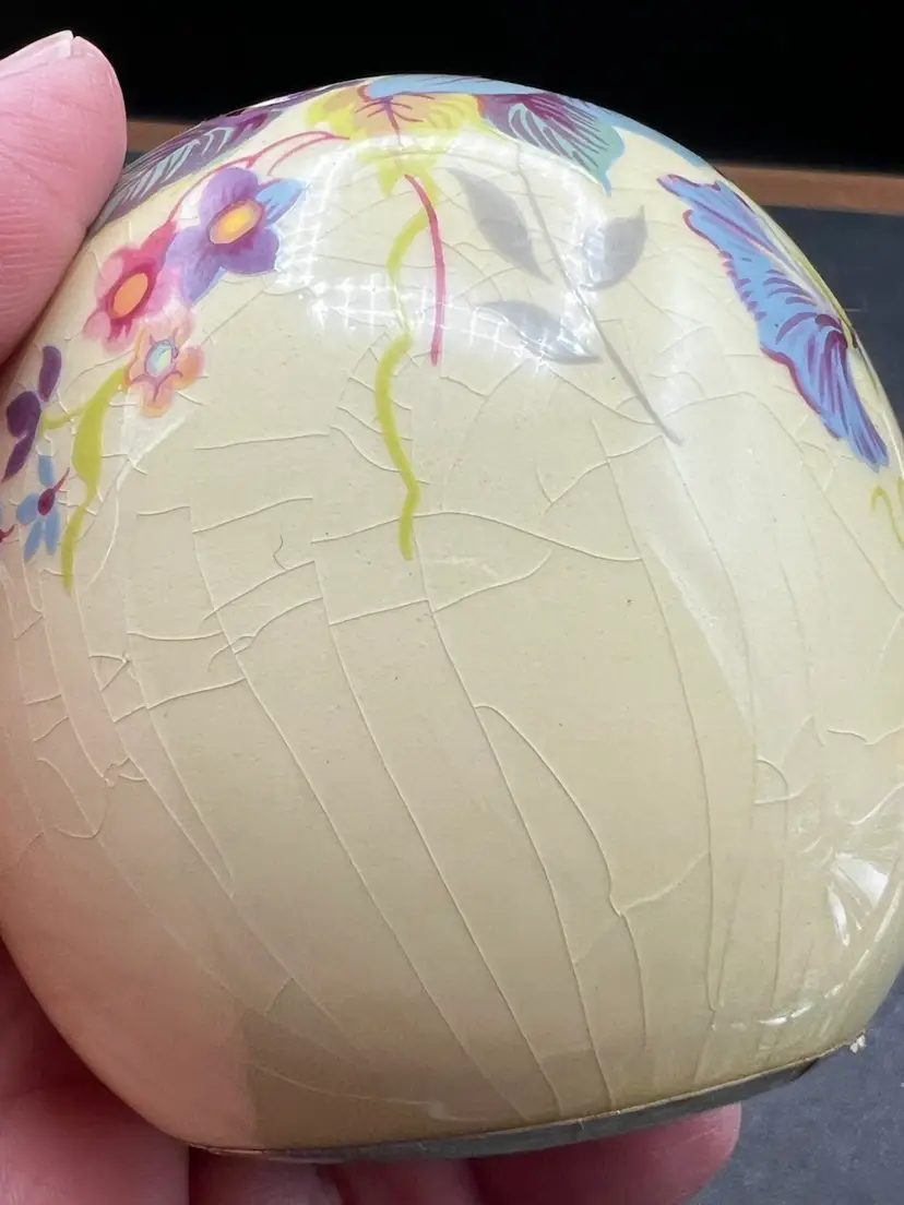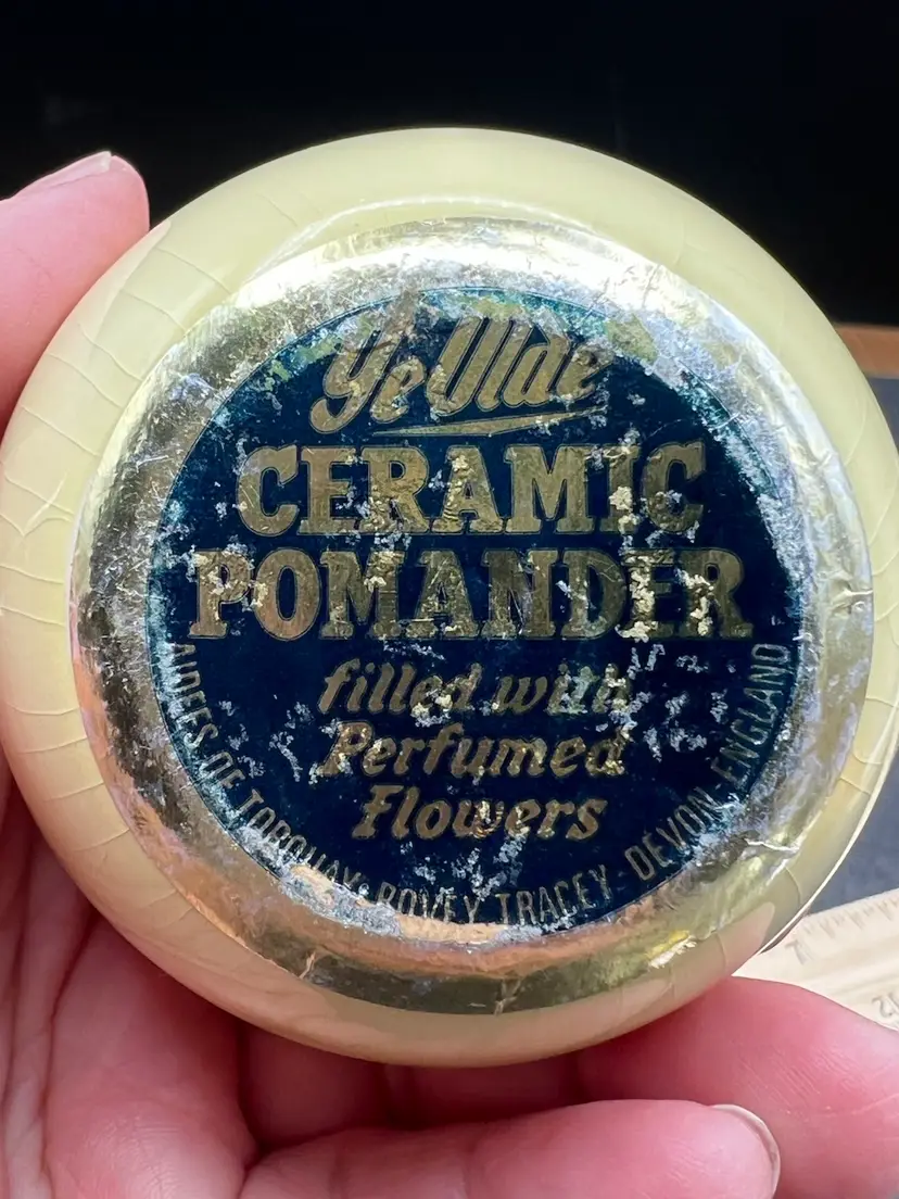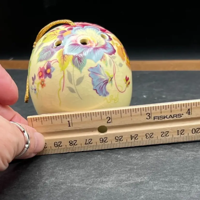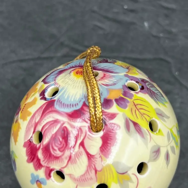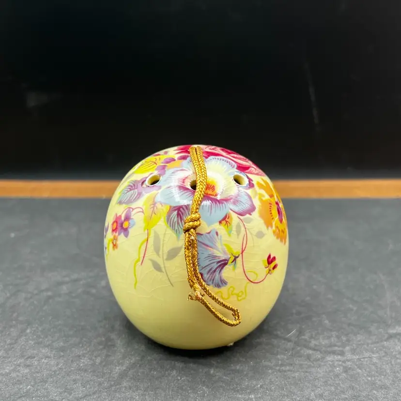 Vintage Ye Olde Ceramic Hanging Ball Pomander Aidees of Torouay Bovey Tracey Devon England Floral on Yellow 3” in diameter no chips or cracks but is crazing Would make a lovely hat pin holder