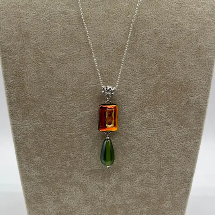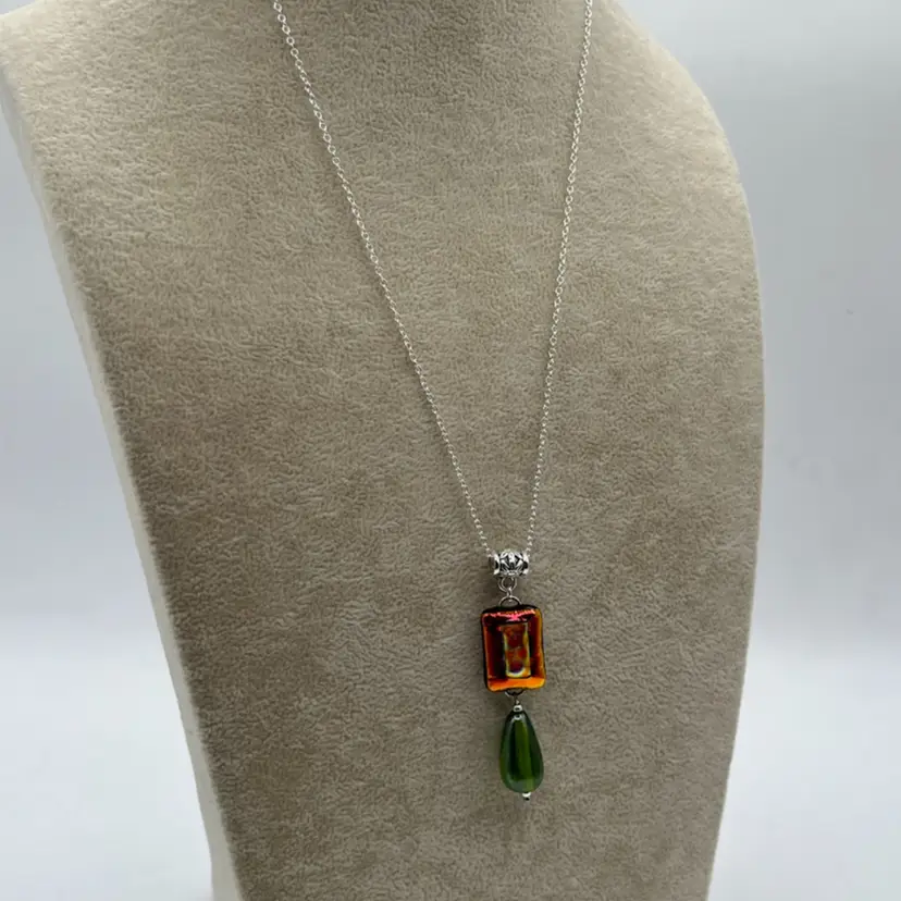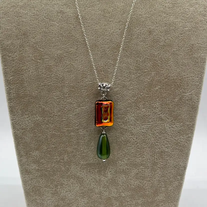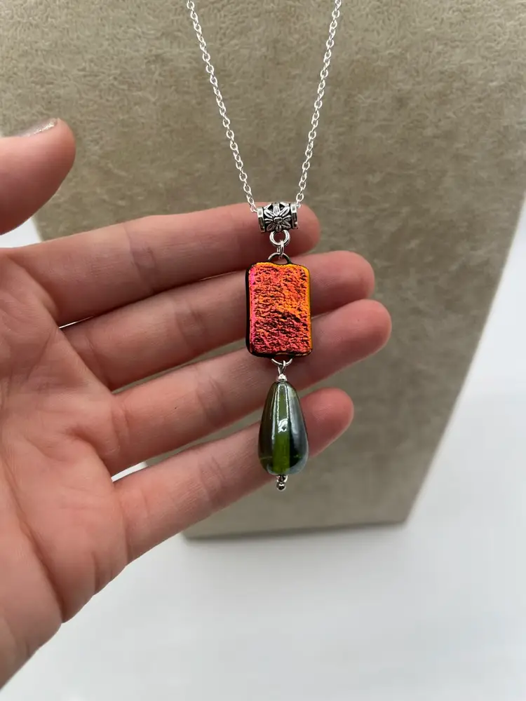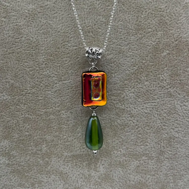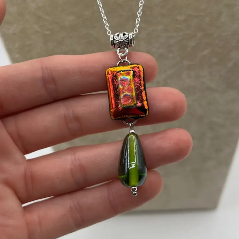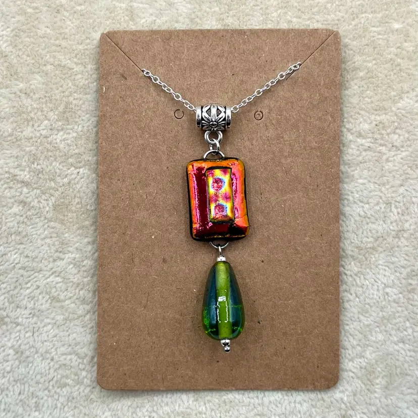 Materials: Handmade (not be me) dichroic glass and glass accent beads. Necklace is not silver.