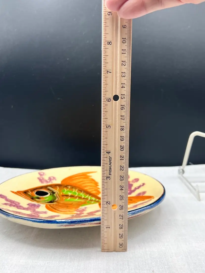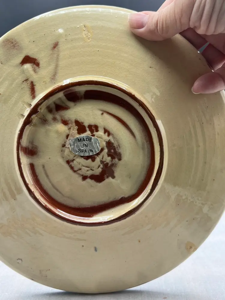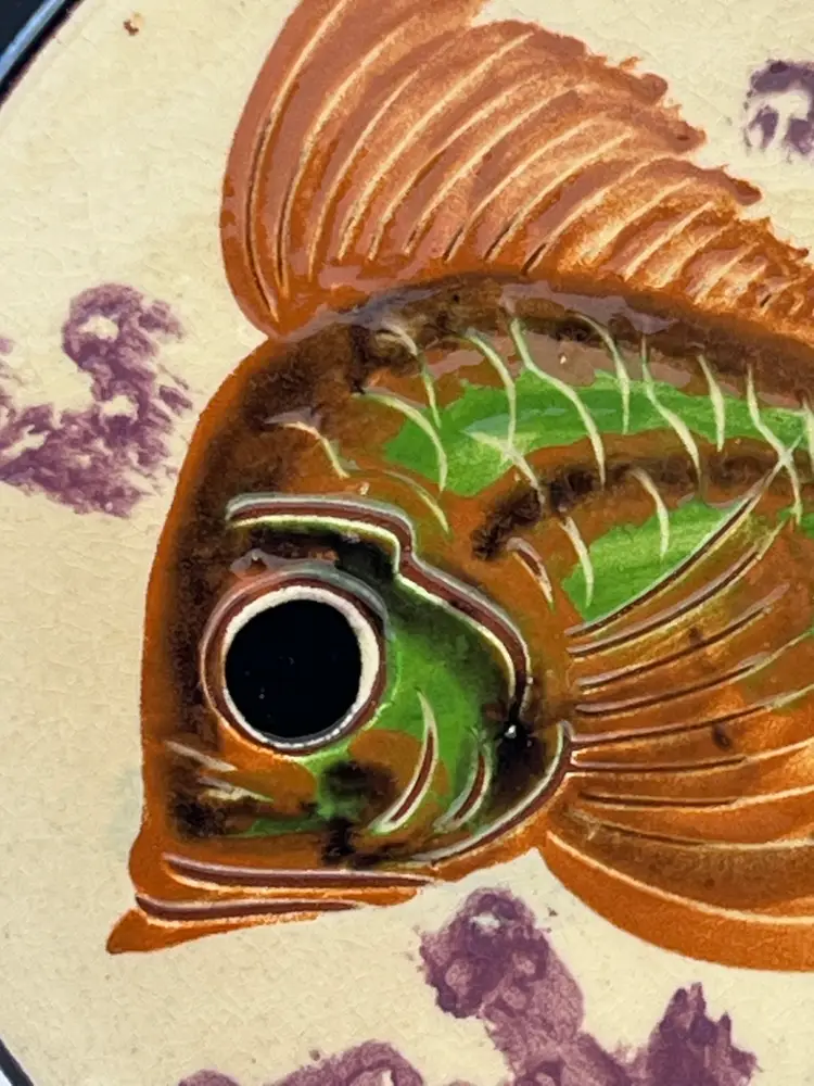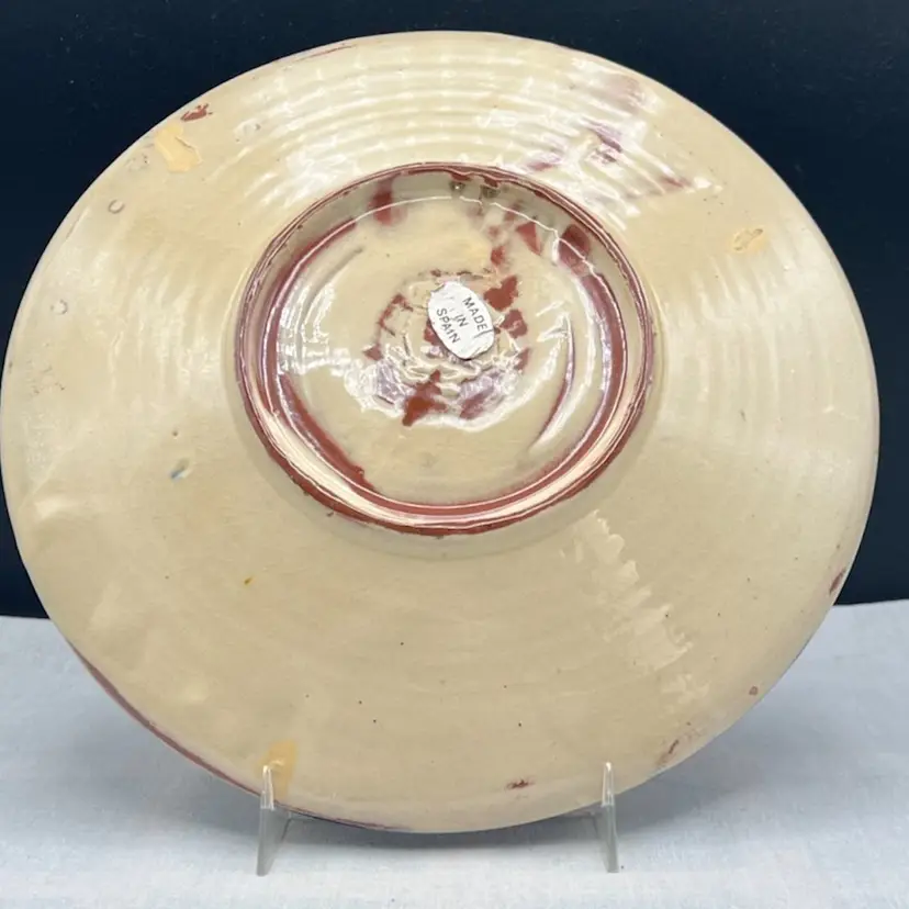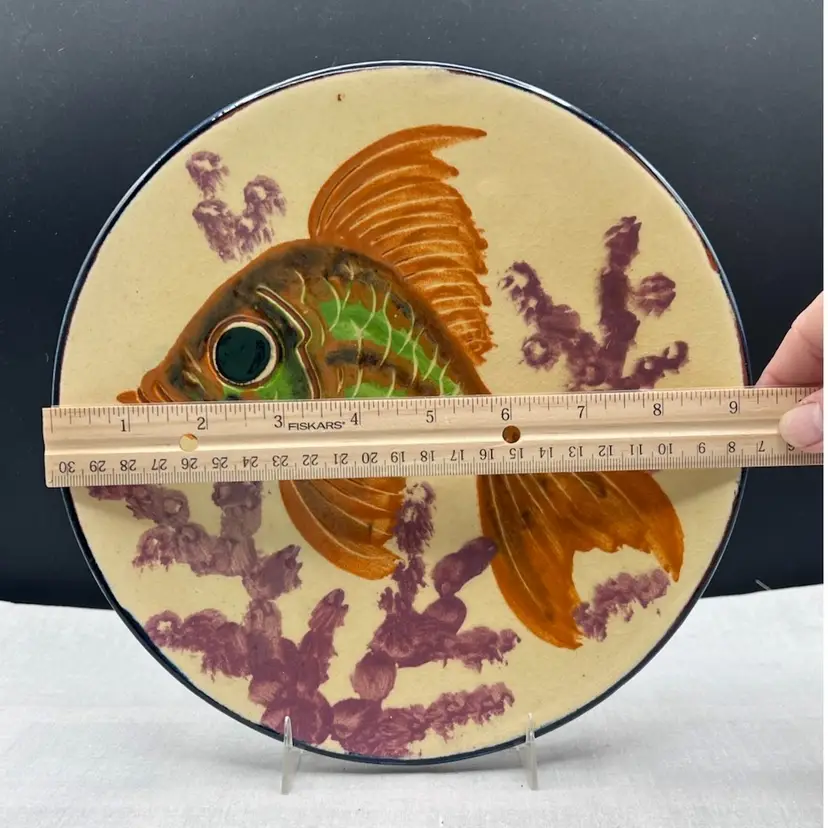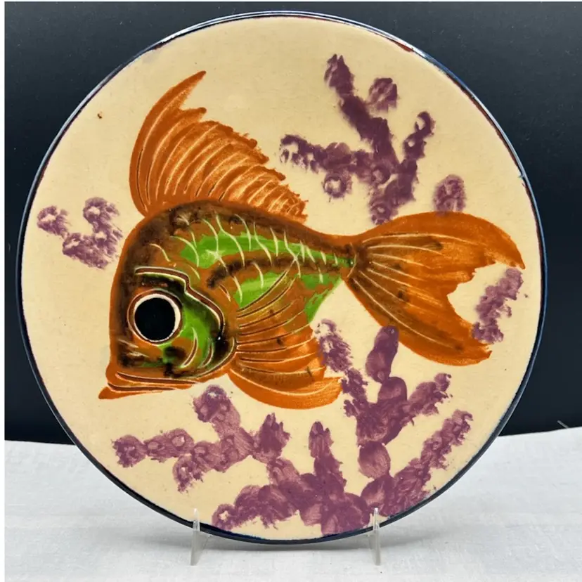 Vintage Majolica Hand Painted Ceramic Red-ware Decorative Plate - Fish And Coral Motif Made In Spain 9” in diameter x 1 1/4” deep Has holes on back rim for hanging In good condition, no chips or cracks, but is crazing