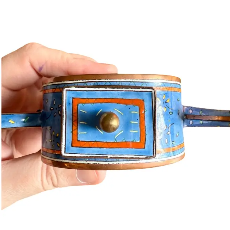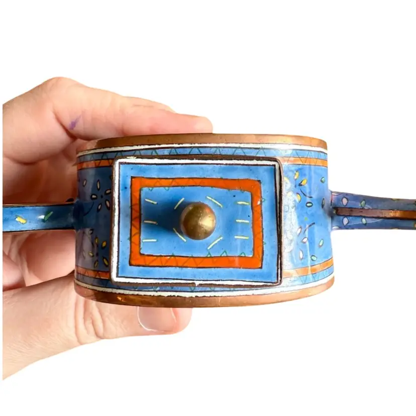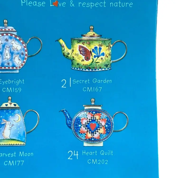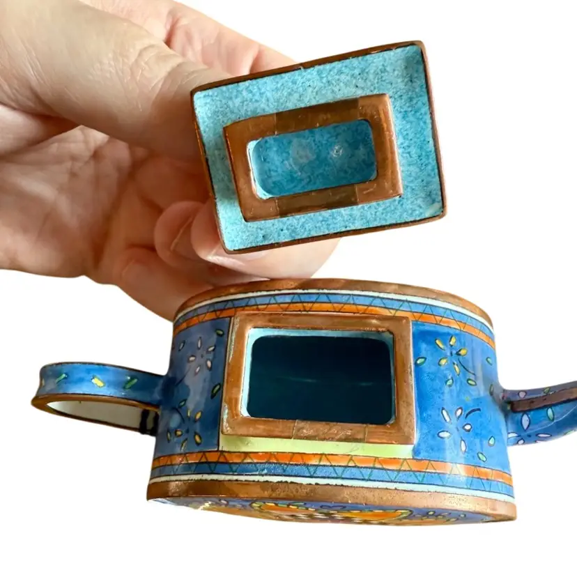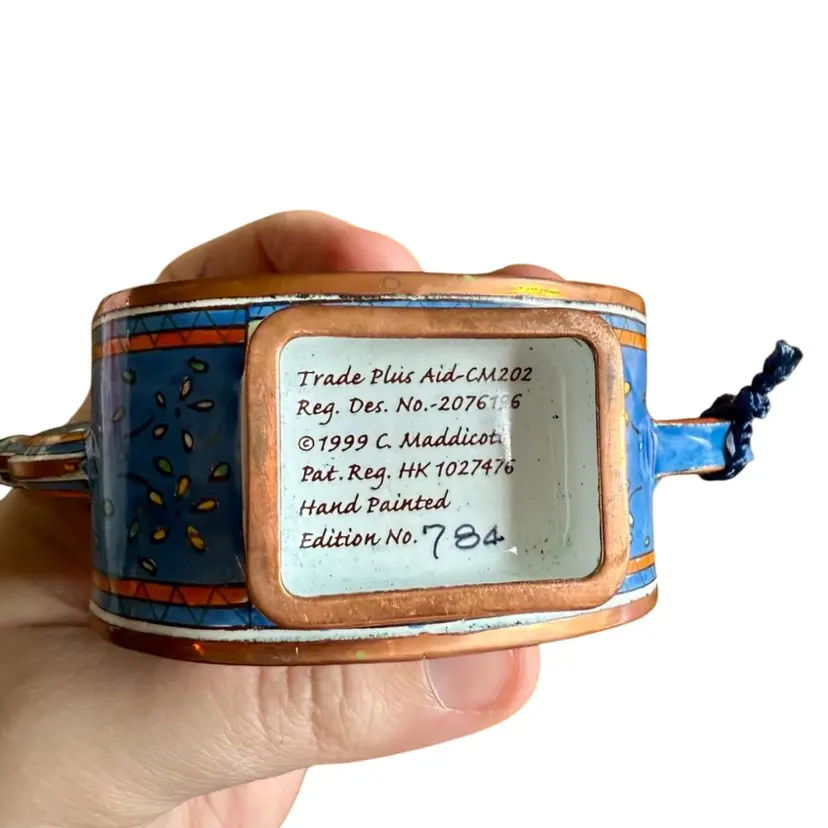 Teapot 5”x3.5”. Box 6”x6”x2.75”. Beautiful collectors miniature enamel teapot by Charlotte di Vita, London. This specific design is called Heart Quilt, CM202. Comes with quality display box, tag and booklet.