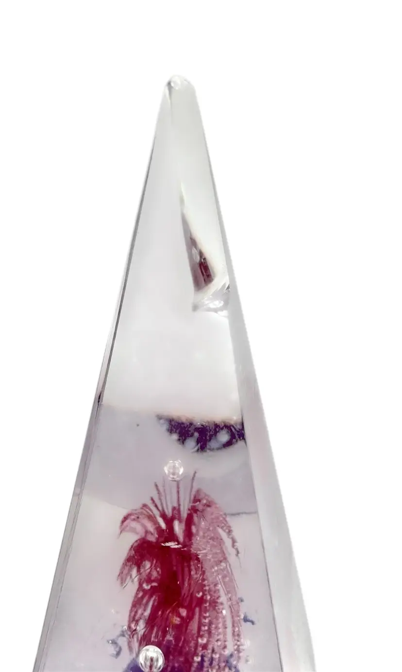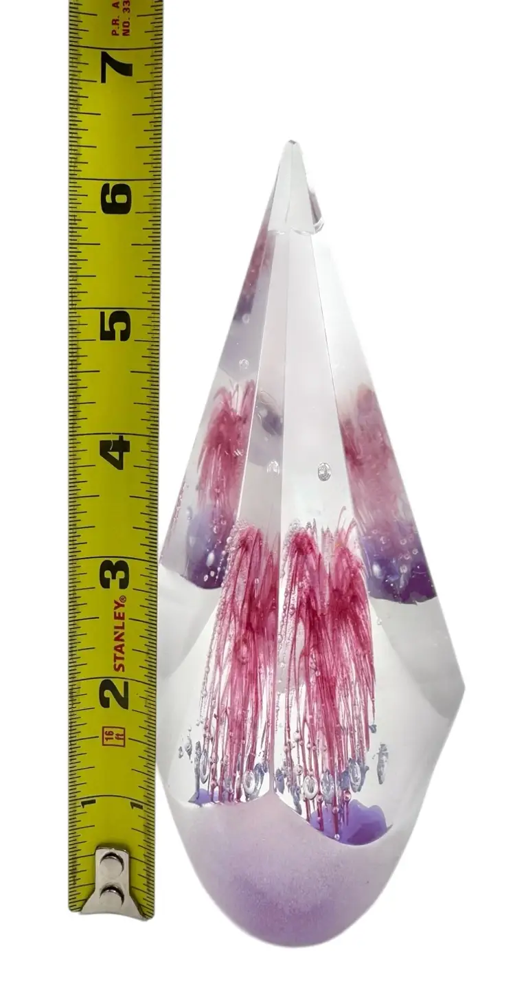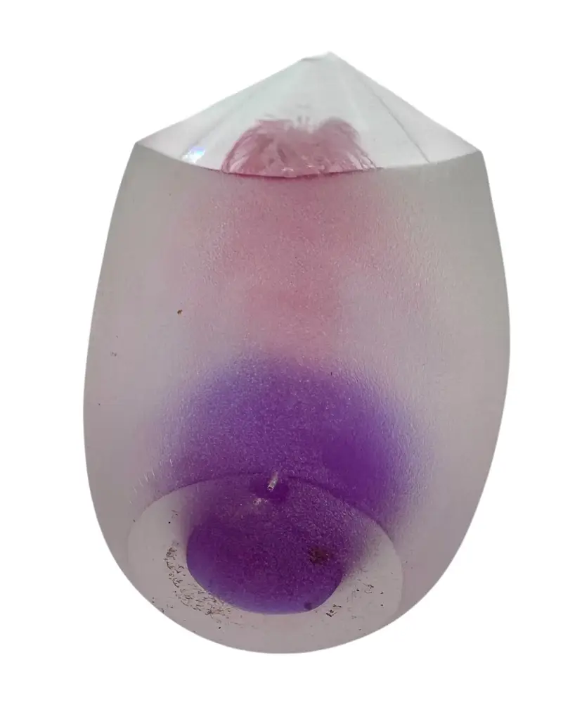 Clear paperweight with frosted bottom, and pink and purple fountain on the inside.