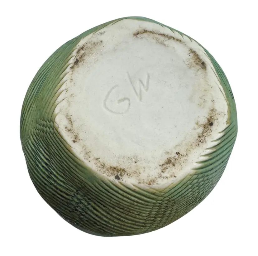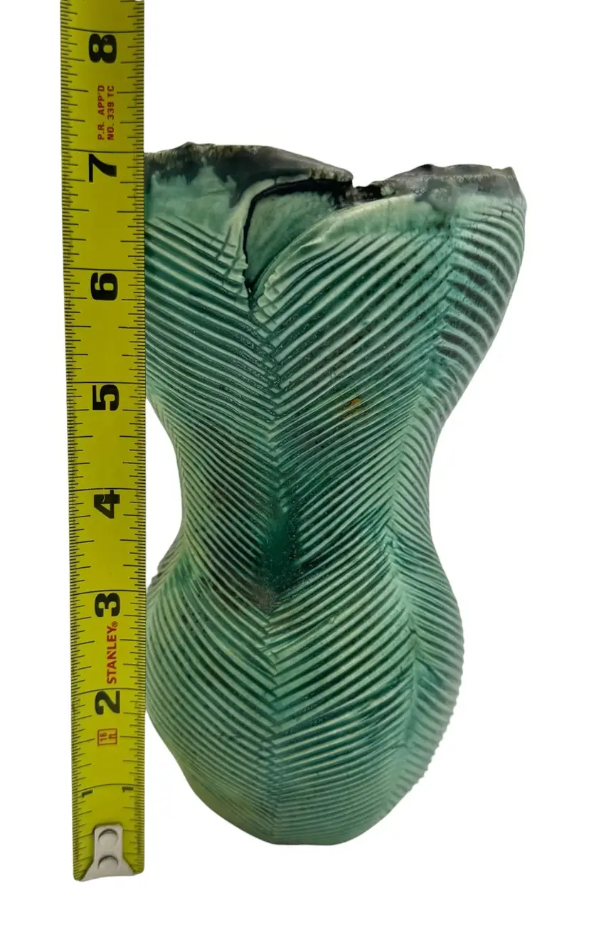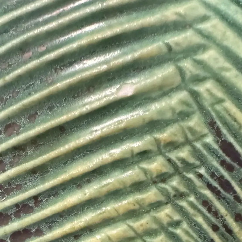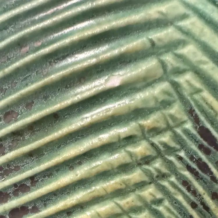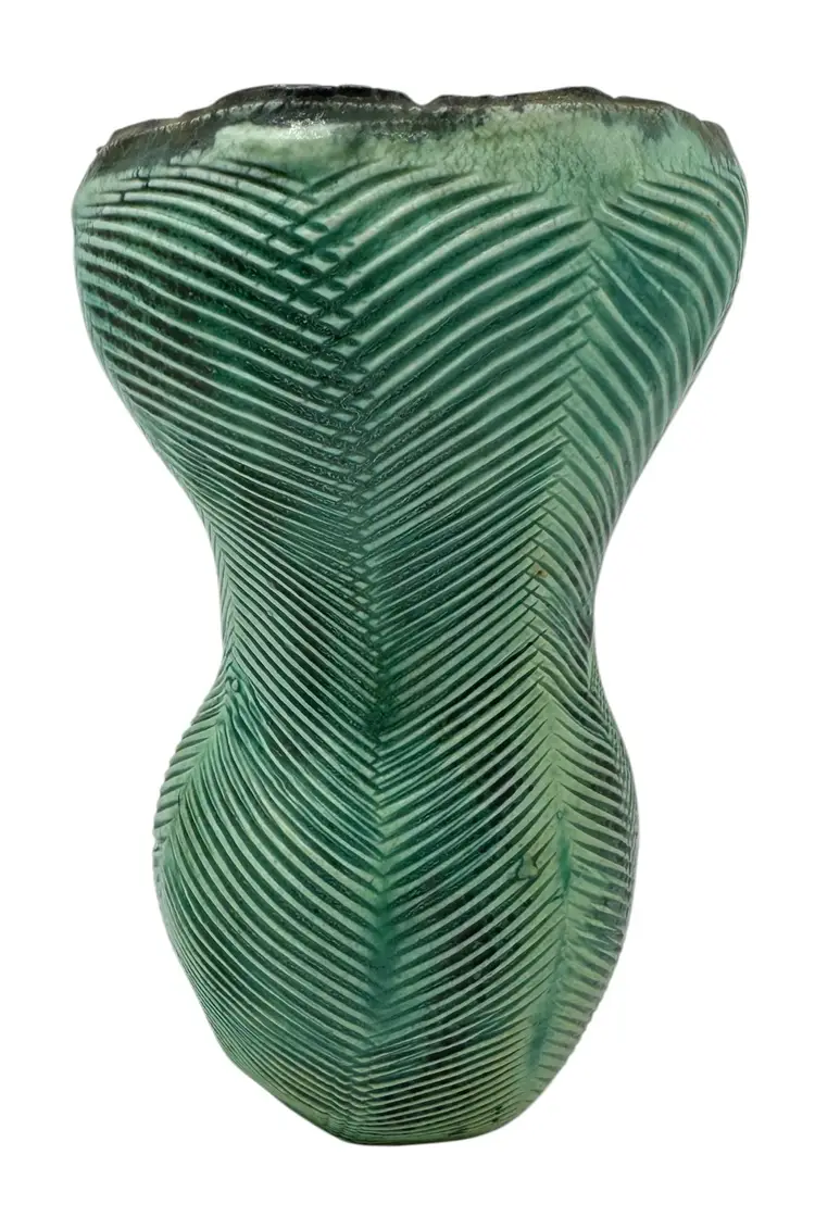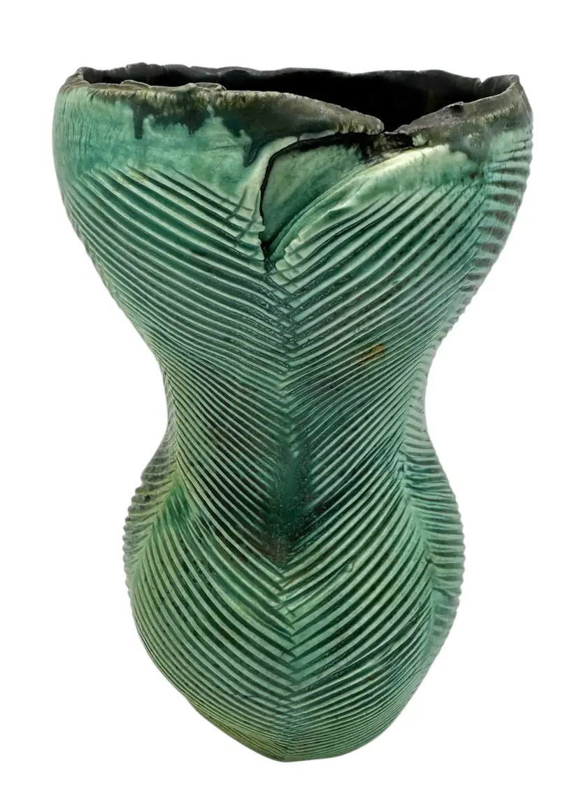 Pottery vase with texture reminiscent of a tropical leaf.