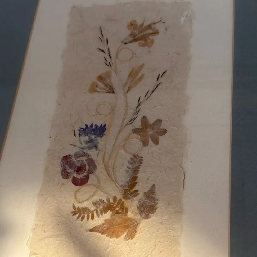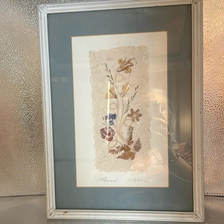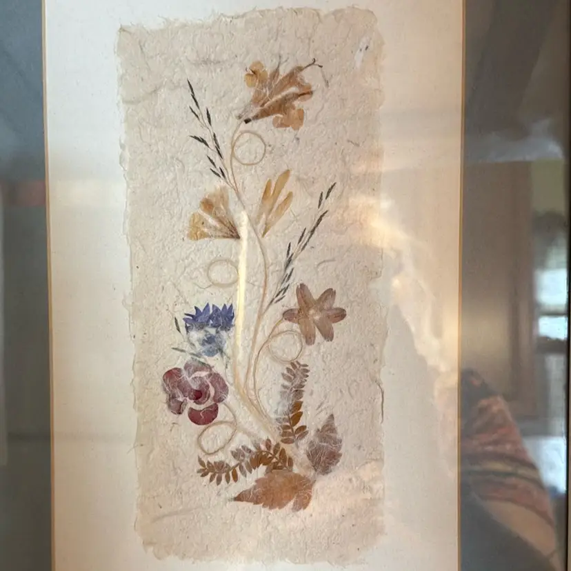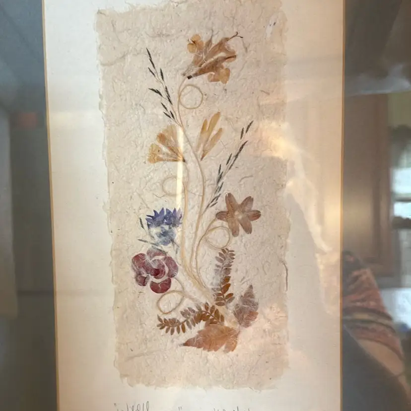 This appears to have been done on some type of paper using live media. It’s signed. Upon research these are common. It’s pressed flowers. It’s absolutely gorgeous. The frame in the left corner has a nick. It’s a vintage frame and so it adds to the absolute beauty of this picture.