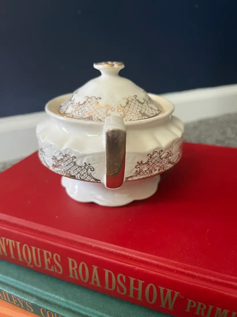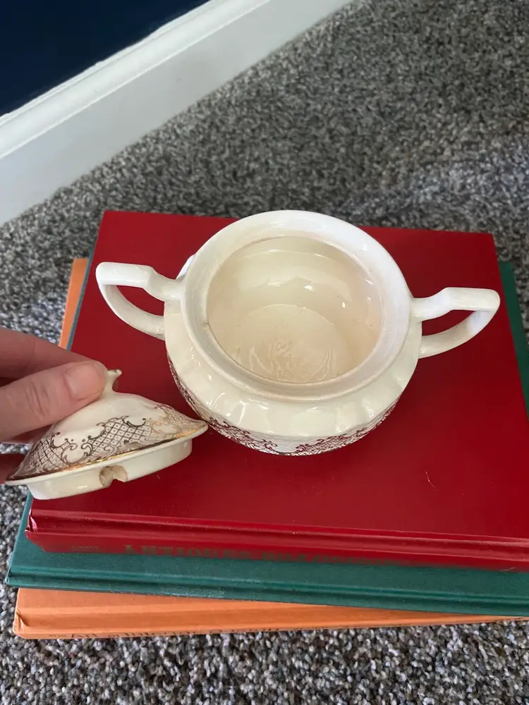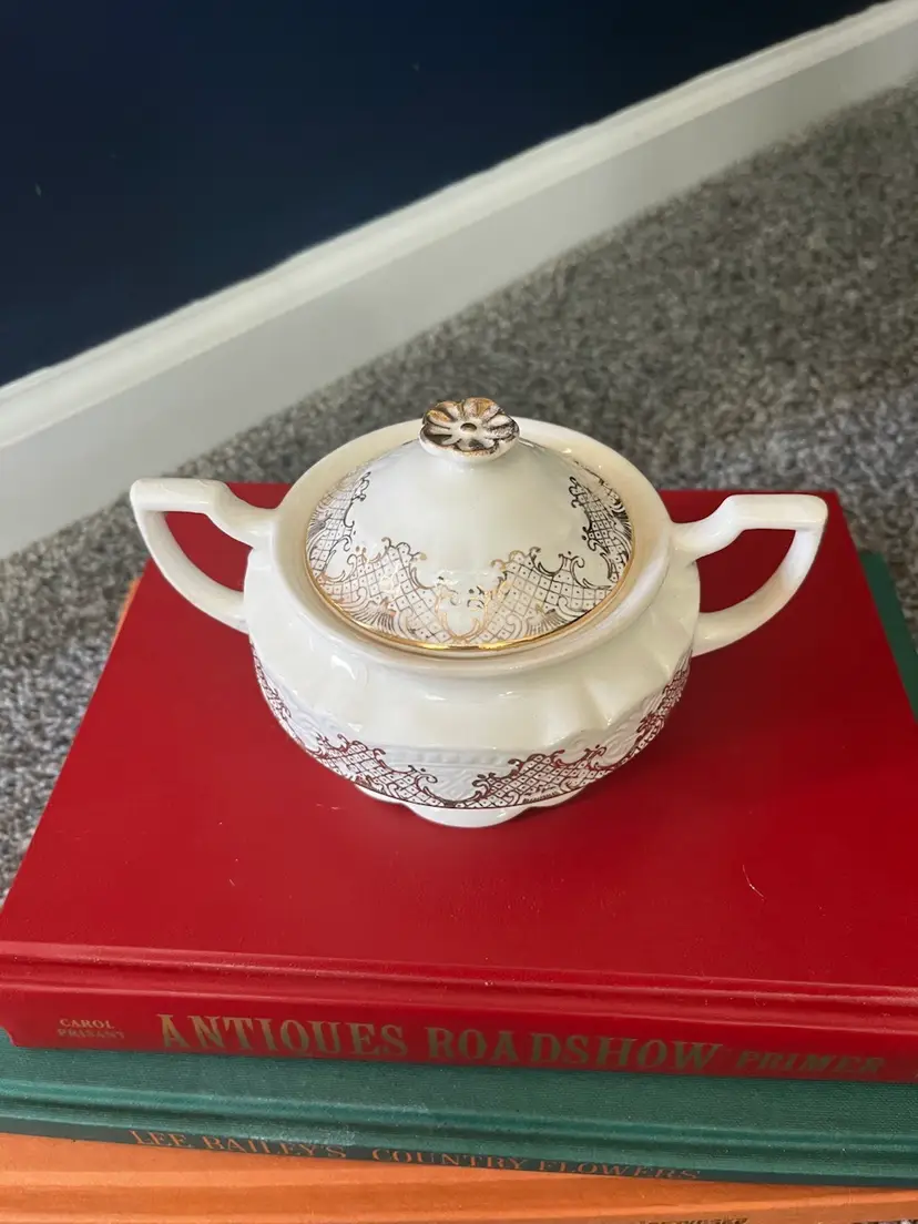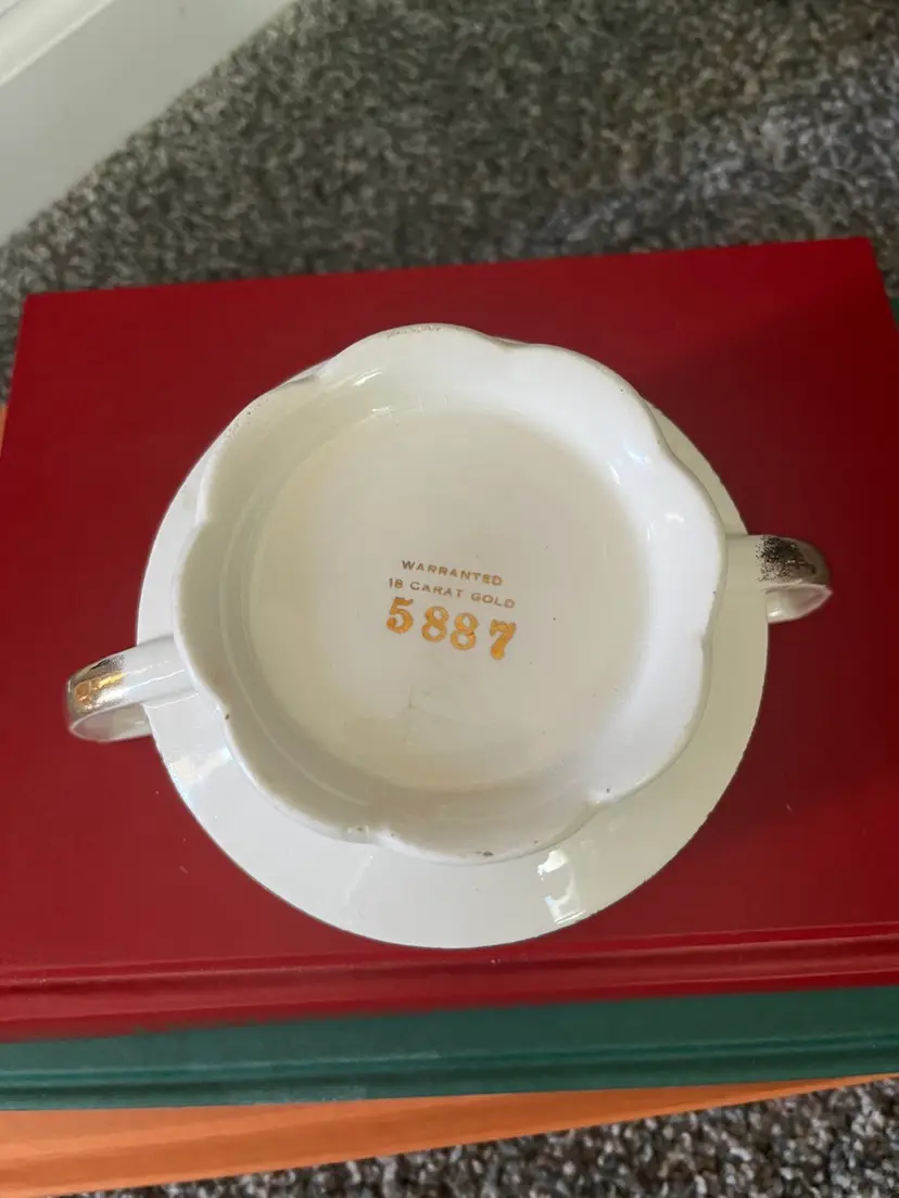 Loving all the details on this sugar bowl! On the bottom, it is stamped saying it’s 18 carat gold. There is a small chip on the lid that is showing on the last picture.