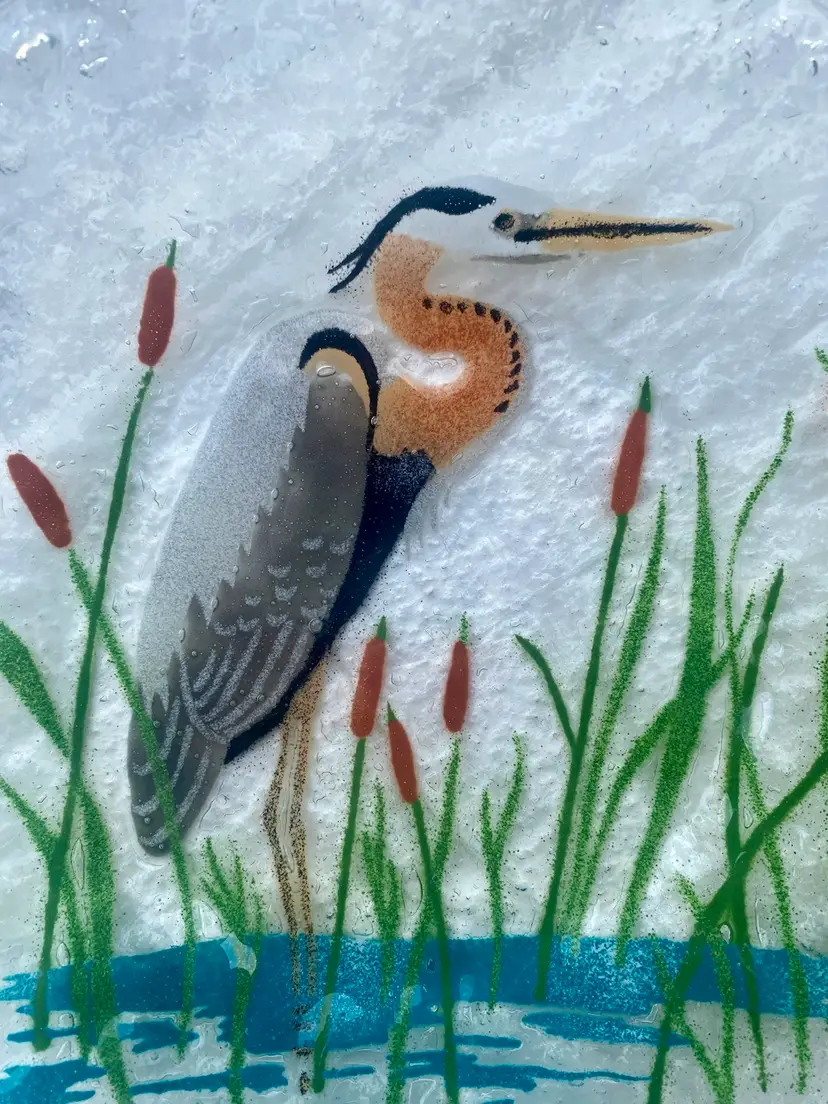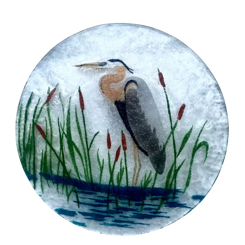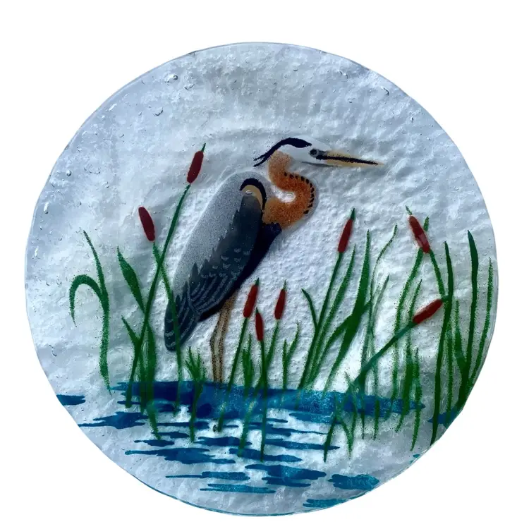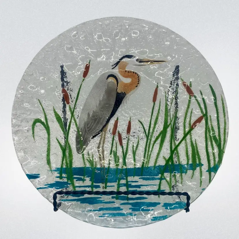 This is a fused glass plate by Ann C Ross featuring a heron in cattails. The glass is clear and textured. The background paper is showing through, but it is actually clear. It is in very good condition with a possible light scratch or 2, but otherwise perfect, with no chips or cracks. The signature is difficult to find, but it is on the back on the dark grey part of the wing. The plate measures 10” in diameter. The first photo shows the coloring best.