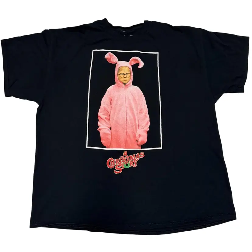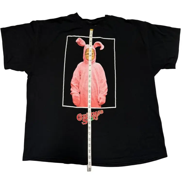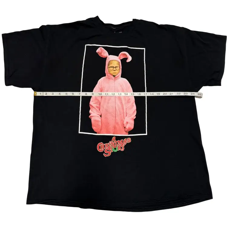 This black T-shirt features a graphic print of Ralphie Bunny Suit from "A Christmas Story", making it a perfect choice for fans of the holiday-themed film. Made from a comfortable cotton blend material, this short sleeve shirt has a crew neckline and a regular fit, suitable for both men and women in size 2XL. The shirt's easy-care feature and Christmas-themed design make it a versatile and fun addition to any wardrobe, whether for winter, summer, fall, or spring. Ideal for those looking to showcase their love for the iconic movie in a playful and stylish way.