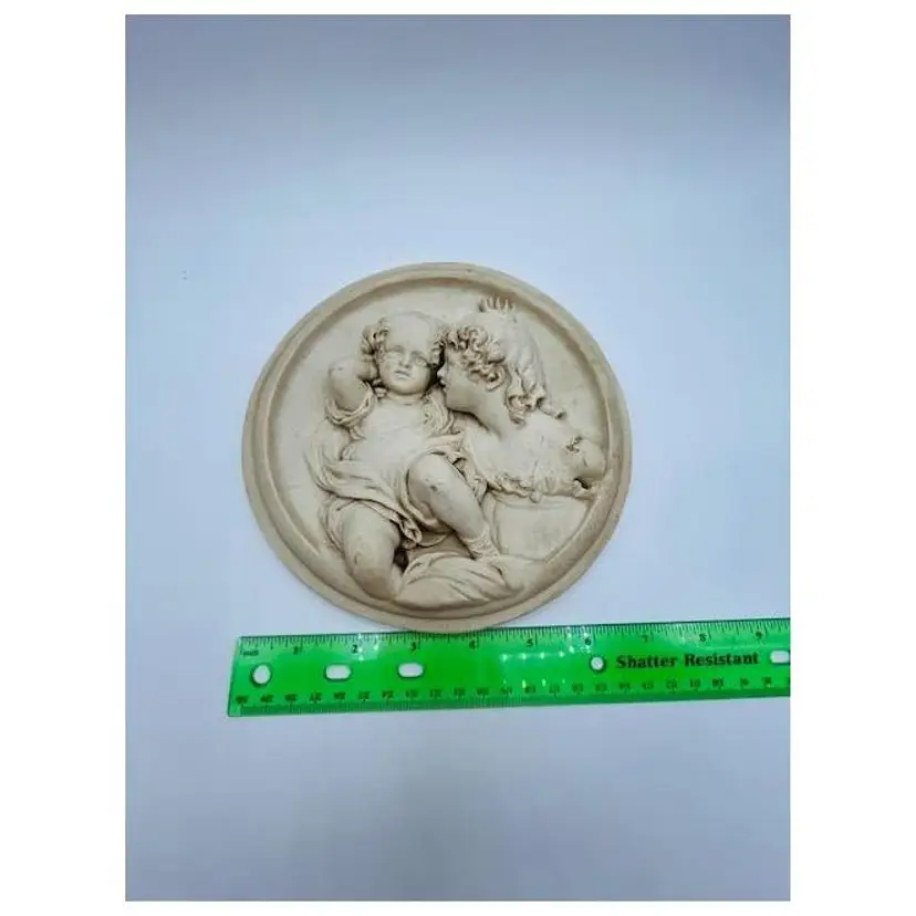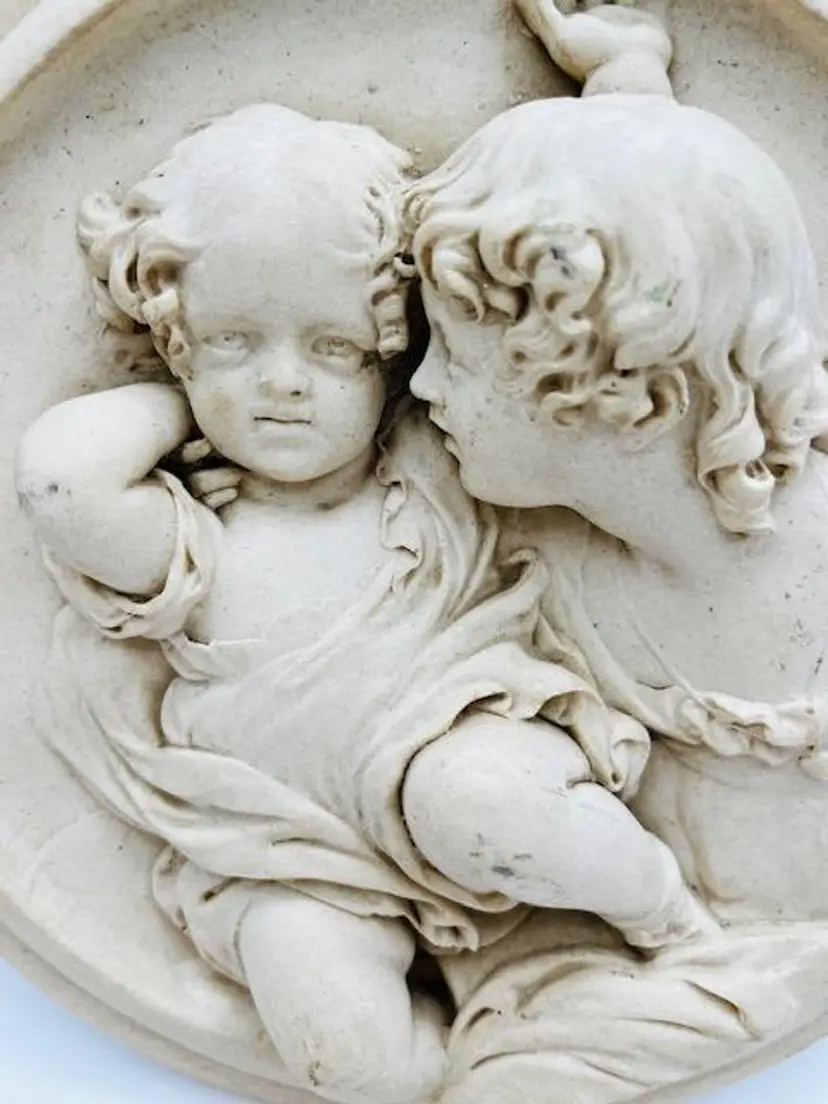 This is a stunning plaster and wax relief by Edward William Wyon, depicting the Calmady Children The piece showcases the beautiful features of the children and their innocence. The artist's signature is hard to read but the date June 1848 is the clearest portion of the signature. On the back is an original wax seal. A modern hanger has been added to the back of the piece. It is a perfect addition to any art collection, especially for those who appreciate sculptures that capture the essence of humanity.