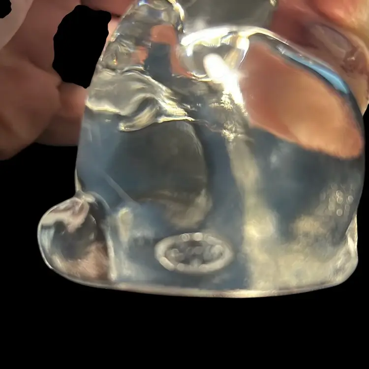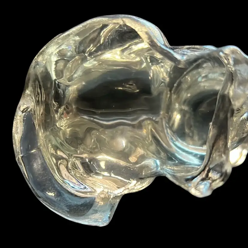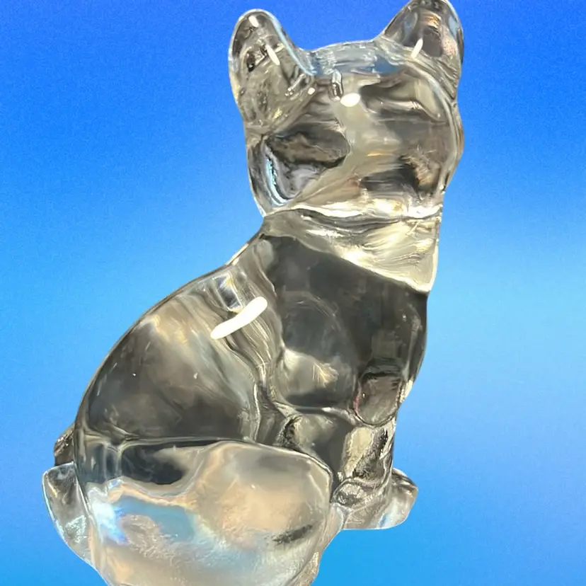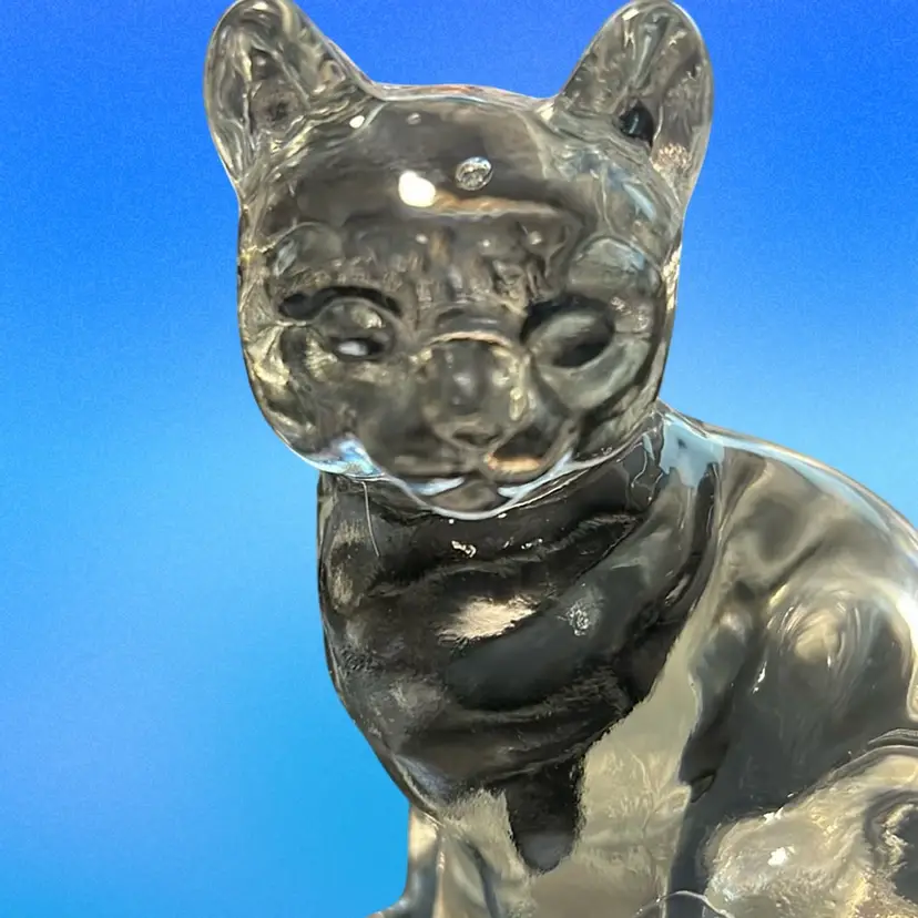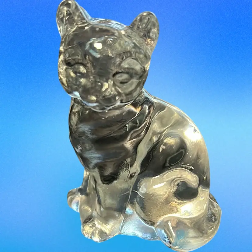A clear crystal glass crouching cat figurine by Fenton Art Glass. Stamped Undecorated, Stamped, 3.5” Tall