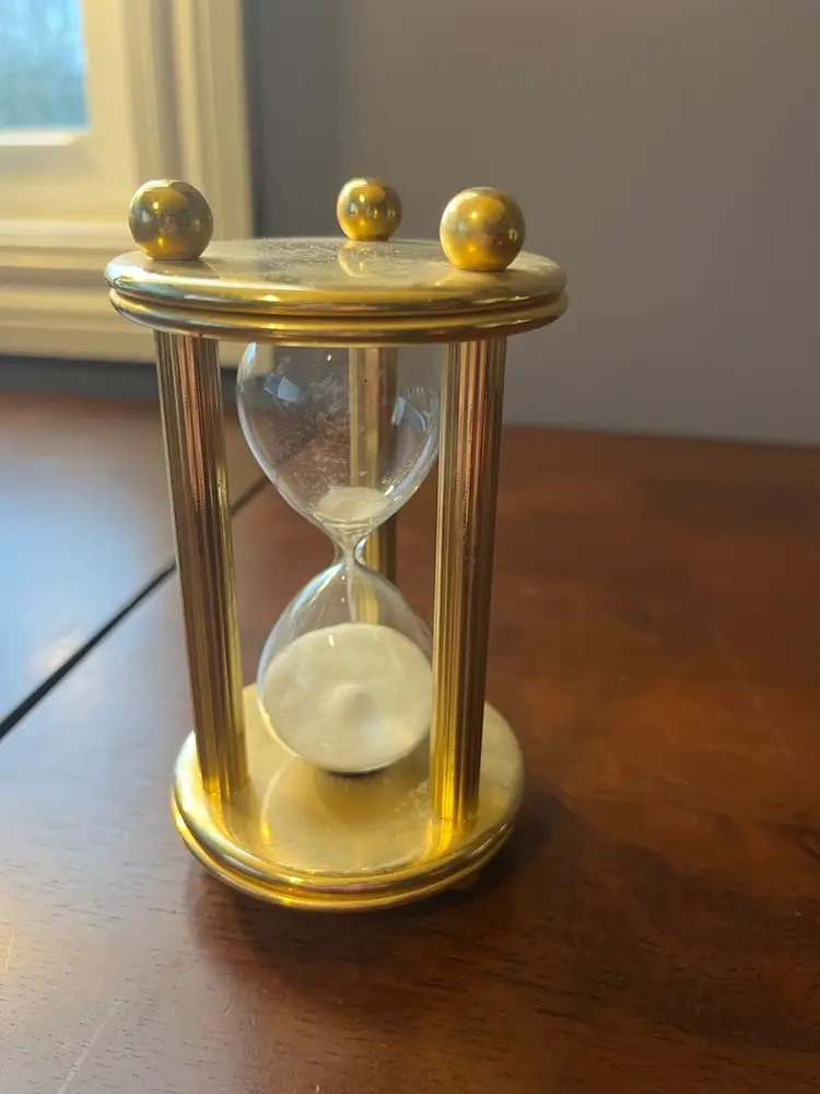 This particular hourglass appears to be made of brass and glass, with a decorative top. While not an antique in the strictest sense, such items often evoke a vintage aesthetic and are popular as decorative pieces or for light timekeeping tasks. The design with the decorative spheres on top is a common feature in many decorative hourglasses produced in the latter half of the 20th century. Inscription 1997 Rhodes Columbus Day Sale