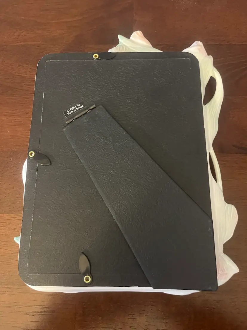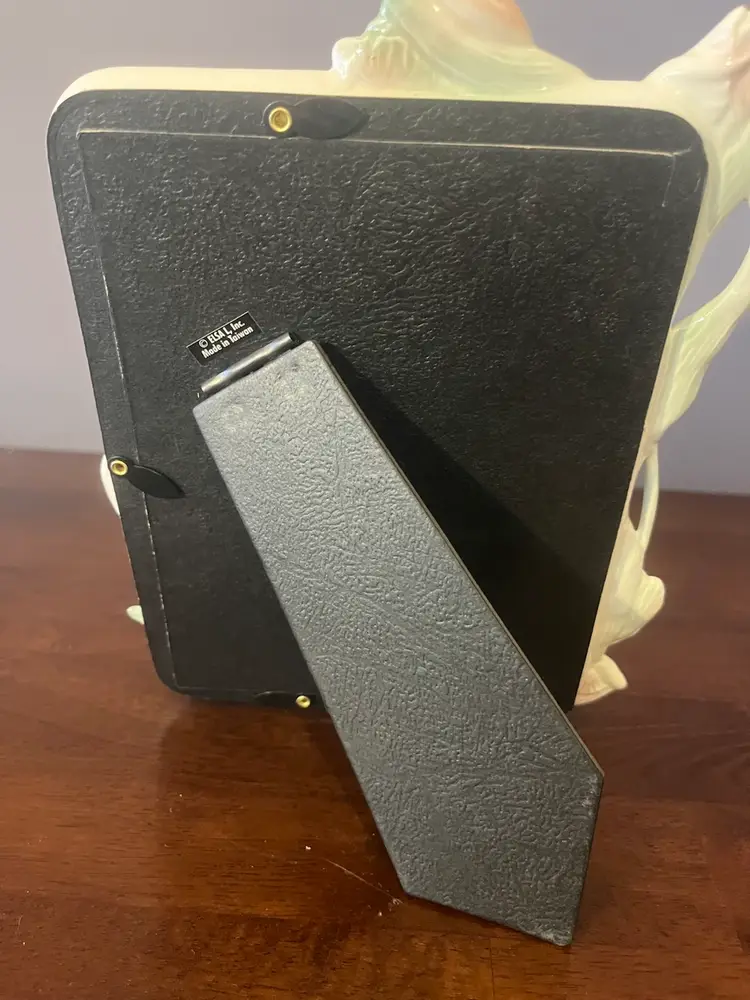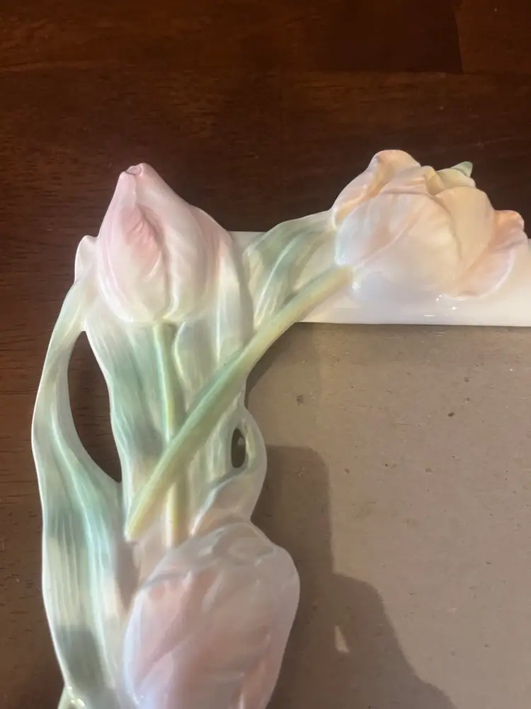 This particular frame features a floral motif, specifically tulips, which have been a recurring theme in decorative arts due to their symbolic meanings of love and beauty. The style suggests a more contemporary interpretation, likely from the late 20th century, where such decorative porcelain items were widely produced for the mass market.