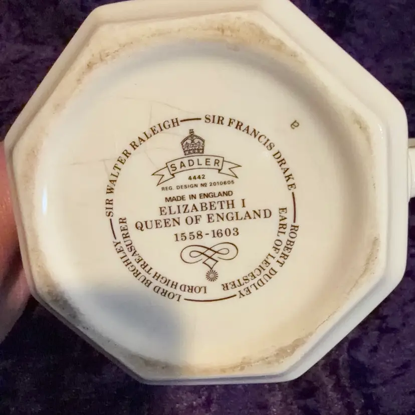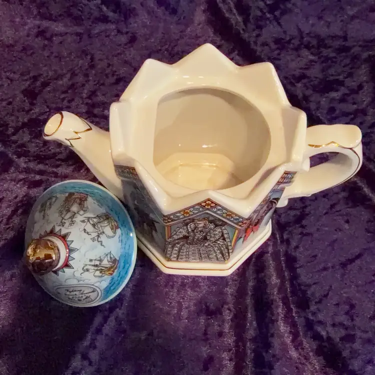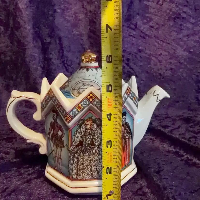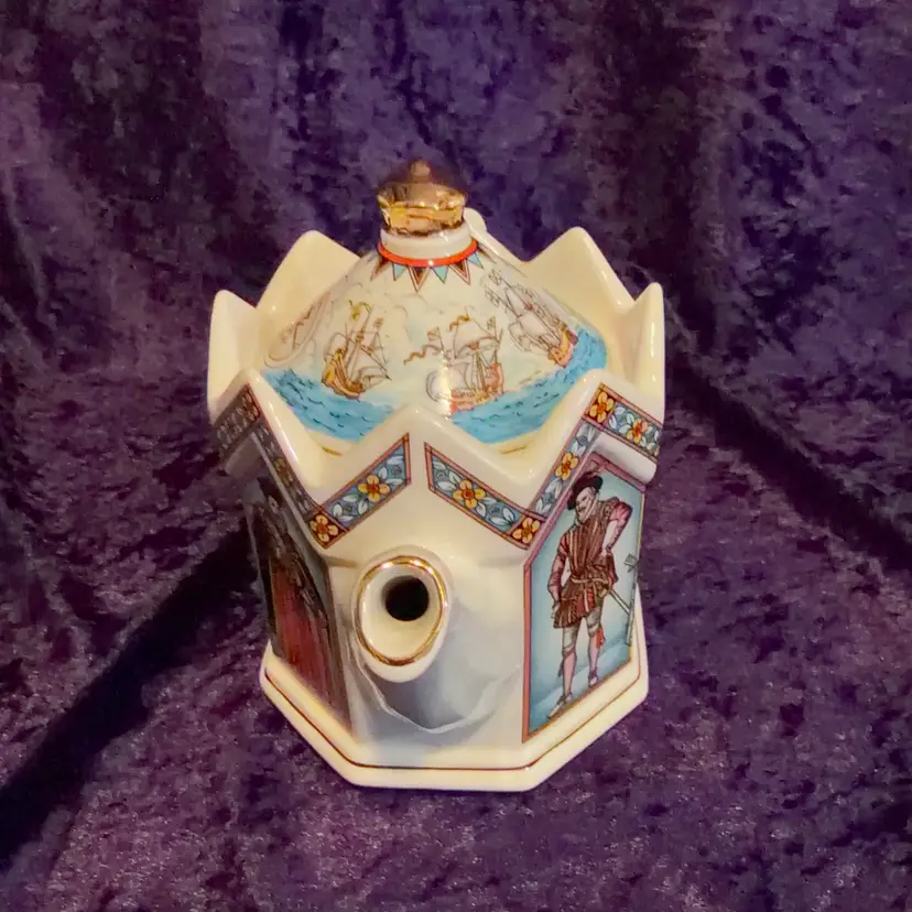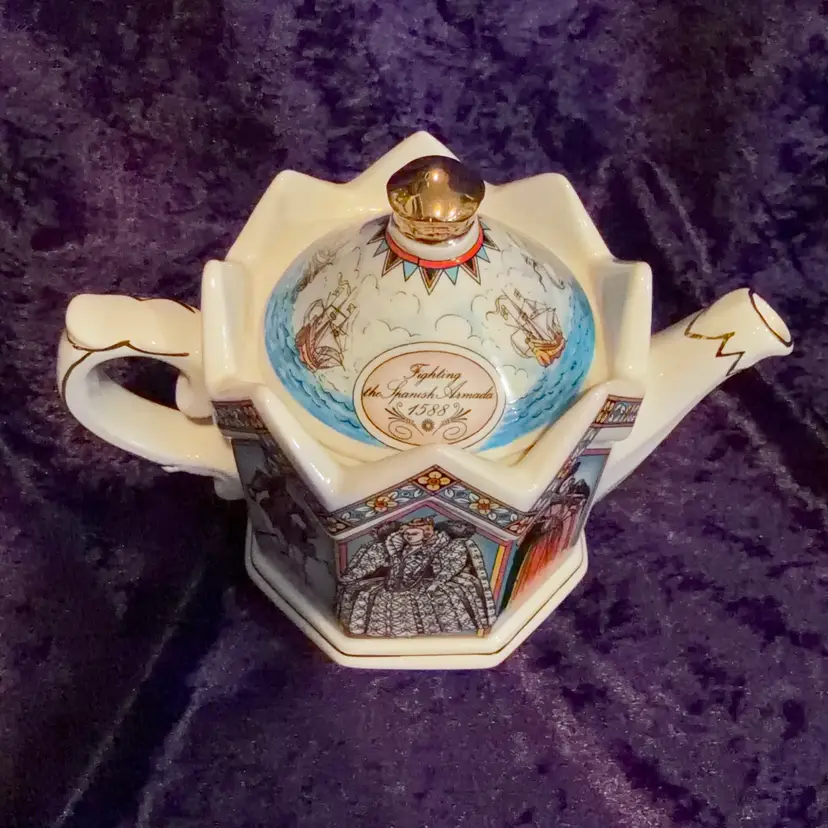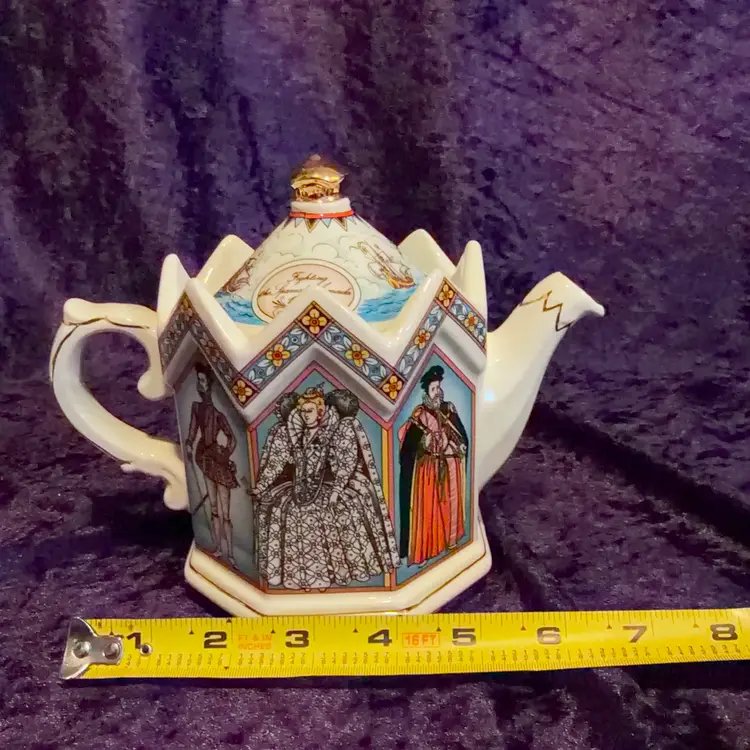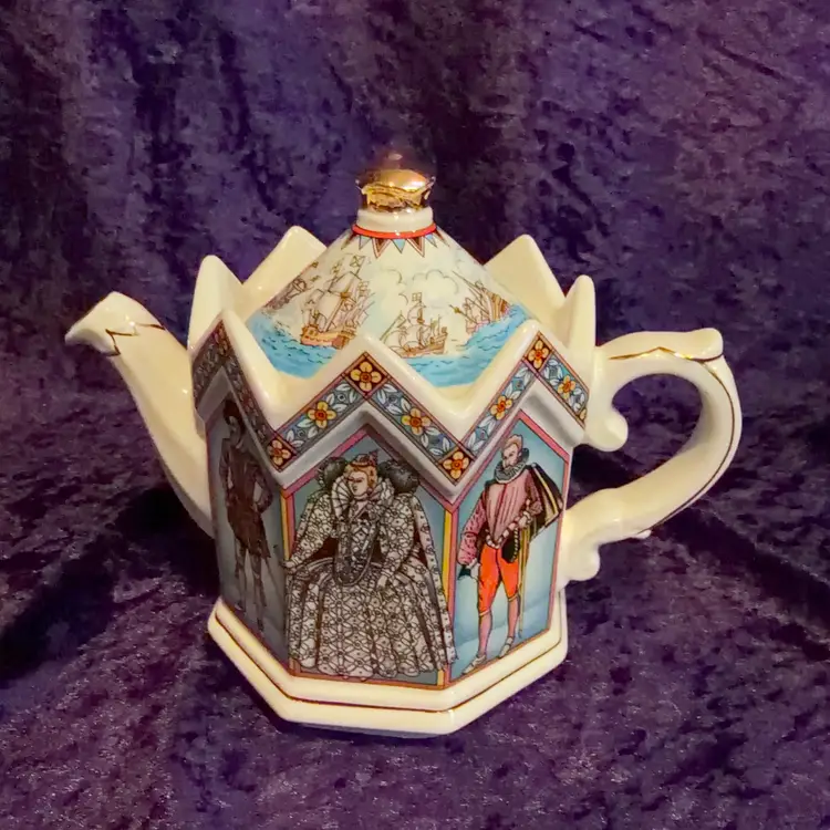 A decorative Vintage James Sadler 'Elizabeth I Queen of England' teapot, Featuring Queen Elizabeth I and Prominent figures from her reign.