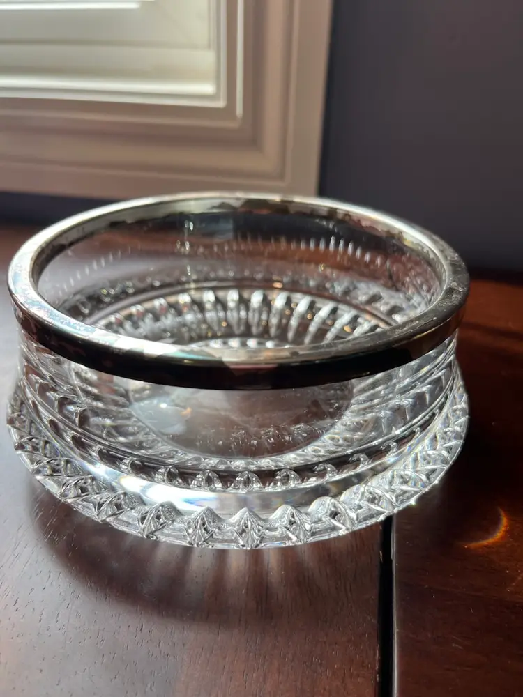 Crystal serving bowls with silver rims have been popular decorative and functional items for centuries, often used for serving fruits, desserts, or as centerpieces. The combination of cut crystal and precious metal rims signifies a level of luxury and craftsmanship, typically associated with fine dining and special occasions.
