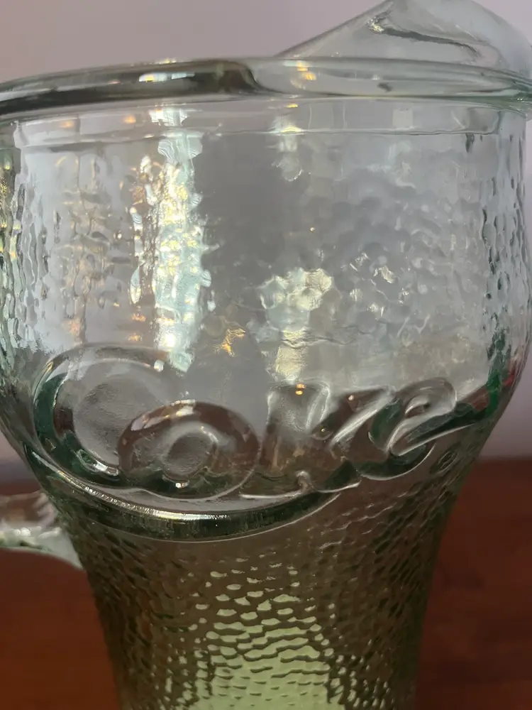 Coca-Cola has a long history of using branded merchandise to promote its iconic beverage, with glass items being particularly popular among collectors. These pitchers were often distributed as promotional items or sold as collectibles, featuring the distinctive Coca-Cola script logo. The pebbled texture and green glass are characteristic of many Coca-Cola collectibles from the late 20th century.