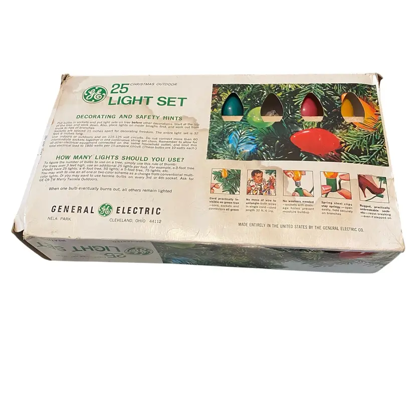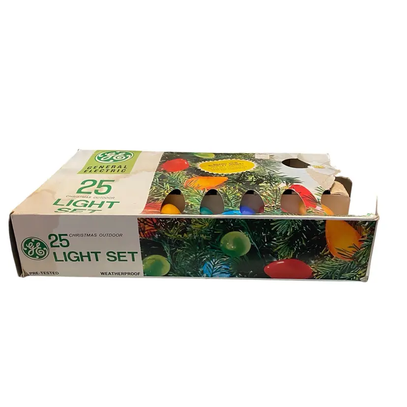 A in the box GE outdoor light set. This one was made around 1970-1972. General Electric 1970 outdoor Christmas light sets in box. Untested.