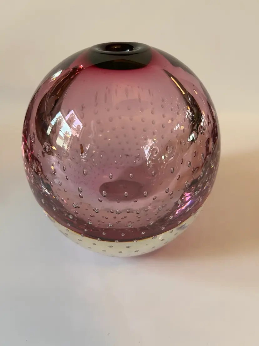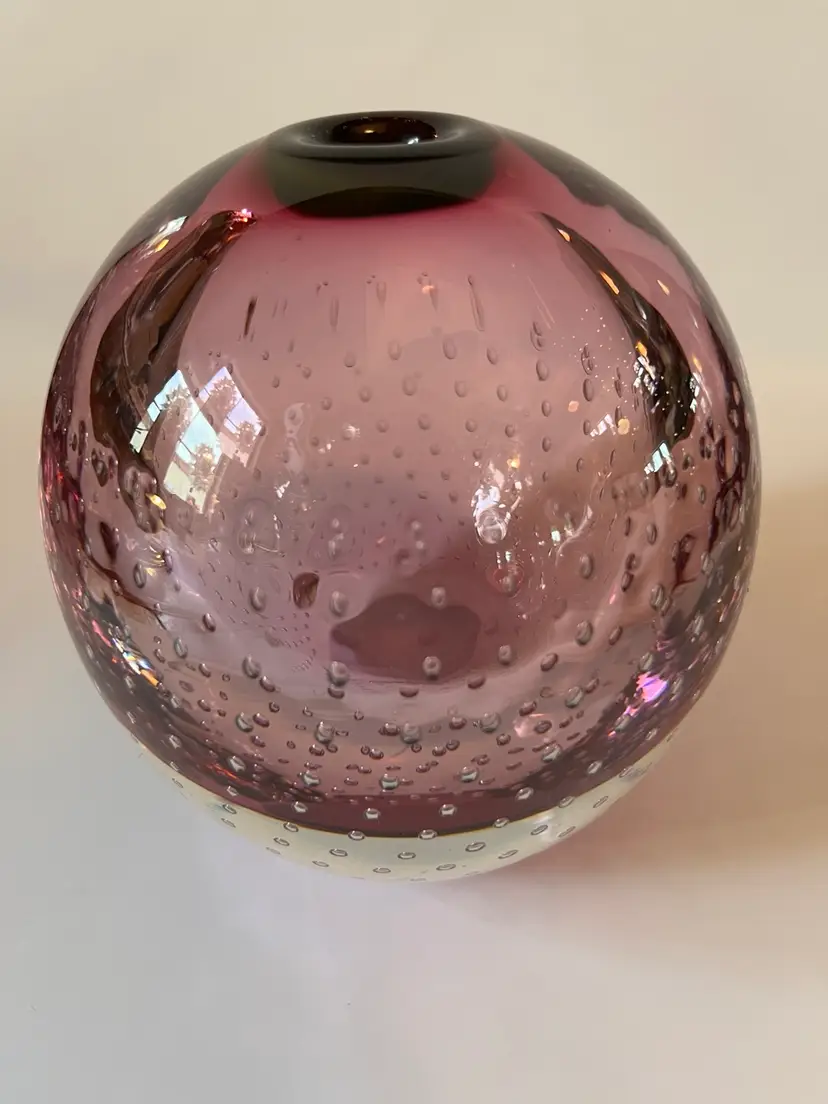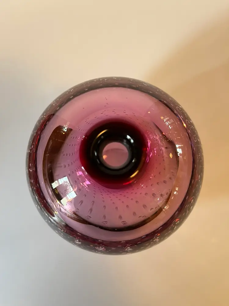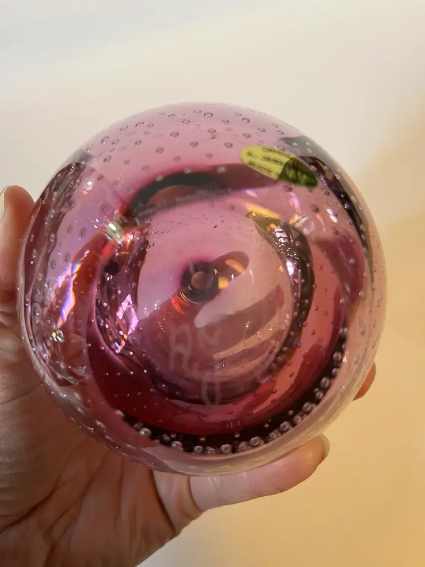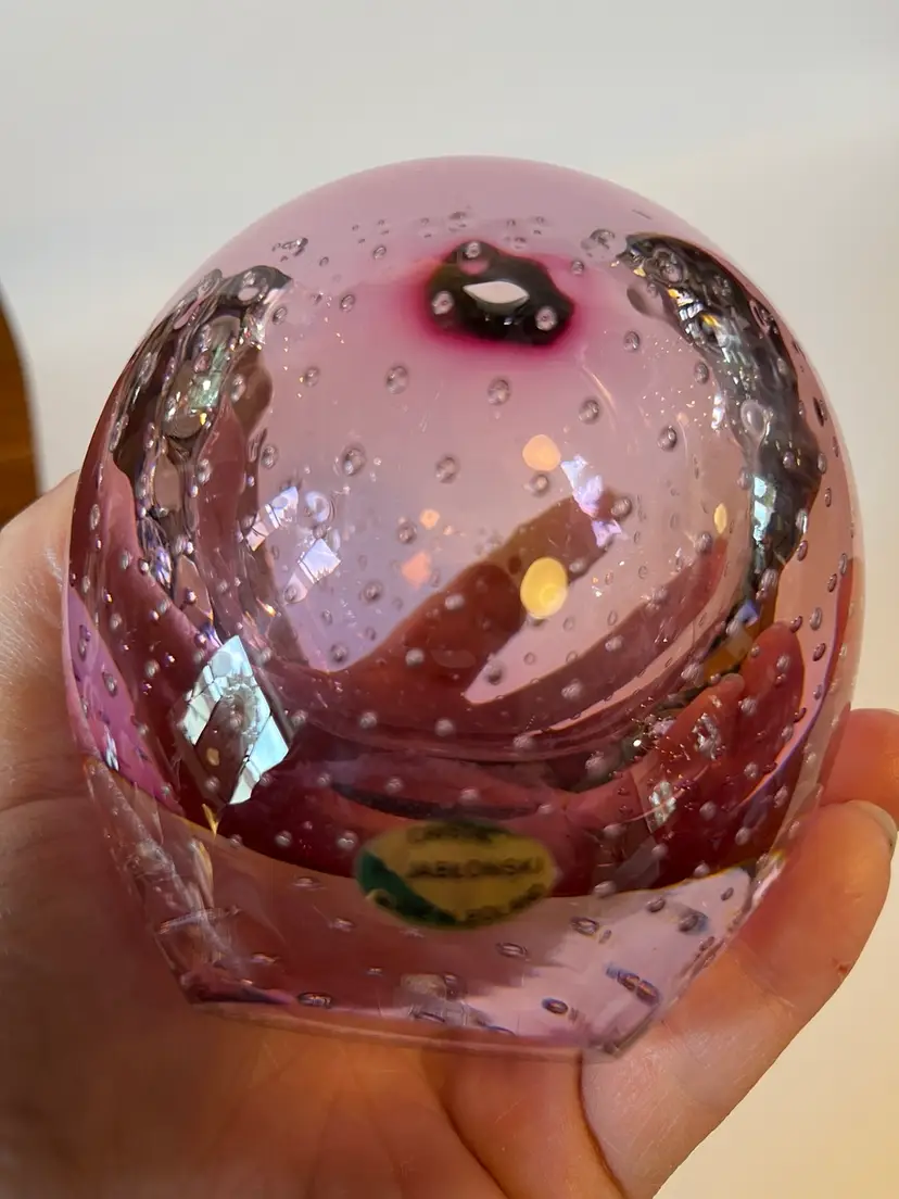 This is a beautiful paperweight bud vase. The primary color is a magenta. It has bubbles throughout and an opening on the top for putting in a flower bud. The bottom is signed with the initials AJ and it has the original sticker on it that says “Crystal A. Jablonski made in Poland”. This piece is in very good condition.