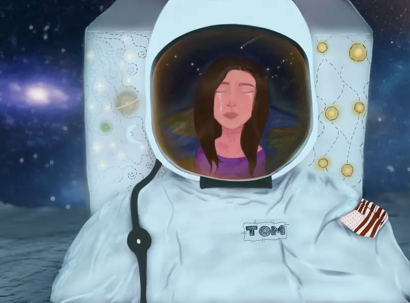 In this emotionally rich digital painting, an astronaut stands solemnly on the moon. Their helmet, instead of reflecting the lunar surface, reveals the sorrowful face of a woman back on Earth—her eyes closed, tears streaming, lost in memory or longing. Etched in the background of the helmet’s reflection is the curve of Earth, and delicately scattered across the night sky are glowing zodiac constellations, evoking cosmic fate, timeless love, or perhaps a destiny written in the stars.
