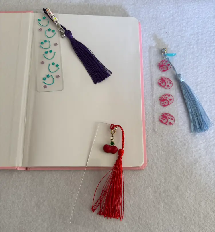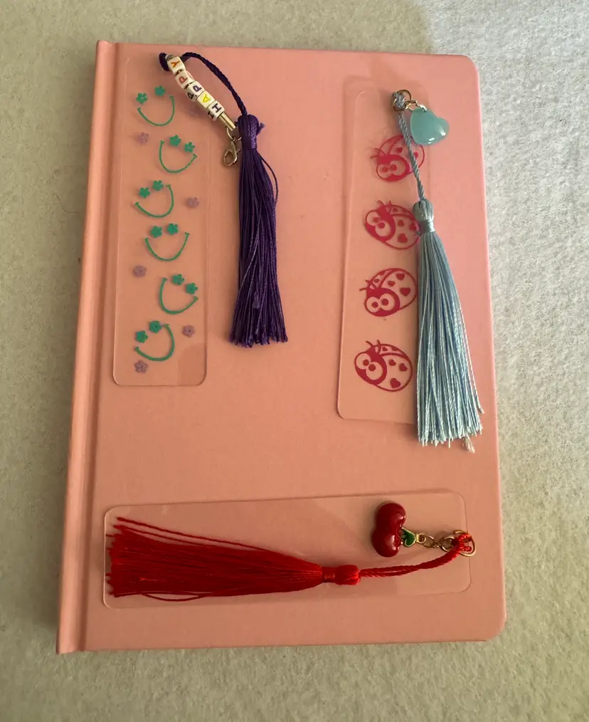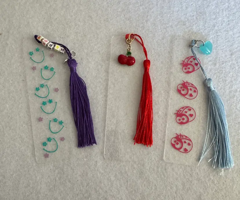 This is a mixture of bookmarks. Made out of plastic, some vinyl, with charms and a tassel.