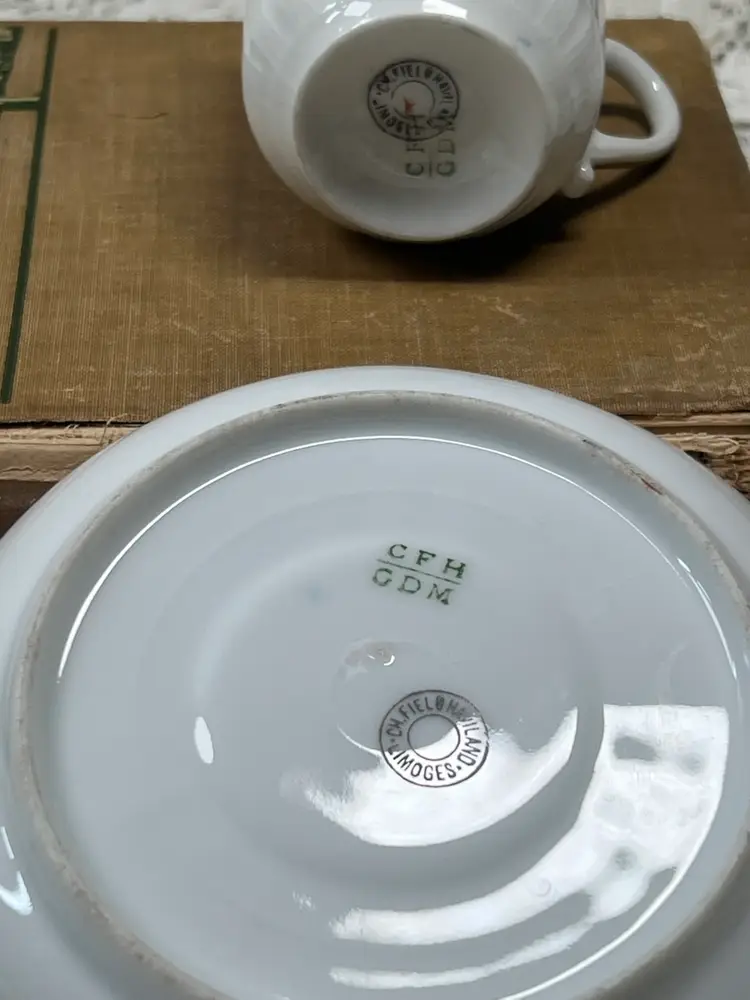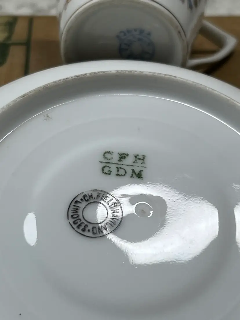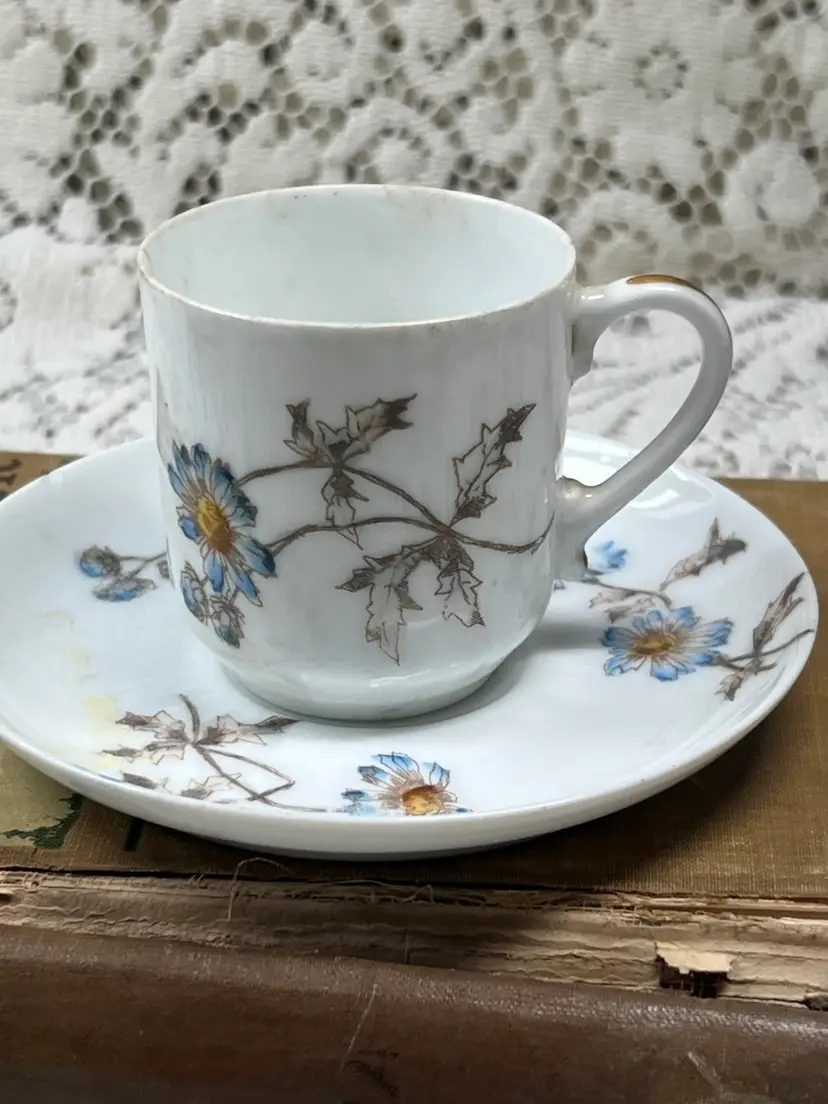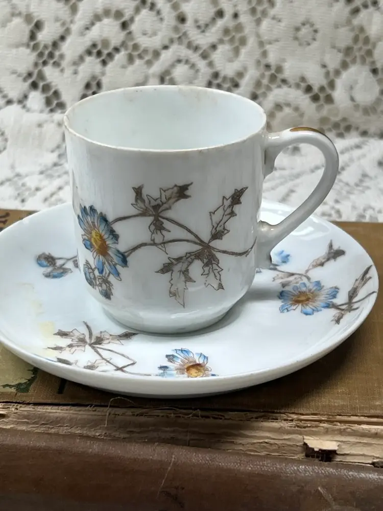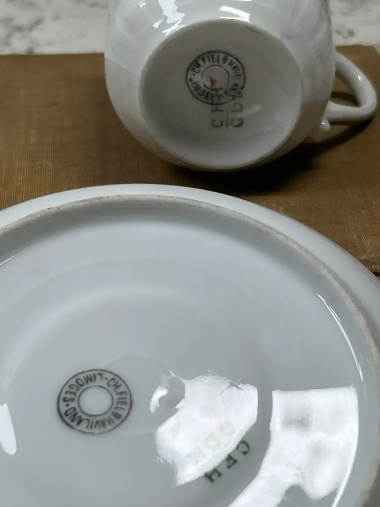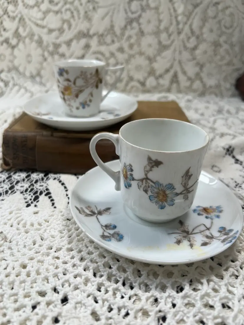 A Pair Of French Limoges Espresso, Cups, And Saucers One Saucers, Chipped