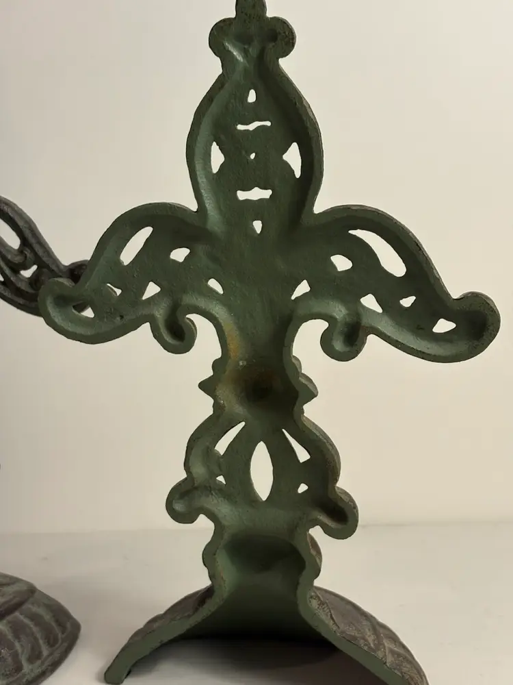 This listing features a pair of vintage Fleur De Lis cast iron bookends or doorstop. Handmade from durable cast iron, these bookends showcase intricate Fleur De Lis designs, adding a touch of elegance to any bookshelf or doorstep. Perfect for collectors of metalware or vintage decor, these unique pieces are sure to make a statement in any home.